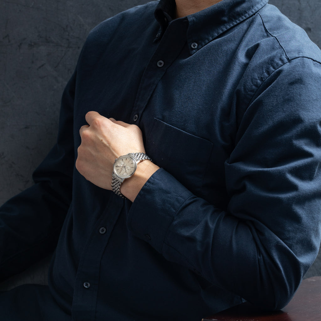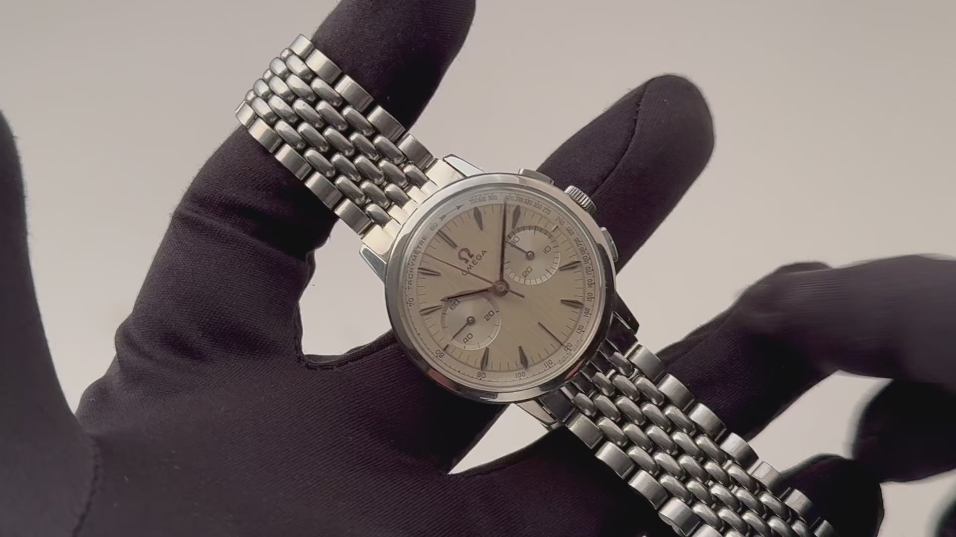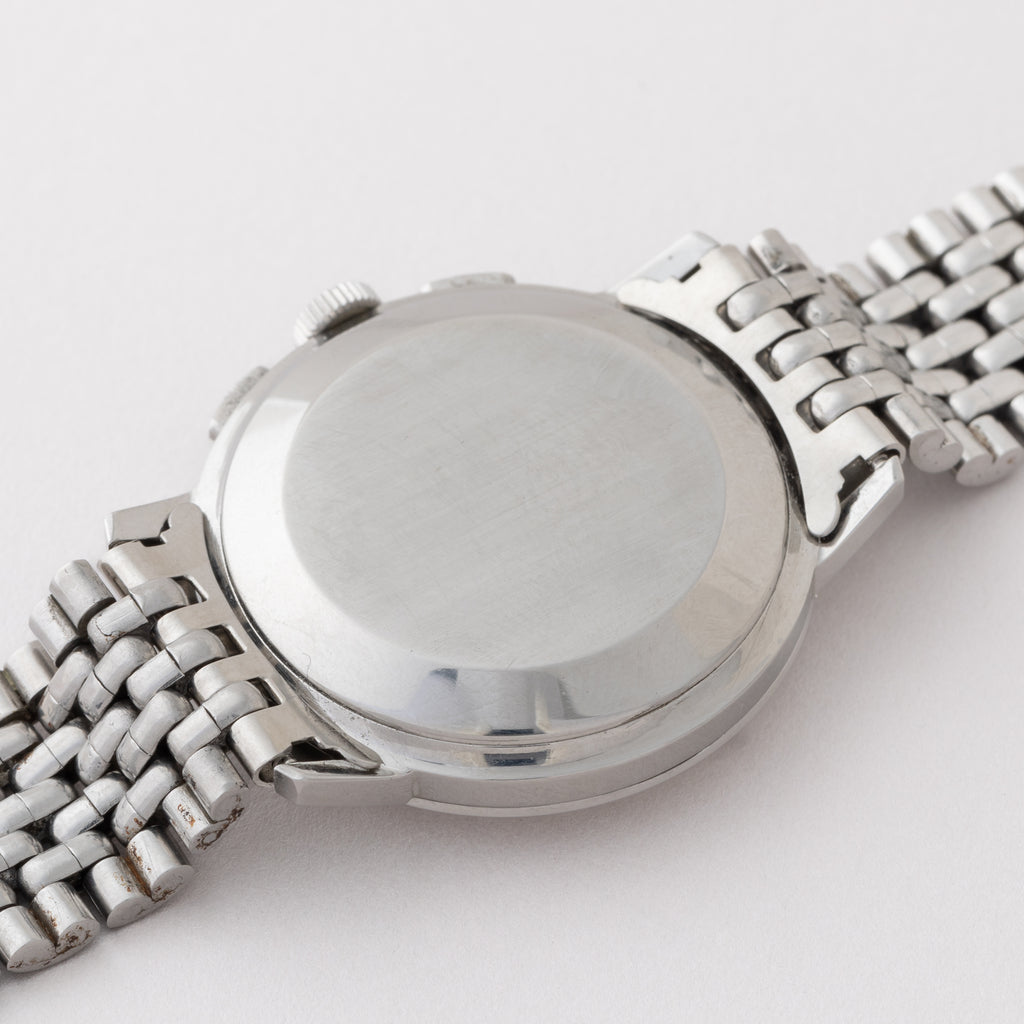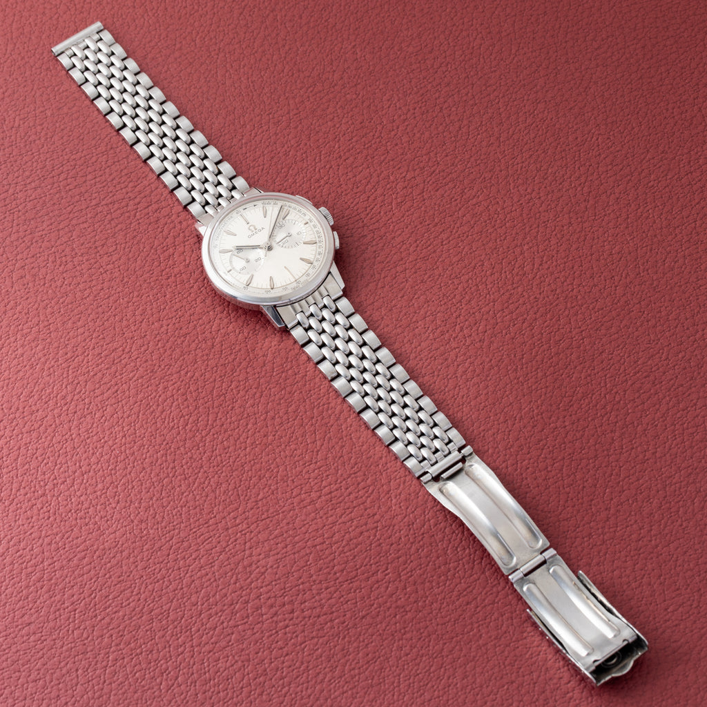 1966年に製造されたCal.320搭載のクロノグラフが入荷しました。ヘアラインの入るシルバーダイヤルは、クサビのニュアンスが残るインデックスにバトンハンドを組み合わせ、外周をタキメーターが囲みます。ケースは過度な磨きや大きなダメージはありません。 ムーブメントはスピードマスターに搭載されたCal.321の二つ目仕様であるCal.320を搭載、コッパーメッキが維持されて良好な状態です。ベルトは純正のライスブレスが装着されています。こちらOH済みです。