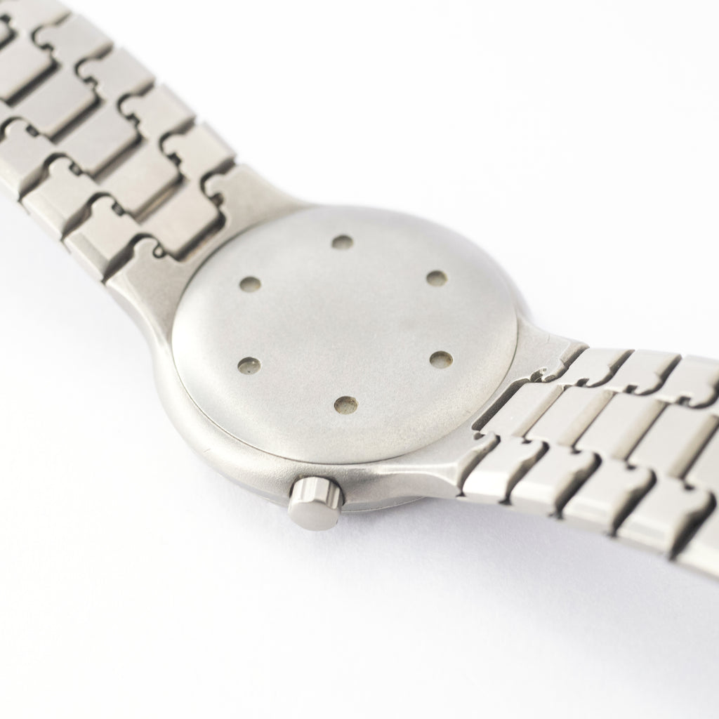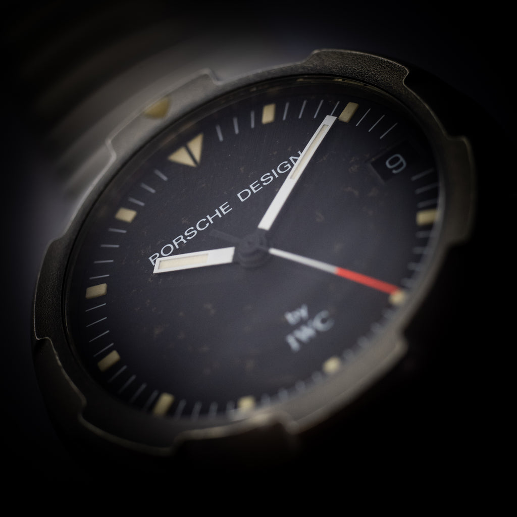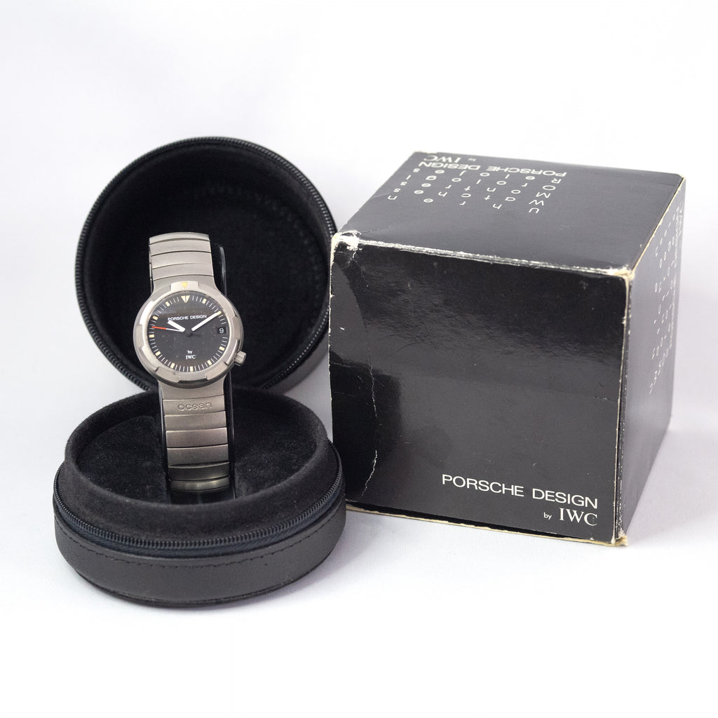 名車ポルシェ911をデザインしたF.A.ポルシェ博士により設立されたポルシェデザイン。そこで世界で初めてチタンを素材にした時計が発表されましたが、その中の一つであるオーシャン500はコンパクトながらも500m防水という本格ダイバーズウオッチです。この時タッグを組んだのがIWCであり、この時のポルシェデザインの時計制作におけるこだわりが見て取れる1本です。文字盤や、外装には時代相応のダメージはありますが、リューズのねじ込みはしっかりしており、夜光のヤケも文字盤、針共に雰囲気良くエイジングしています。年々個体数が減ってきているモデルですが、箱付きは更に希少になってきています。