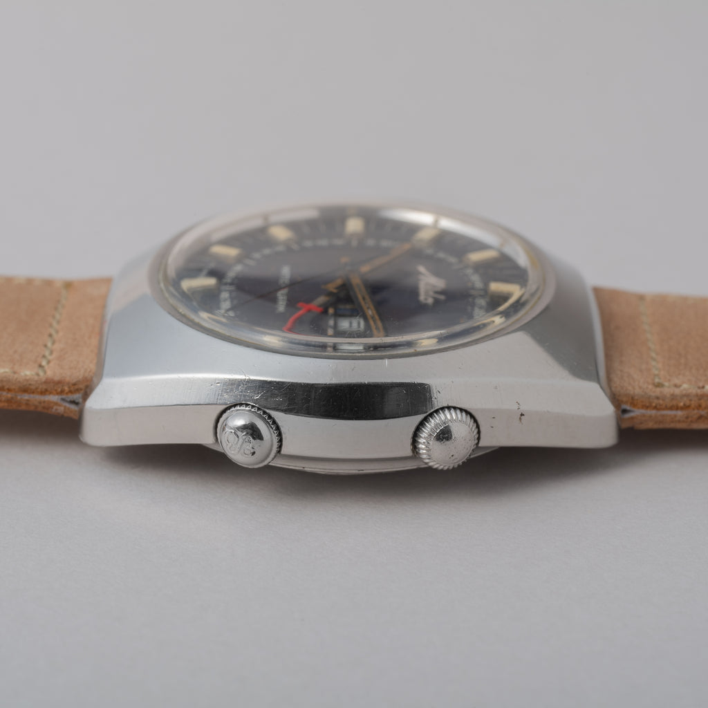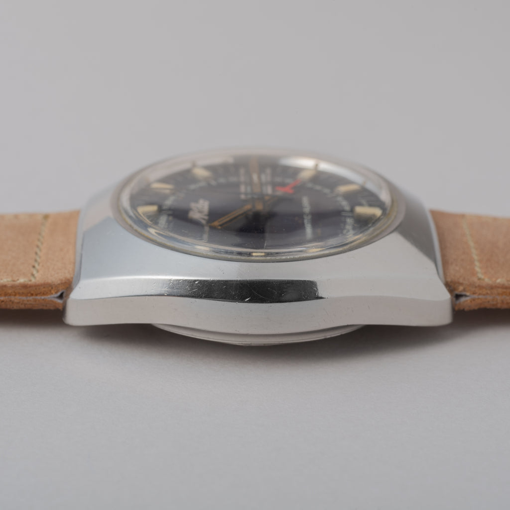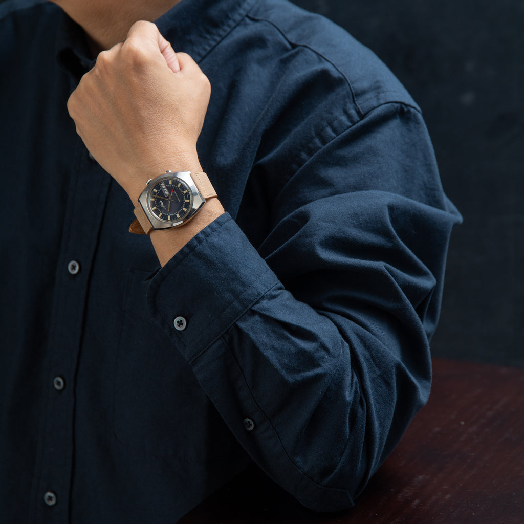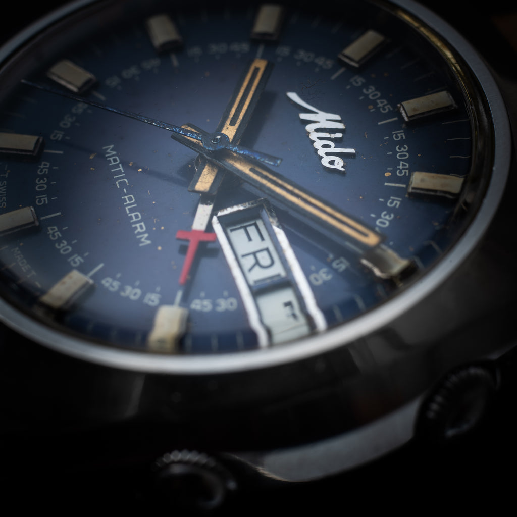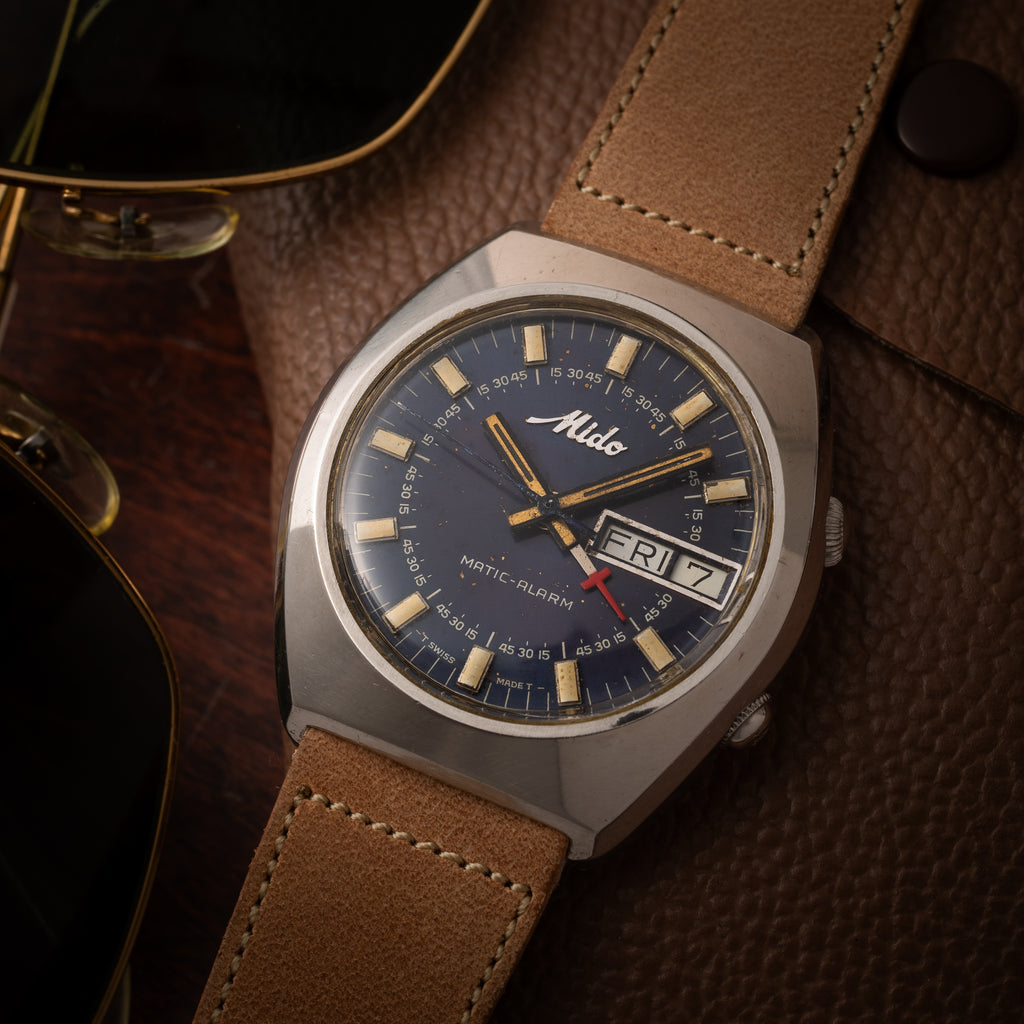 1960年代のミドー アラーム オートマチックモデルです。特徴的なブルーの文字盤は年代なりの経年はございますが、エイジング具合が絶妙でまるで星空を見ているような気分にさせてくれます。赤い針がアラーム針で、4時位置のリューズで設定を行うことができ、2時位置のリューズは時刻合わせの際に使用します。ムーブメントはアシールド社の自動巻きCal.AS5008を搭載。手巻きや針回しの操作はスムースです。ヴィンテージモデルに相性抜群な「Accurate Form(アキュレイトフォルム)」のレザーベルトを装着しています。