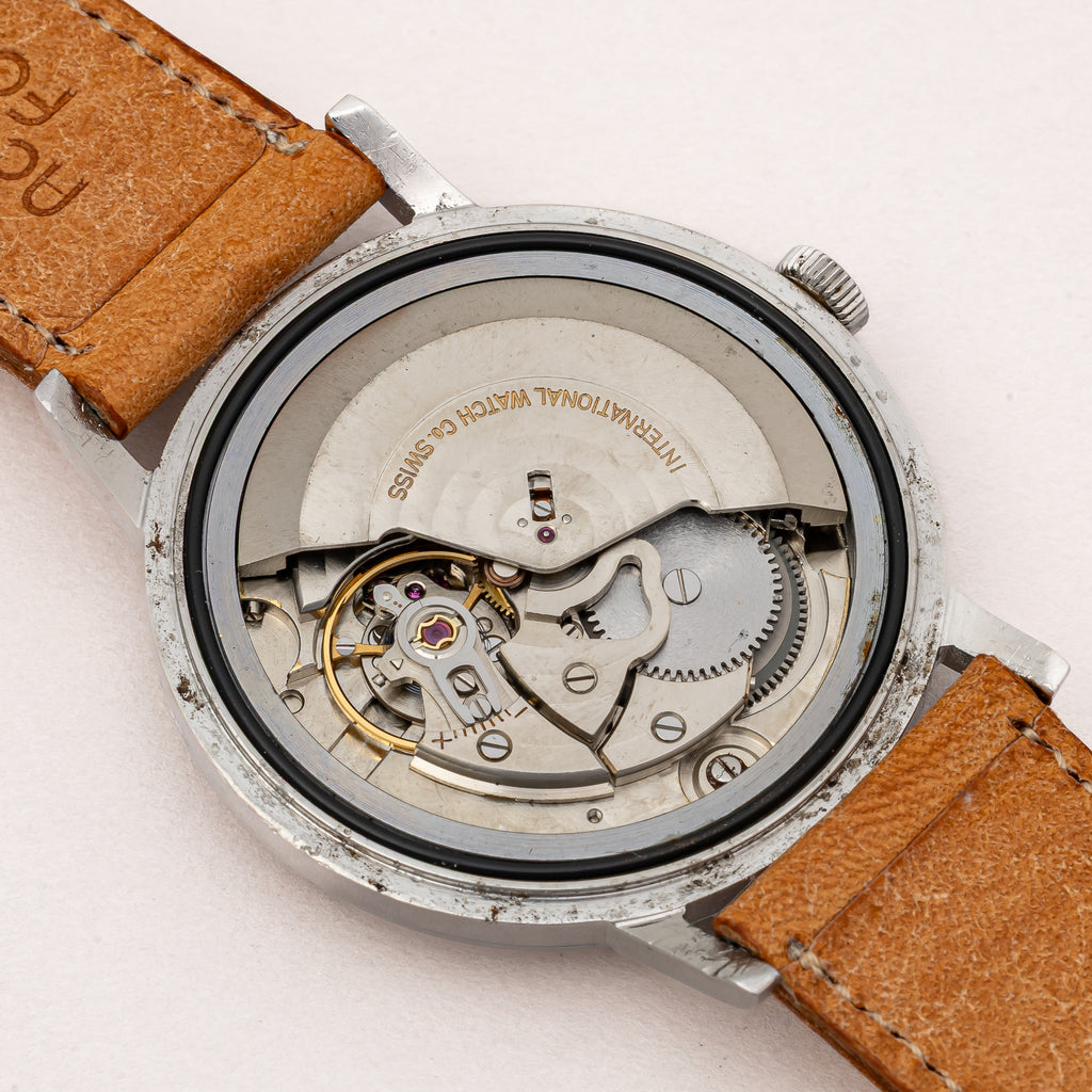 インターナショナルウオッチカンパニーの1964年製自動巻きラウンドケースです。ペラトン式自動巻きの完成形Cal.8541を搭載したモデルでオールドインターらしいシンプルな質実剛健なモデルです。シンプルだからこそ造りの良さが感じられます。文字盤、ケース共に大きなダメージはありません。ベルトはアキュレイトフォルムの革ベルトを合わせています。こちらは分解掃除済みです。