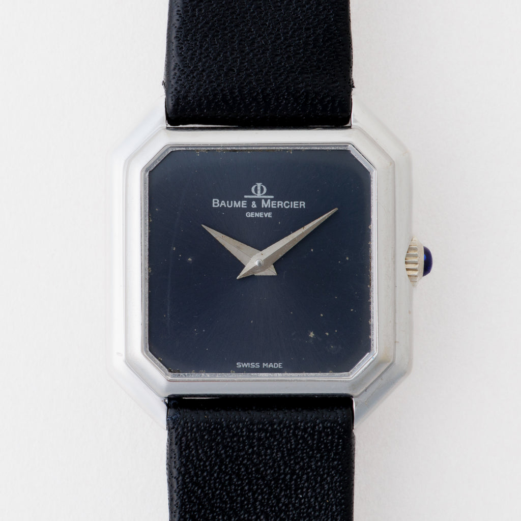 ボーム&メルシエ レディース 18金無垢ホワイトゴールド オクタゴンケース 1980年代製 手巻きです。18金無垢ホワイトゴールドケースに上品な深みのあるブルーダイヤルは紫色にも見えます。ケースは小傷が見られますが大きなダメージはありません。手巻きや針回しの操作はスムースです。ベルトは社外のカーフが取り付けられています。