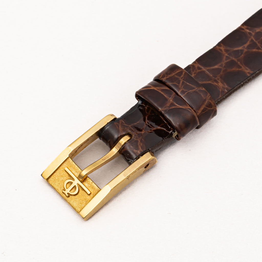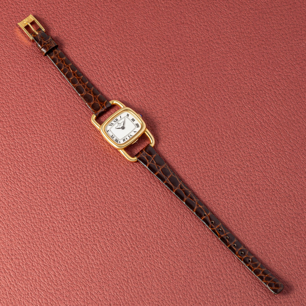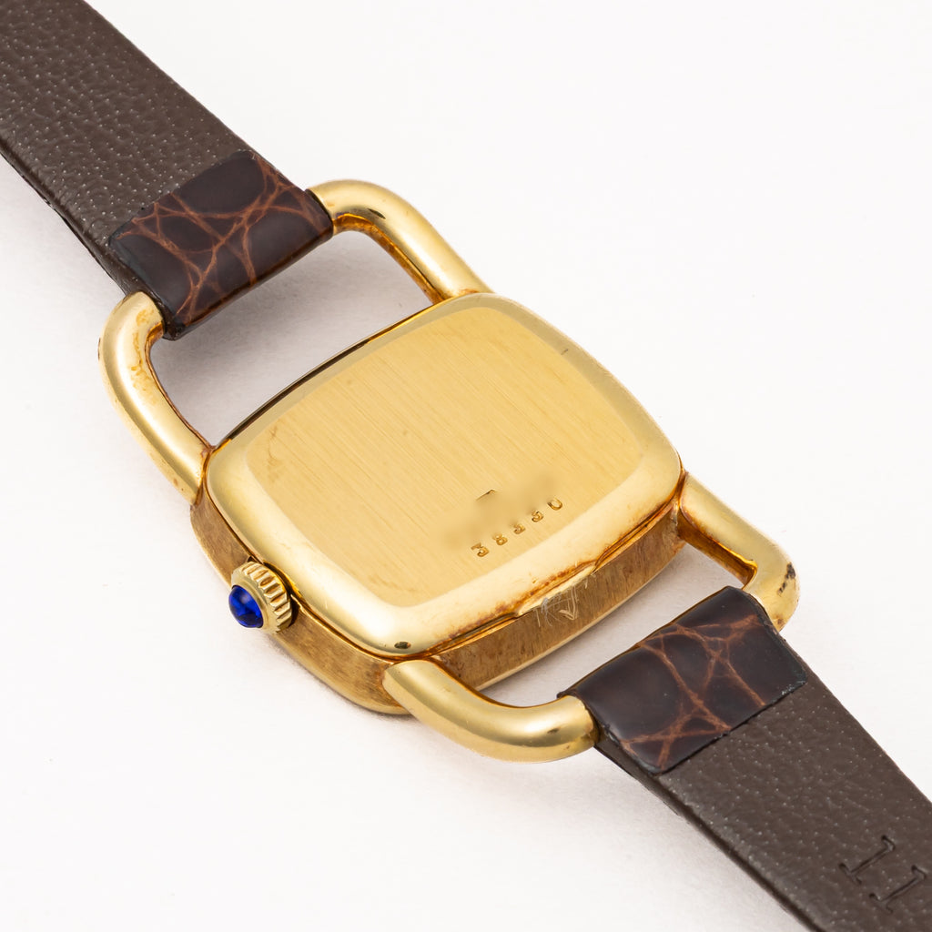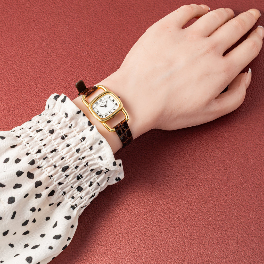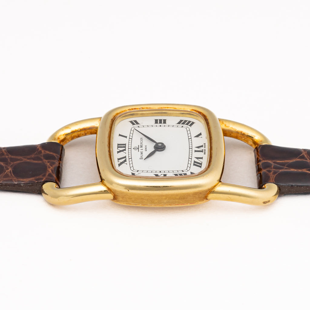 ボーム&メルシエ 1970年代製 18金無垢イエローゴールド エトリエデザイン  手巻き ホワイトローマンダイヤルです。ジャガールクルトがエルメスの依頼で製作したエトリエデザインです。18金無垢イエローゴールドケースにホワイトローマンダイヤルは上品で優美な印象になります。文字盤6時位置に僅かなひび割れが見られますが全体的には綺麗です。ケースは小傷が見られますが大きなダメージはありません。手巻きや針回しの操作はスムースです。革ベルトは社外のクロコダイルが取り付けられています。