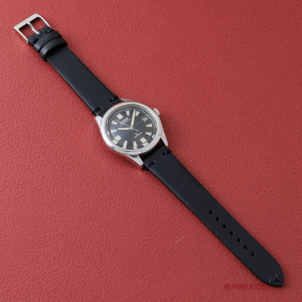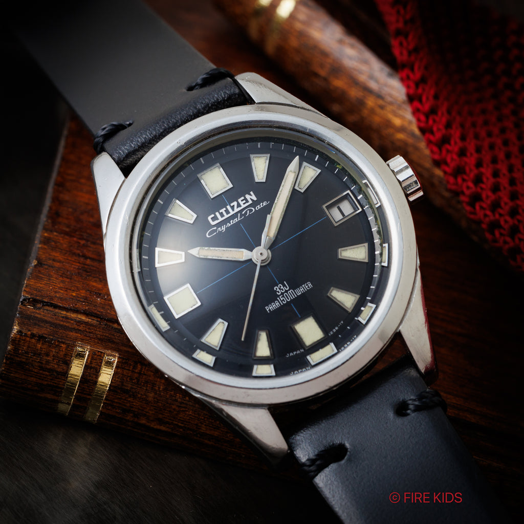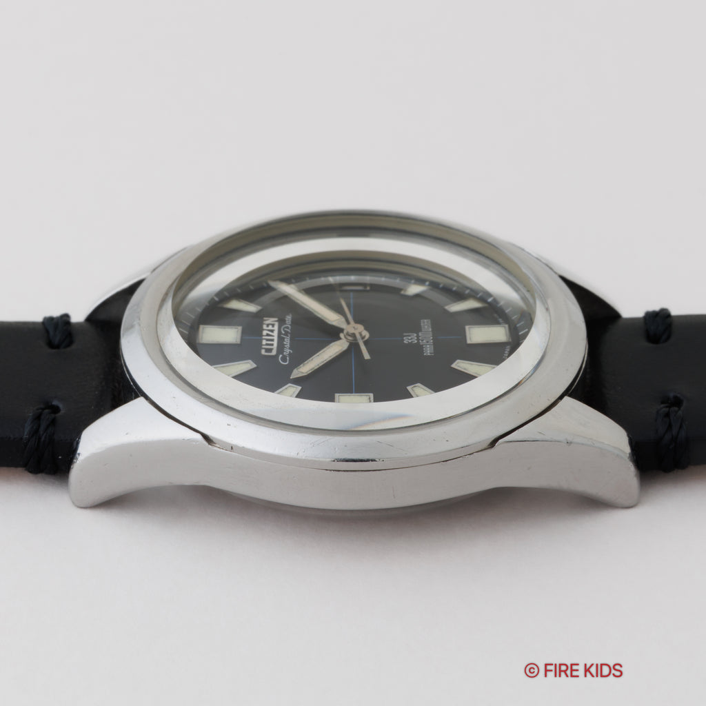 シチズン クリスタルデイト 150m防水  1967年製 Ref.52801-Y ブラックダイヤルの入荷になります。33石の高級タイプの自動巻でクリスタルガラスを採用した150mの本格防水モデルとして販売されたクリスタルデイトです。分厚いクリスタルガラスは色々な角度で見たくなる立体感になっています。裏蓋にはジェット機のメダリオンが入っています。文字盤はシミ等無く綺麗です。ケースは小傷が見られますが大きなダメージはありません。手巻きや針回しの操作はスムースです。ベルトは社外のカーフが取り付けられています。