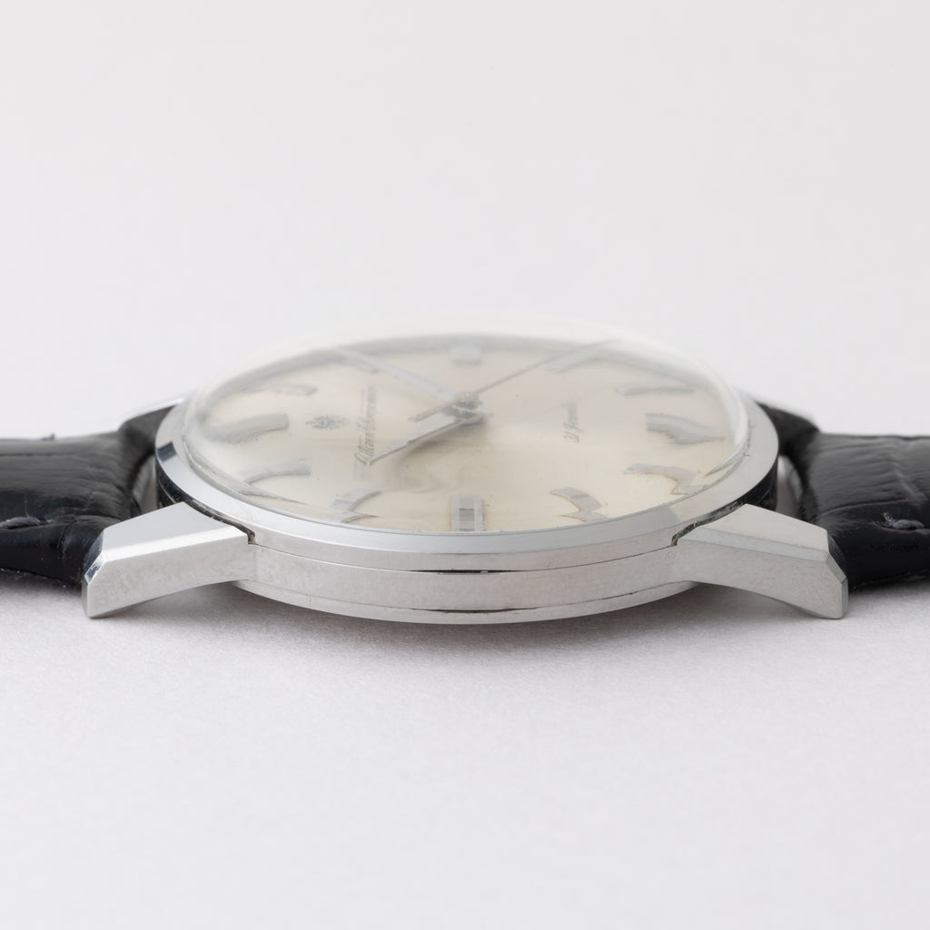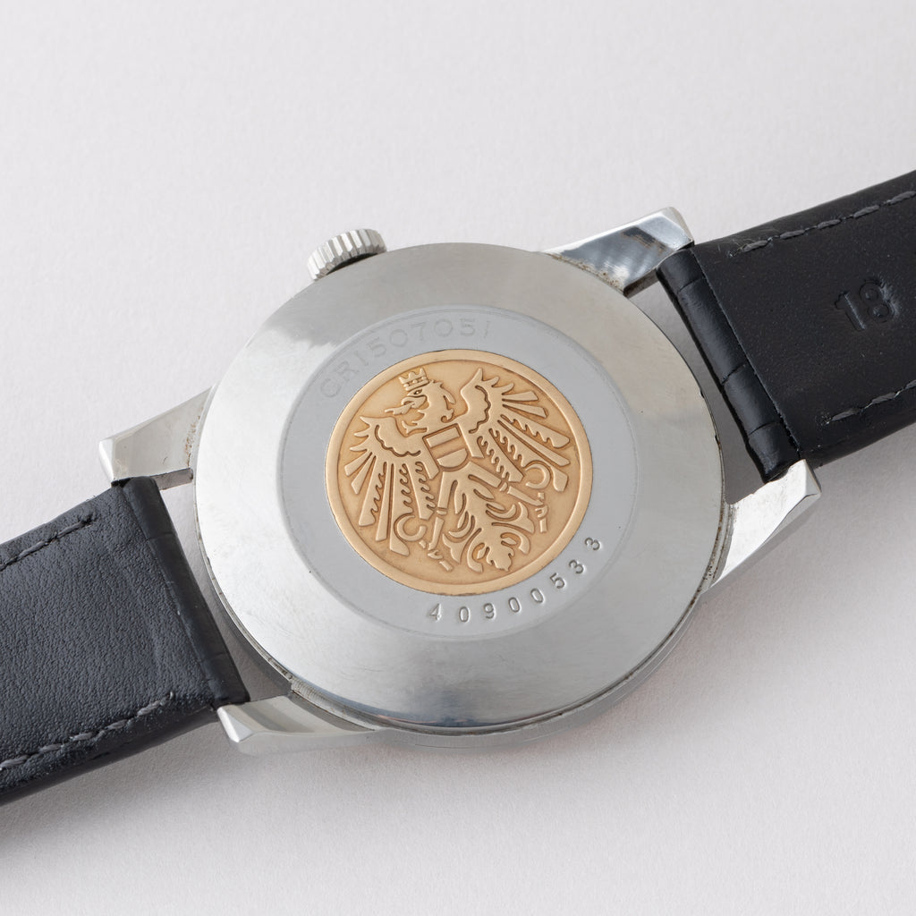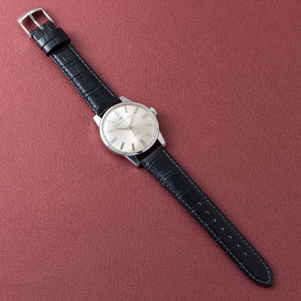 国産腕時計最高峰の一つと言われているシチズンの名機「クロノメーターCR1507051」1964年製です。 1962年から1966年までの約4年間のみ製造されたモデルで、採算を度外視して造られた為に短命になったと言われています。人気のステンレスケースで非常に美しい外観と精度を重視した大型ムーブメントは惚れ惚れとします。ケースは小傷が見られますが大きなダメージや腐食は見られません。メダリオンも綺麗に残っています。ベルトは社外の革ベルトが取り付けてあります。手巻きや針回しの操作はスムーズです。