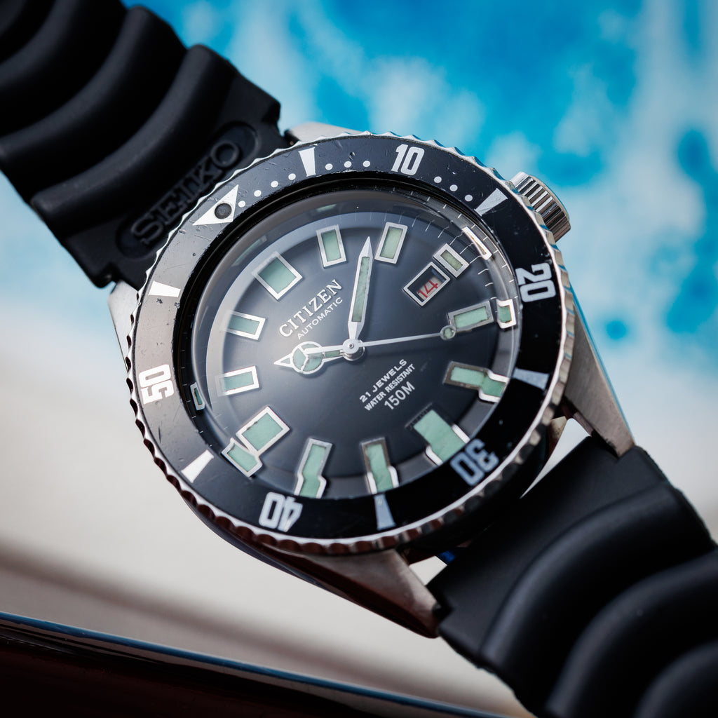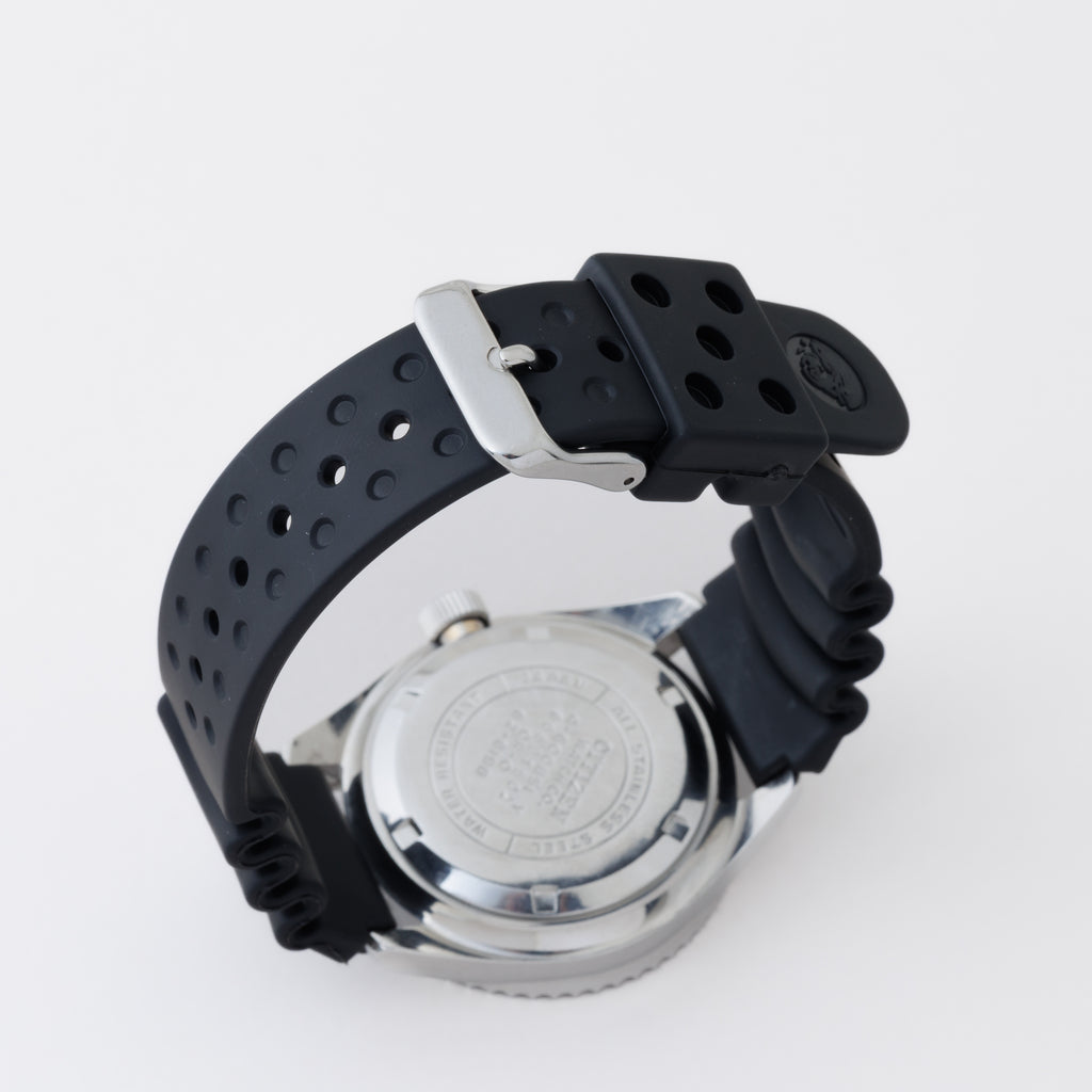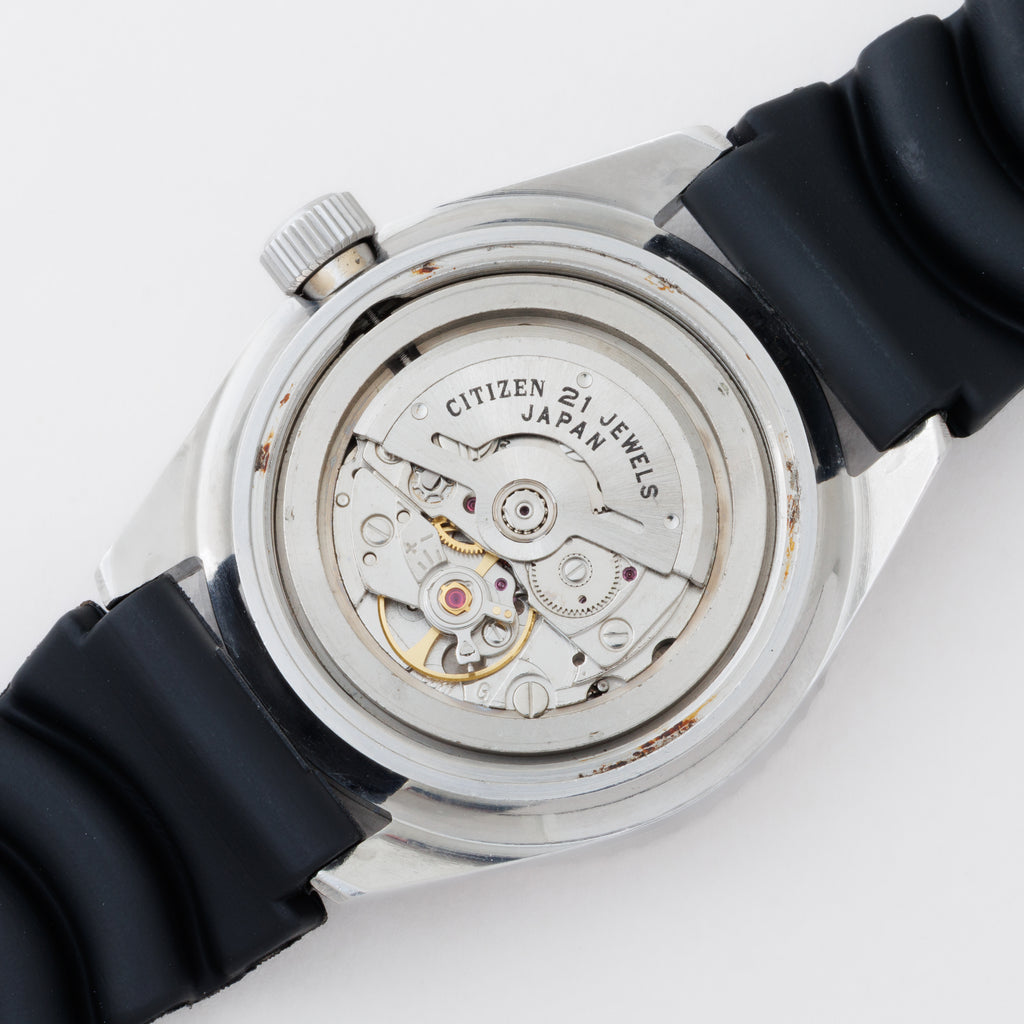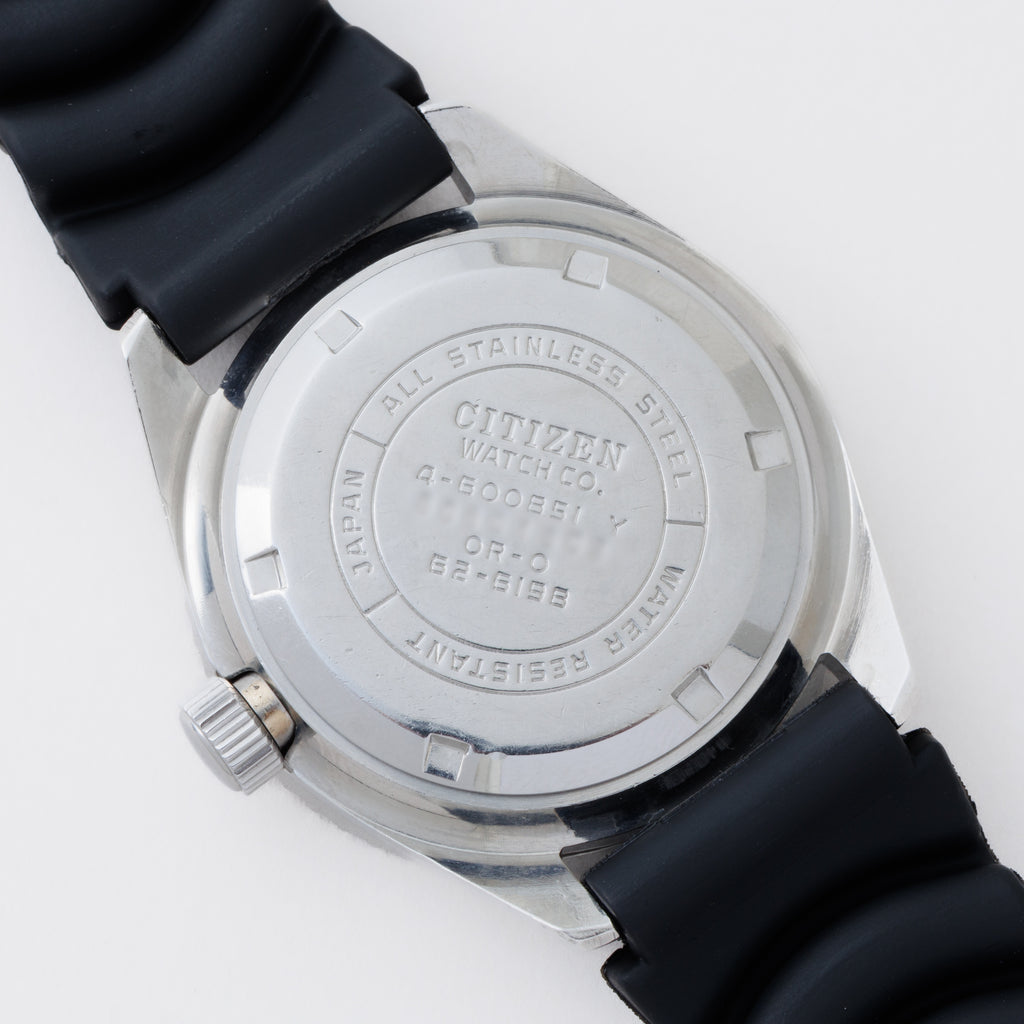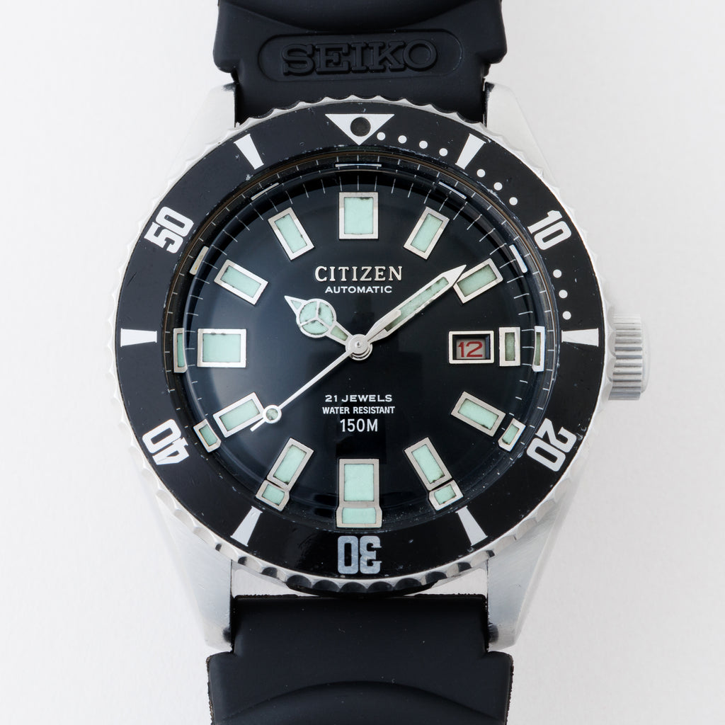 シチズン 150m チャレンジダイバー 1976年製 赤カレンダー 4‐600851Yです。シチズンの2代目のダイバーウォッチで同じ国産のセイコダイバーと比べると数が少なく、べンツ針や赤カレンダー、分厚いクリスタルガラス等が魅力的な時計です。ケースは小傷はございますが大きな傷はなく、ベゼルディスクは12時と11時の間に傷がございますが全体の雰囲気を損なうレベルではございません。セイコーのウレタンベルトが取り付けてあります。手巻きや針回し、ねじ込みリューズ、ベゼルの操作はスムースです。こちらの時計は分解掃除済みです。
