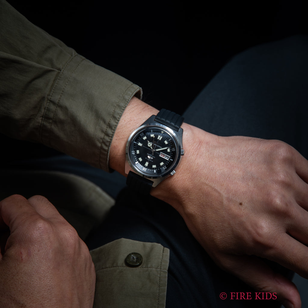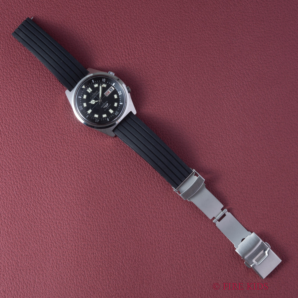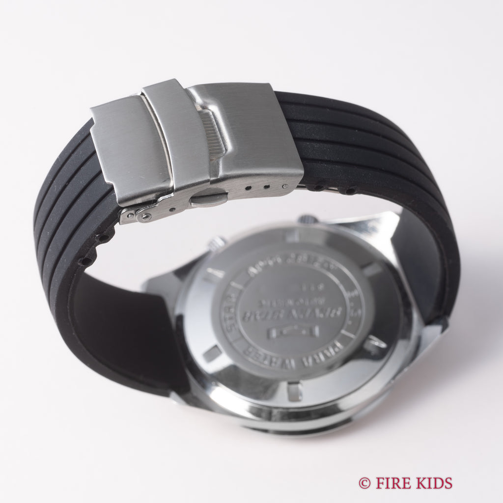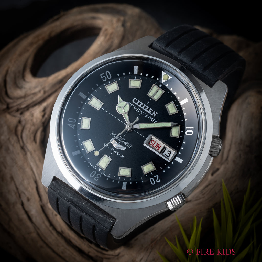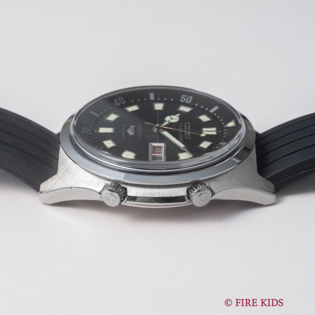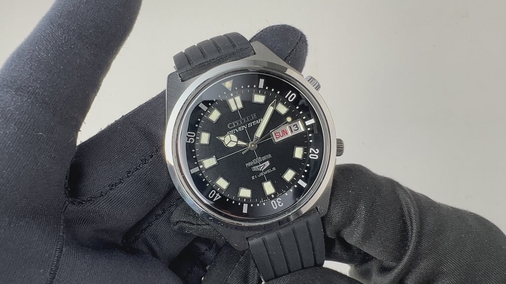 シチズン セブンスター 1968年製 ダイバーズウオッチ デイデイトです。2つのリューズが3時位置を避けるように付けられていることもあり、ケースサイズは大きめですが着け心地の良い時計になってます。2時位置のリューズでインナーベゼル、4時位置のリューズで手巻き、針回しの操作が可能です。夜光の変色が見られますがダイバーズウオッチらしい雰囲気のある1本です。ケースは小傷が見られますが大きなダメージはありません。ベルトは社外のラバーベルトが取り付けられています。こちらは分解掃除済みになります。