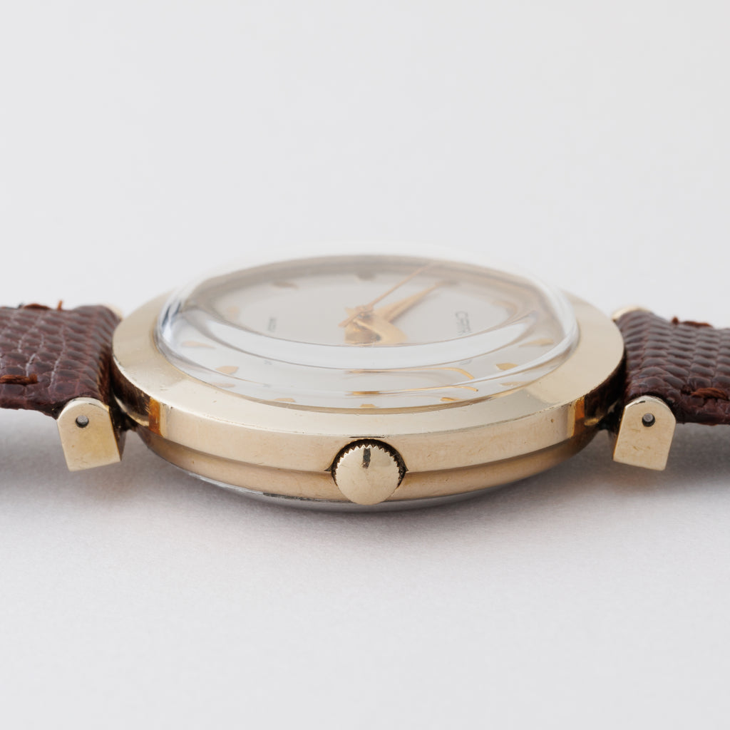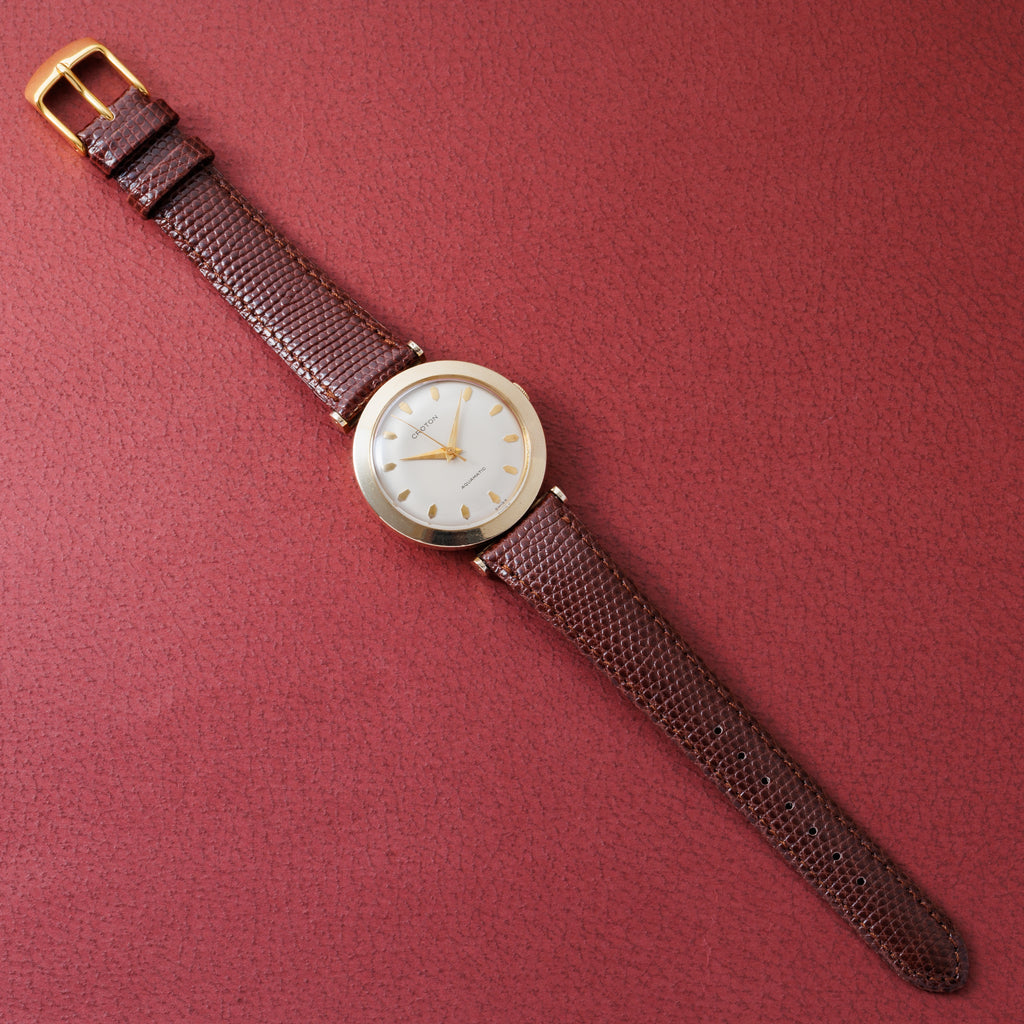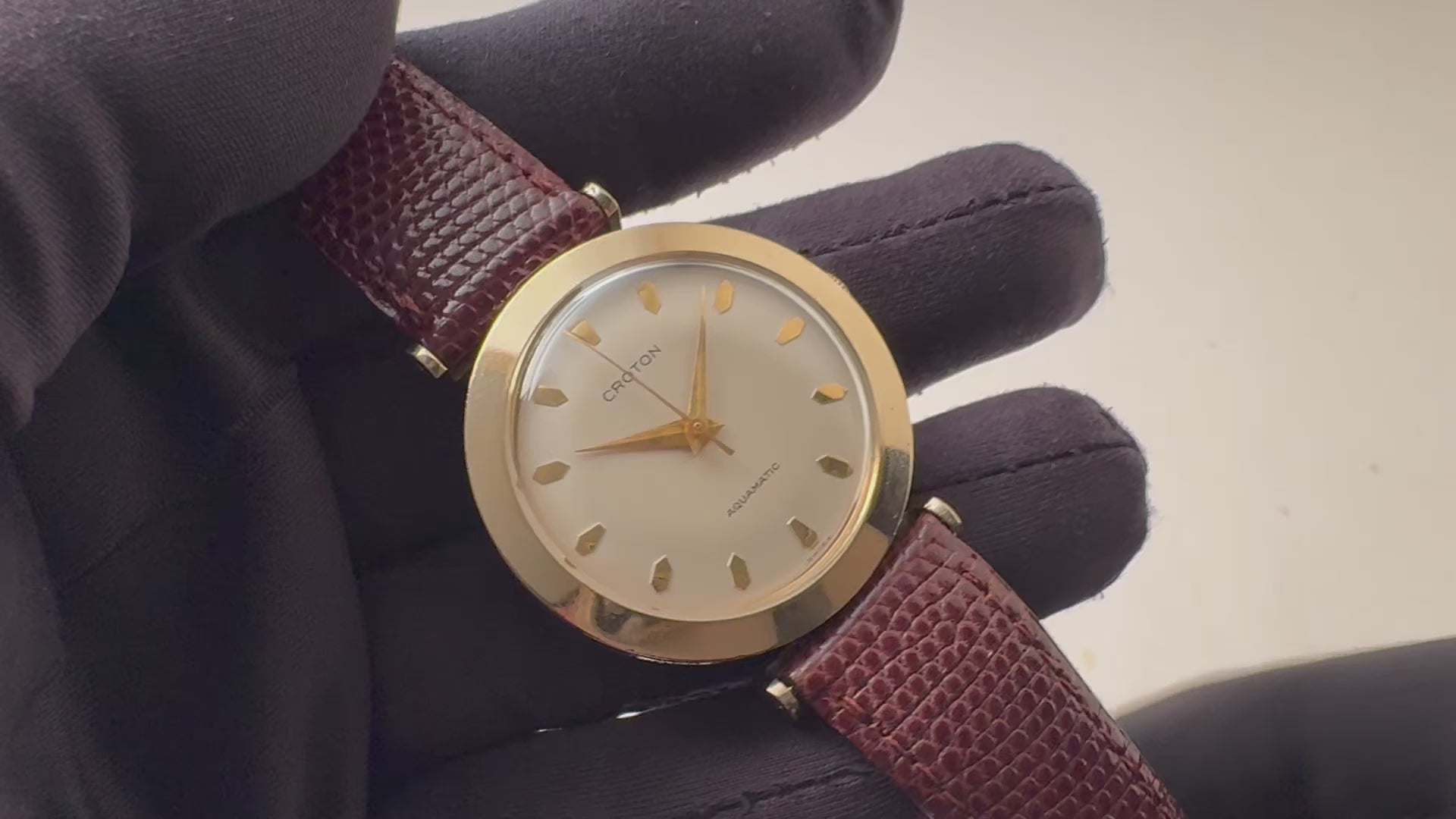 クロトン AQUAMATIC 1960年代製です。ダイヤルはドーム型に膨らんでおり、ダイヤモンド型のインデックスにドルフィンハンドの組み合わせはヴィンテージ感のある良い雰囲気です。ケースは10KGFにステンレスバックの仕様で、ラグの形状も独特です。ムーブメントは自動巻きのCal.1256を搭載しており、巻き上げも針回しもスムーズです。ベルトは社外の革ベルトを合わせています。こちらはOH済みです。