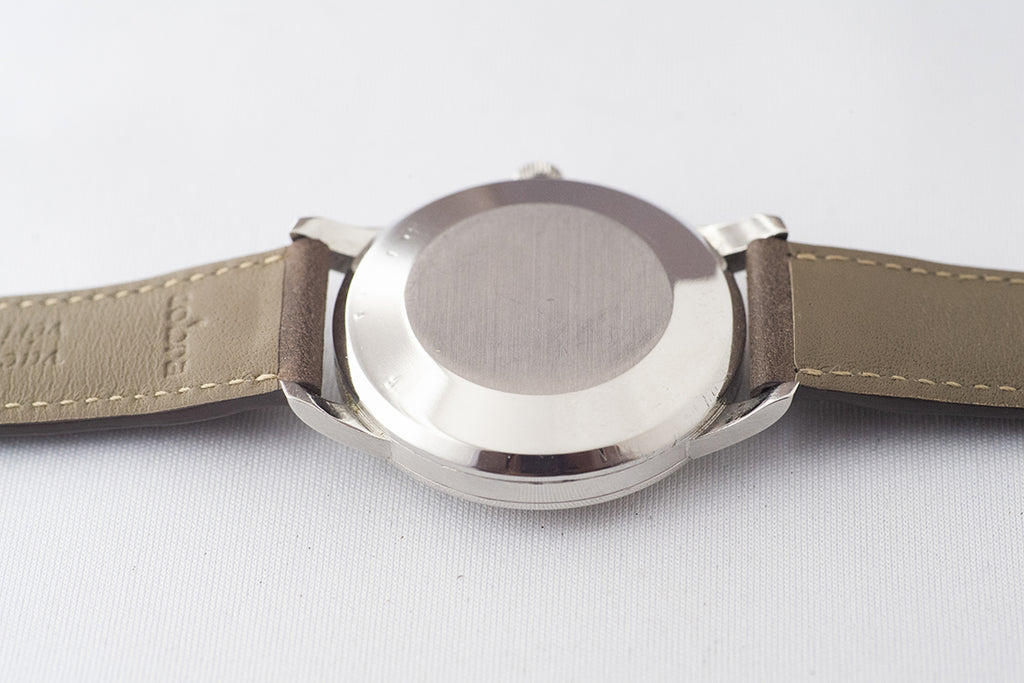 • ヴィンテージ時計の特性上、風防・パッキン・リューズ・バネ棒などの消耗部品は後年メンテナンス過程で交換されている場合がございます。オリジナル性を重視しておりますが、必要に応じて適切な部品にて調整されていますので、よりコレクション性重視のお求めのお客様は事前にご確認ください。