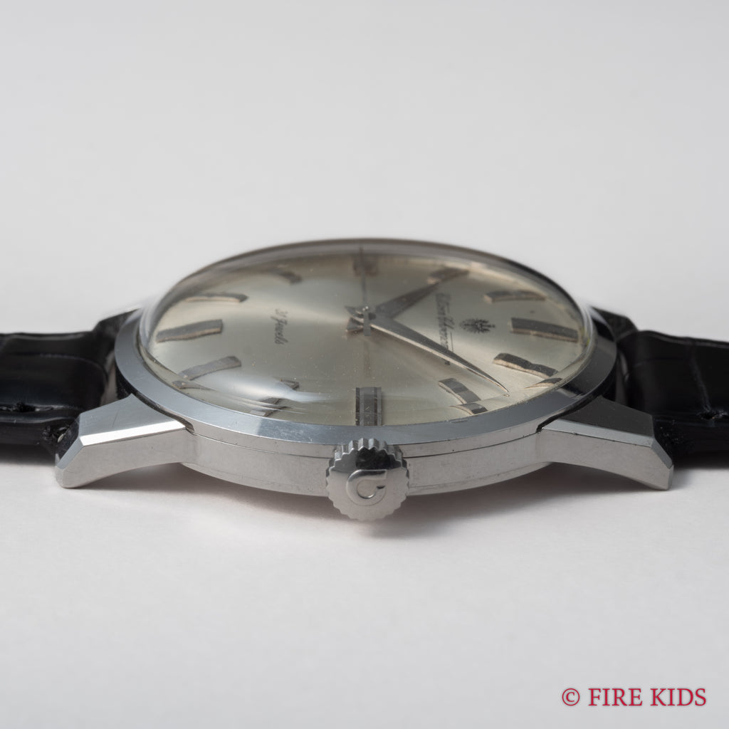 国産腕時計最高峰の一つと言われているシチズンの名機「クロノメーターCR1507051」1963年製です。 1962年から1966年までの約4年間のみ製造されたモデルで、採算を度外視して造られた為に短命になったと言われています。人気のステンレスケースで非常に美しい外観と精度を重視した大型ムーブメントは惚れ惚れとします。ケースは小傷が見られますが大きなダメージや腐食は見られません。メダリオンも綺麗に残っています。ベルトはファイアーキッズオリジナルのクロコダイルが取り付けてあります。手巻きや針回しの操作はスムースです。