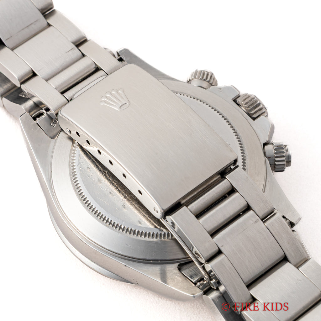 ロレックス デイトナ 1991年製 Ref.16520 ホワイト 逆6ダイヤル シングルバックル オールトリチウム メーカーサービスカード付の入荷になります。ダイヤル6時位置の12時間積算系の6が反転して9に見えることから通称逆6と呼ばれる人気の初期仕様です。オールトリチウムの個体で、ダイヤルは若干の経年はありますが大きなダメージはありません。ケースは小傷や多少の磨きは感じますが特筆すべきダメージは無く、実用派の方にとっては良い個体かと思います。ムーブメントはゼニスのエルプリメロCal.400ベースのCal.4030を搭載、振動数を36000振動から28800振動にすることで、耐久性を高めています。手巻きや針回し、クロノグラフの操作はスムースです。ベルトは純正シングルバックルブレス78360/FF503がフルコマで取り付けてあります。ロレックスのサービスカード付で2027年4月迄の保証が残っています。