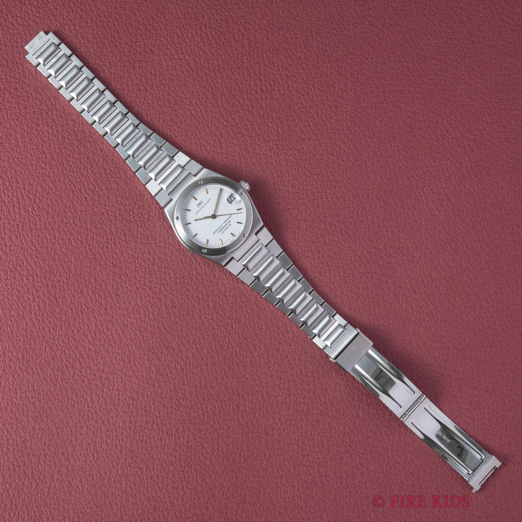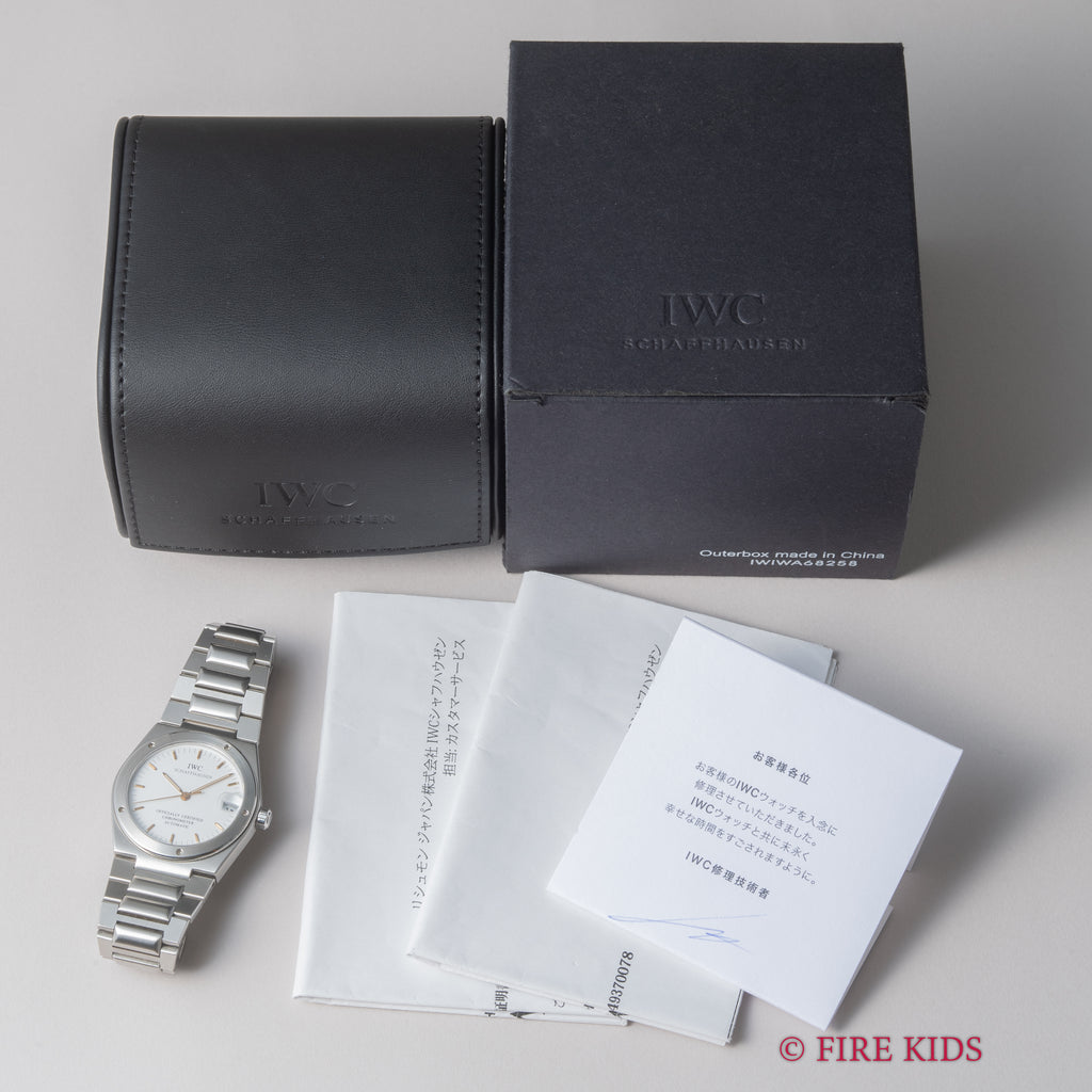 IWC インヂュニア 1993年製 Ref.3521 ジェンタデザイン 耐磁時計 自動巻きクロノメーターです。ジェラルド・ジェンタ氏のデザインのモデルでインヂュニアは「エンジニア」を意味し、無骨な印象ながら装着感の良いデザインが魅力的です。上品なホワイトダイヤルが高級感も感じさせてくれます。目立ったキズや汚れ等無く、インデックス、針ともにトリチウム夜光です。ムーブメントはIWCでは珍しいクロノメータームーブメントCal.887/2を搭載。ケースは小傷が見られますが大きなダメージはありません。お魚リューズもしっかり残っています。手巻きや針回し、ねじ込みリューズの操作はスムースです。2024年に駒足しをした際の修理明細とサービスボックスが付属します。