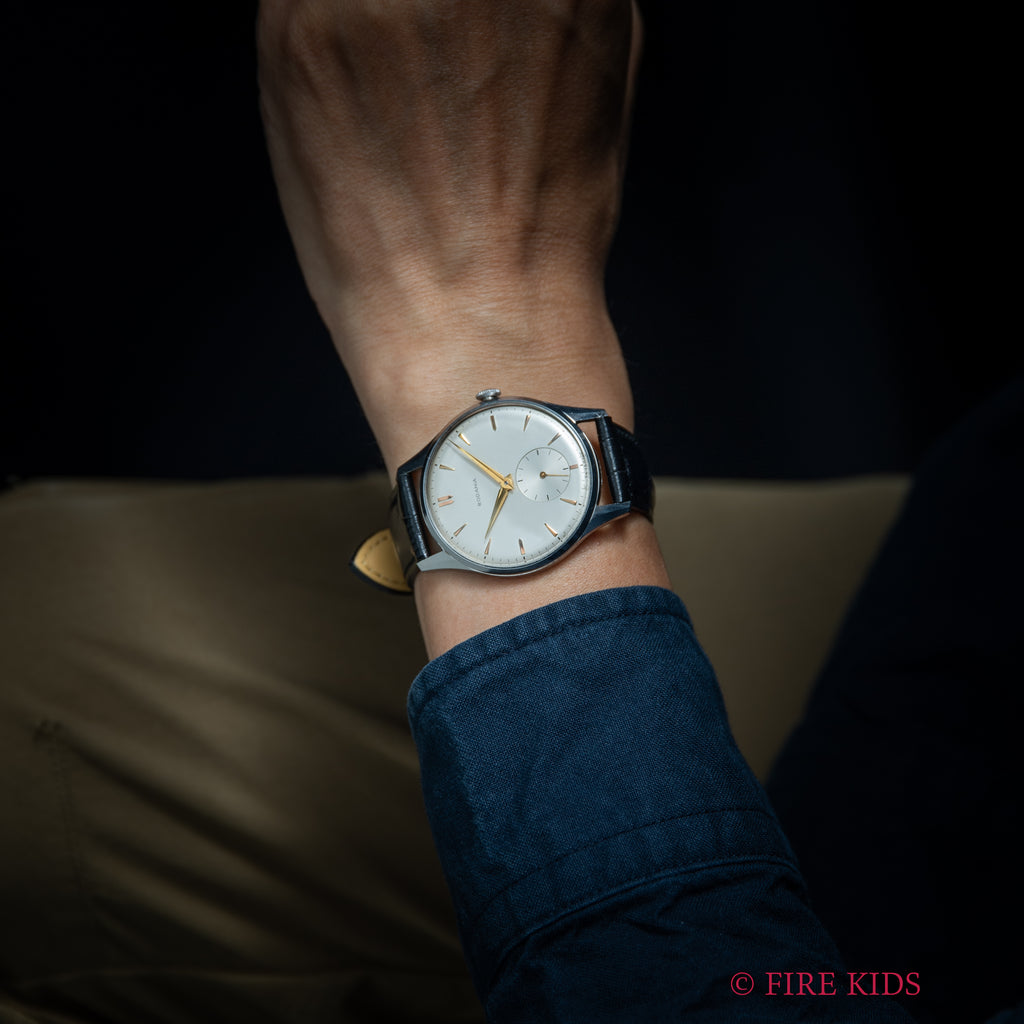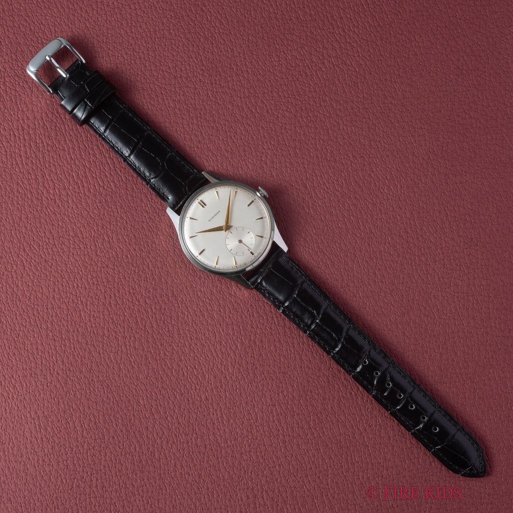 1960年代製のロダニア ラウンドモデル スモールセコンドです。楔インデックスのシルバーダイヤルは大きなダメージ無く良好なコンディションです。スモールセコンドが良いアクセントになっています。ムーブメントはCal.1130を搭載し、赤胴メッキが施されていてオメガの30㎜を思わせます。ケースも小傷はありますが大きなダメージはありません。ベルトは社外の革ベルトを合わせています。こちらは分解掃除済みになります。