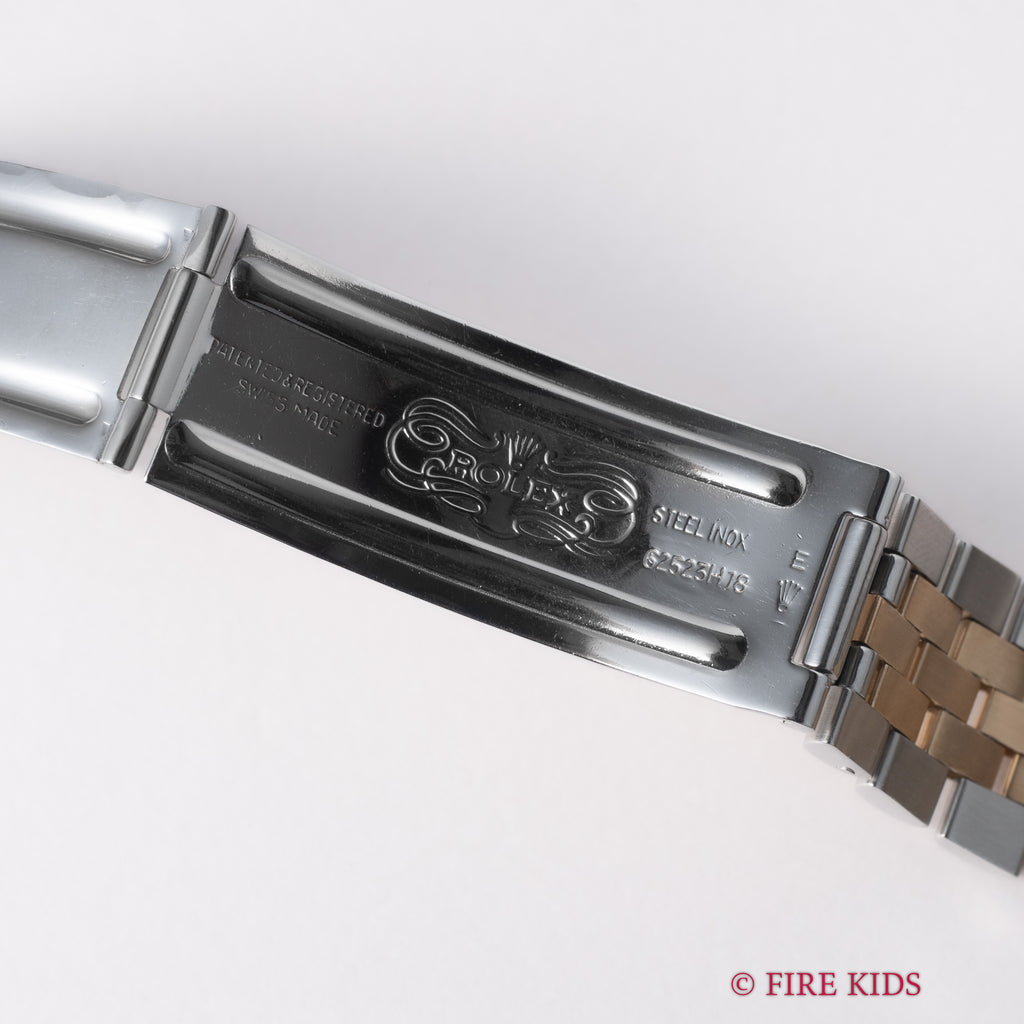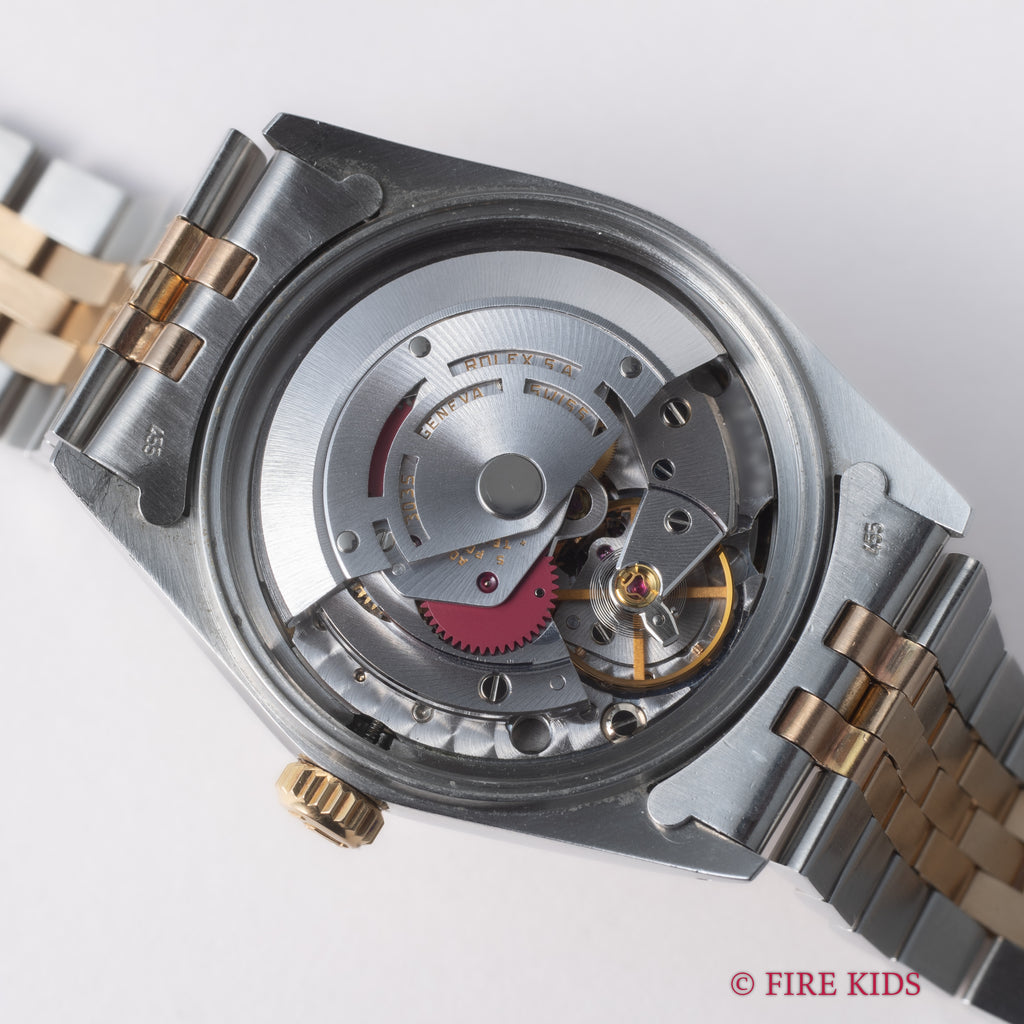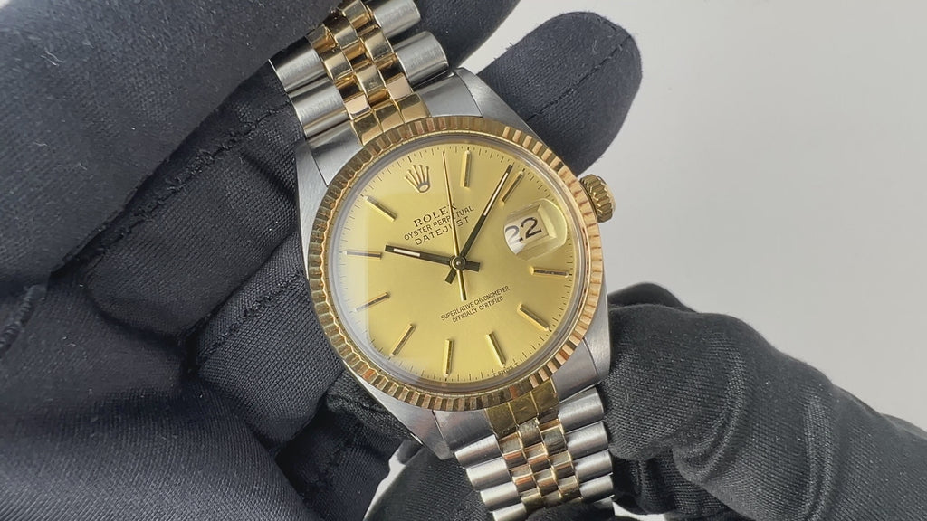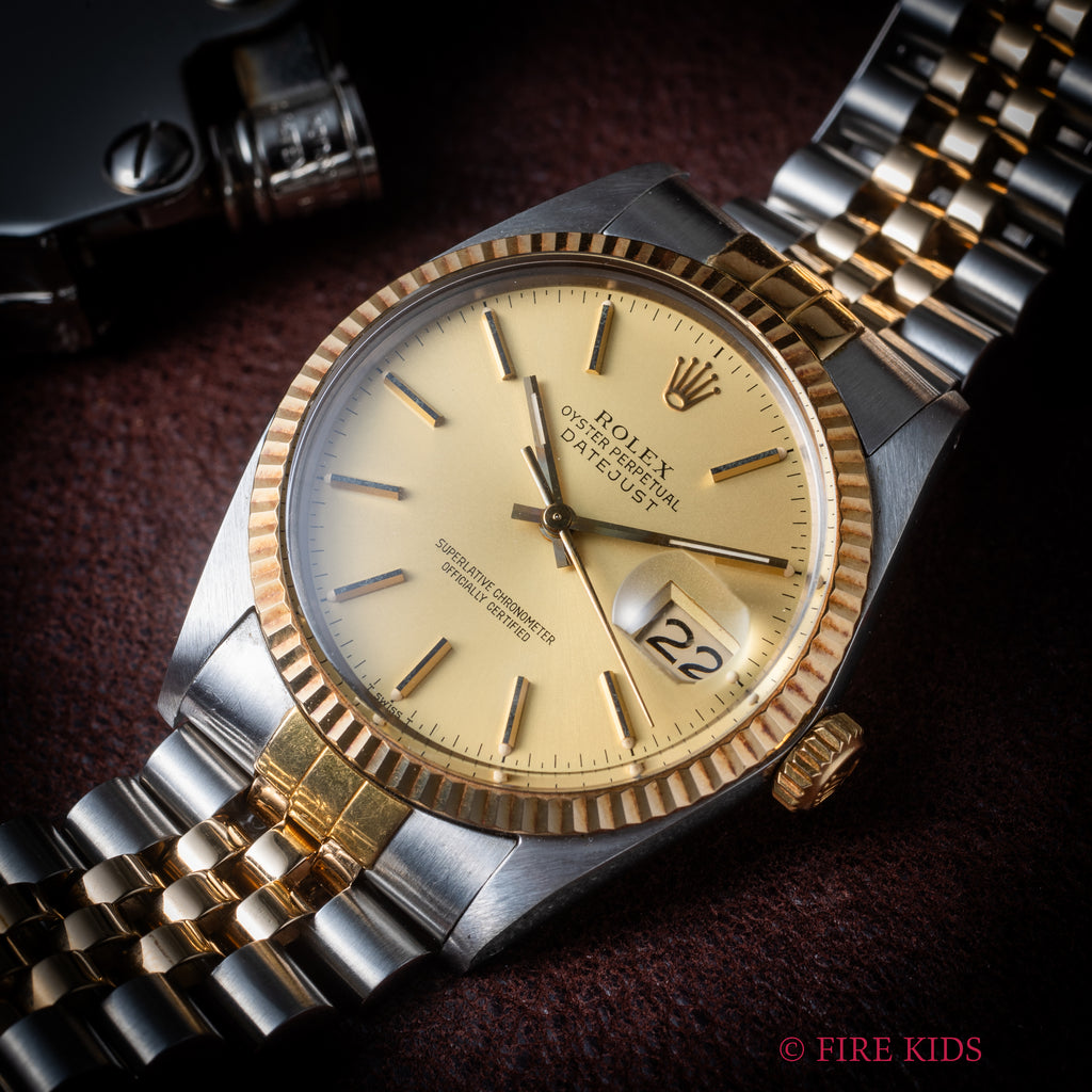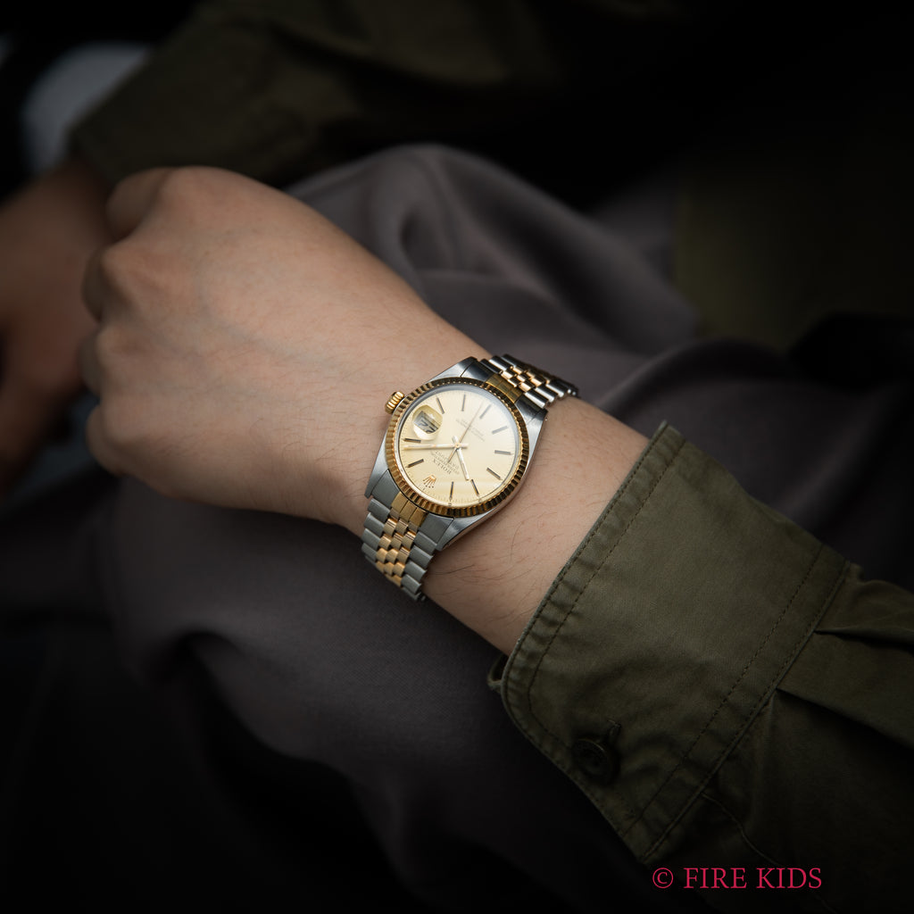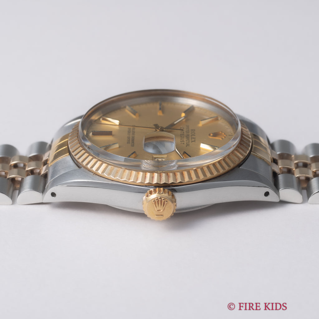 1985年製のロレックスデイトジャストRef.16013コンビモデルです。ケース素材はステンレスとイエローゴールドのコンビに文字盤はシャンパンゴールドダイヤルで大人な雰囲気を感じる組み合わせです。ムーブメントは前モデルのCal.1570からハイビートのCal.3035を搭載。ケースは小キズが見られますが大きなダメージはありません。ベルトは純正コンビジュビリーが取り付けてあります。リューズのねじ込みや手巻き針回しの操作もスムースです。ギャランティーとクロノメーター証が付属します。