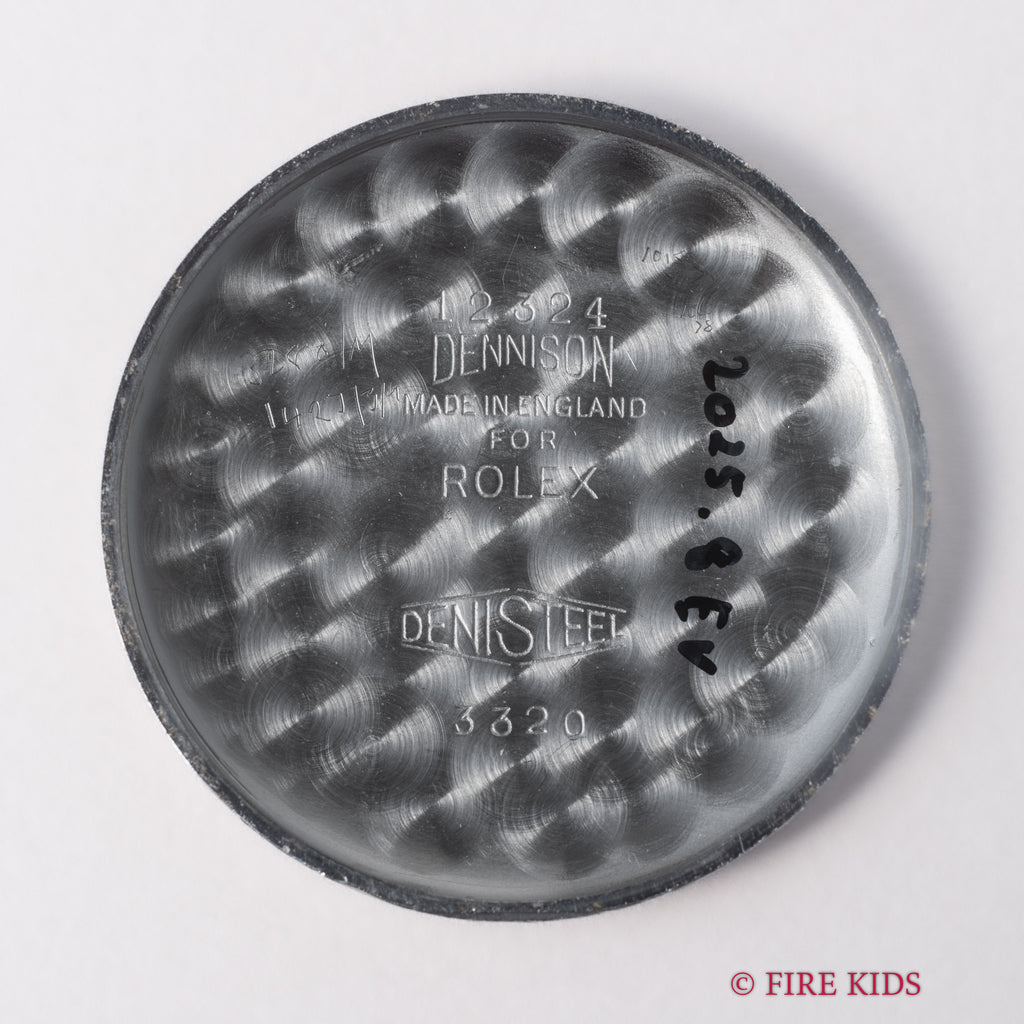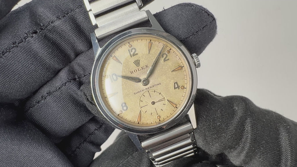 ロレックス デニソンケース 1953刻印 スモールセコンド手巻 Cal.700 Ref.3320 社外バンブーブレスの入荷になります。イギリスで製造された30㎜サイズのデニソンケースに飛びアラビアダイヤル、スモールセコンド、アルファハンドとヴィンテージの魅力が詰まっています。オイスターケースではない非常にレアなモデルです。文字盤は全体的に変色して綺麗とは言えませんが味が出ています。ケースは小傷が見られますが大きなダメージはありません。裏蓋にはギフトの刻印があり、1953と記されています。ブレスは社外のバンブーブレスが取り付けられています。こちらの時計は分解掃除済みです。
