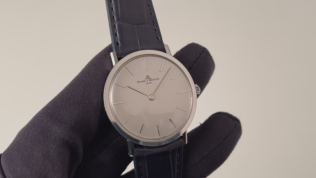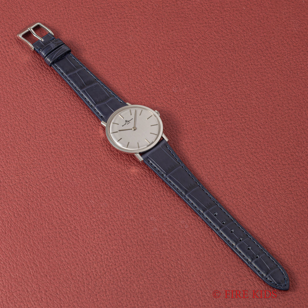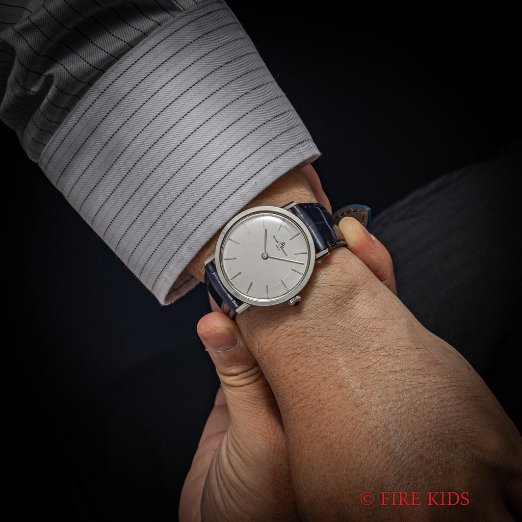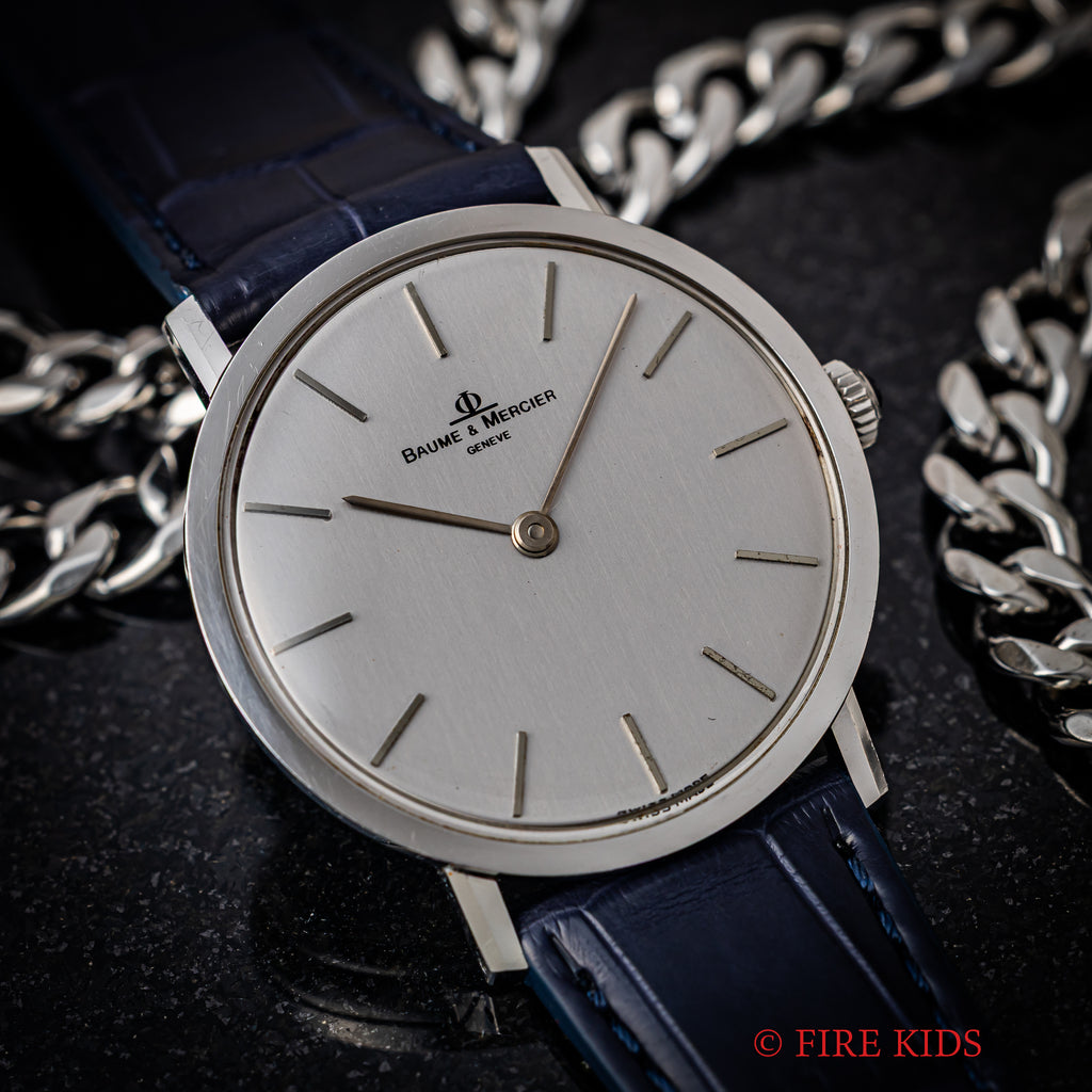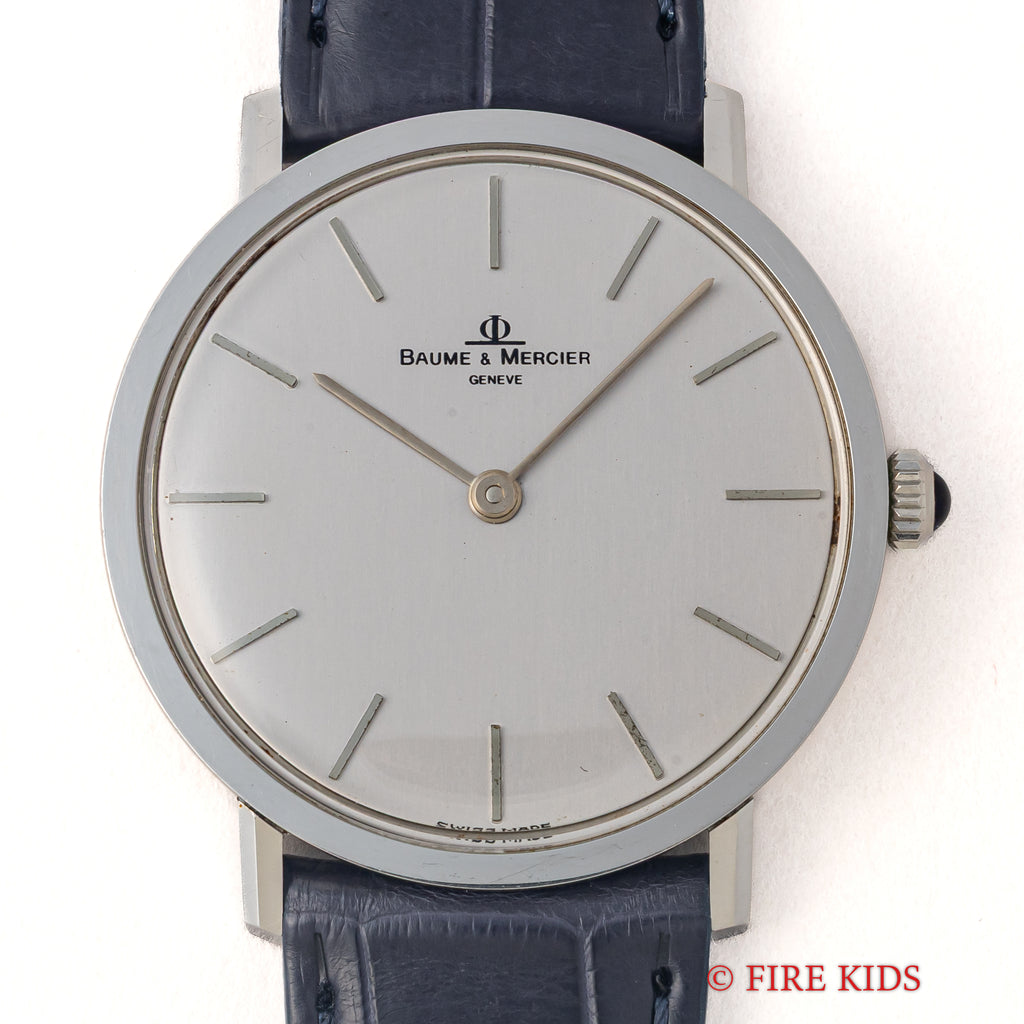 ボーム&メルシエ シルバーダイヤル 1970年代製 手巻き Cal.BM17001の入荷になります。約6.5㎜の薄型2針のドレスウォッチです。シルバーダイヤルにバーハンドの組合せになっていてシンプルなデザインだからこそ造りの良さが感じられます。文字盤はシミ等無く綺麗です。ケースは小傷が見られますが大きなダメージはありません。手巻きや針回しの操作はスムースです。ベルトはファイアーキッズオリジナルクロコダイル革ベルトが取り付けられています。