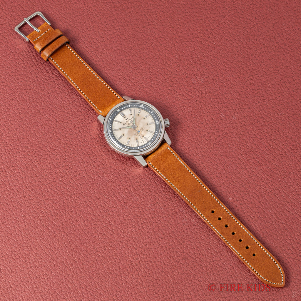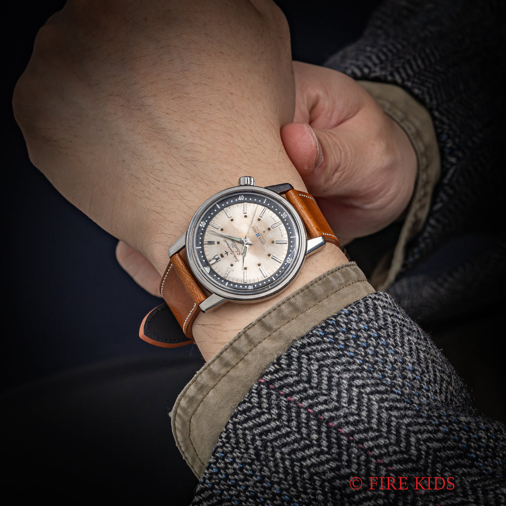 1964年製のセイコーシルバーウェーブ自動巻きモデルが入荷しました。製造期間が1964年から66年と言われるレアモデルです。文字盤外周の回転インナーベゼルが特徴で、全体的に経年変化したヴィンテージらしい雰囲気です。ケースは小傷はございますが大きなダメージはありません。ムーブメントは自動巻きCal.2451を搭載。回転ベゼル、針回しの操作はスムーズです。ベルトはファイアーキッズオリジナルブッテーロカーフレザーを合わせています。