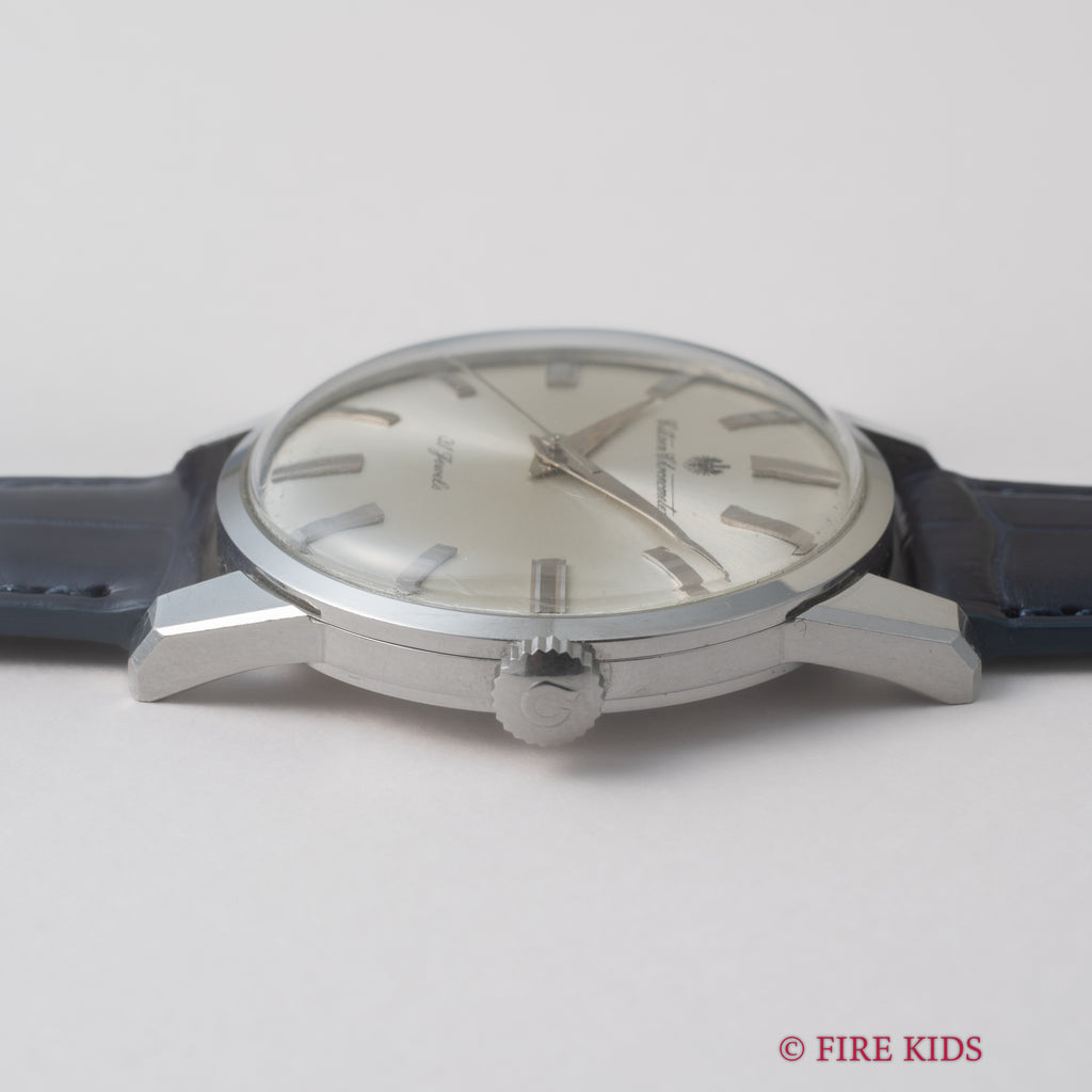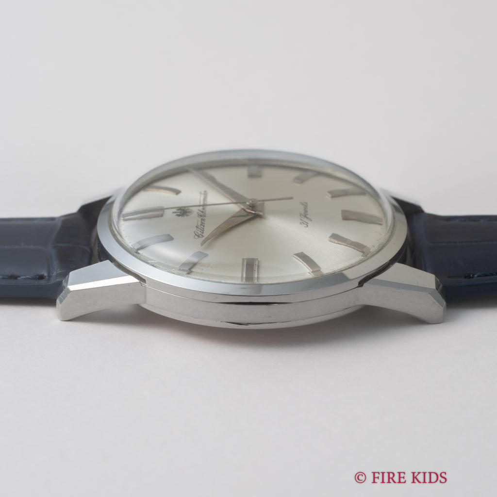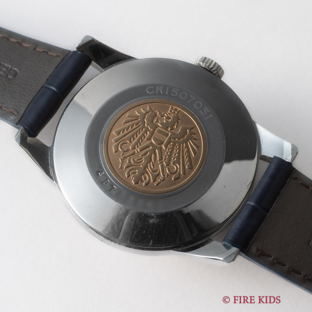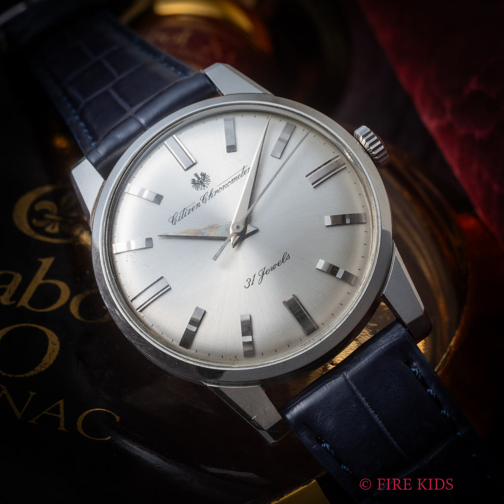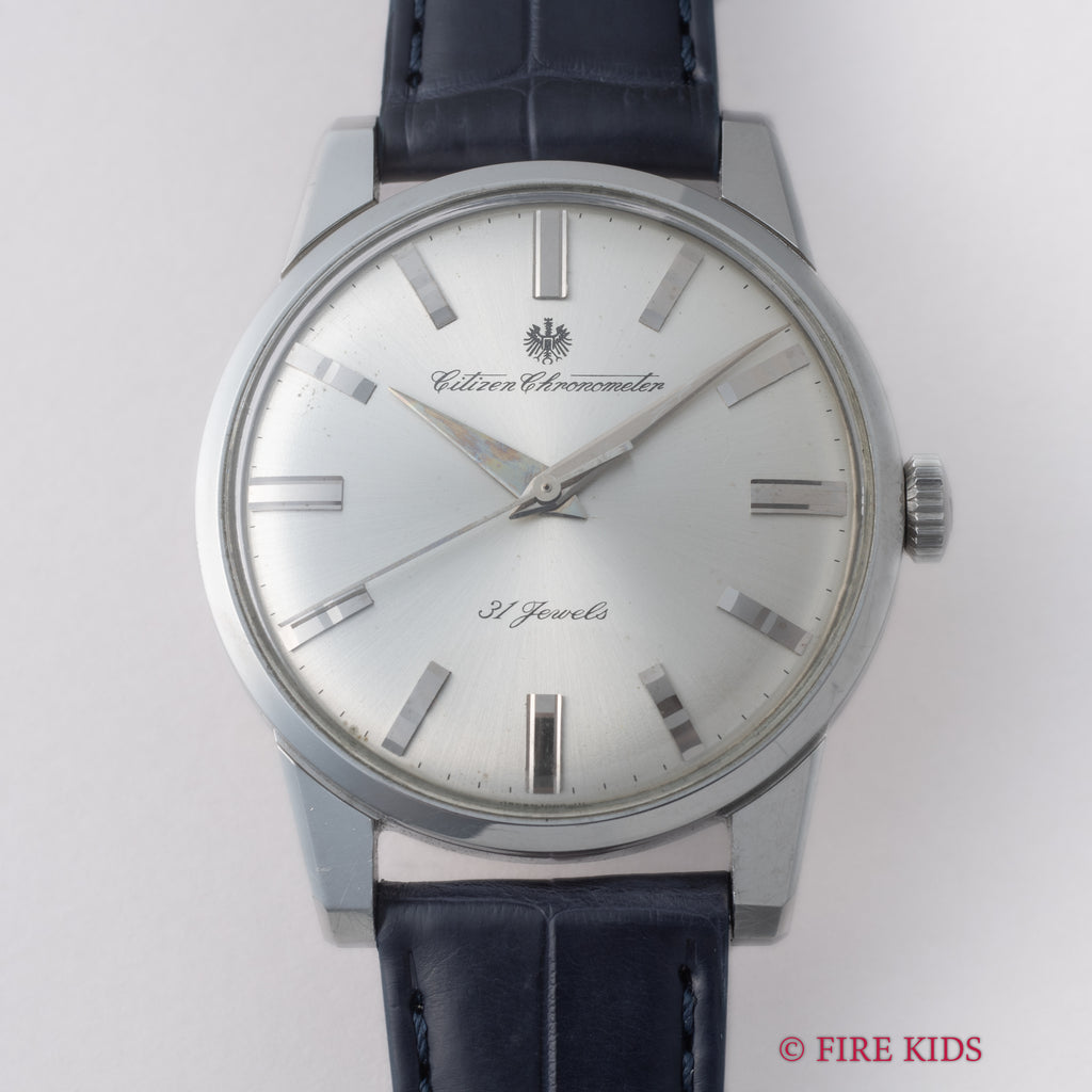 国産腕時計最高峰の一つと言われているシチズンの名機「クロノメーターCR1507051」1964年製です。 1962年から1966年までの約4年間のみ製造されたモデルで、採算を度外視して造られた為に短命になったと言われています。文字盤は後年のサンバースト仕上げのシルバーです。人気のステンレスケースの美しい外観と精度を重視した大型ムーブメントは惚れ惚れとします。ケースは小傷が見られますがノンポリッシュでシャープなエッジが残っています。メダリオンも綺麗に残っています。ベルトはファイアーキッズオリジナルのクロコダイルを合わせております。こちらは分解掃除済みです。
