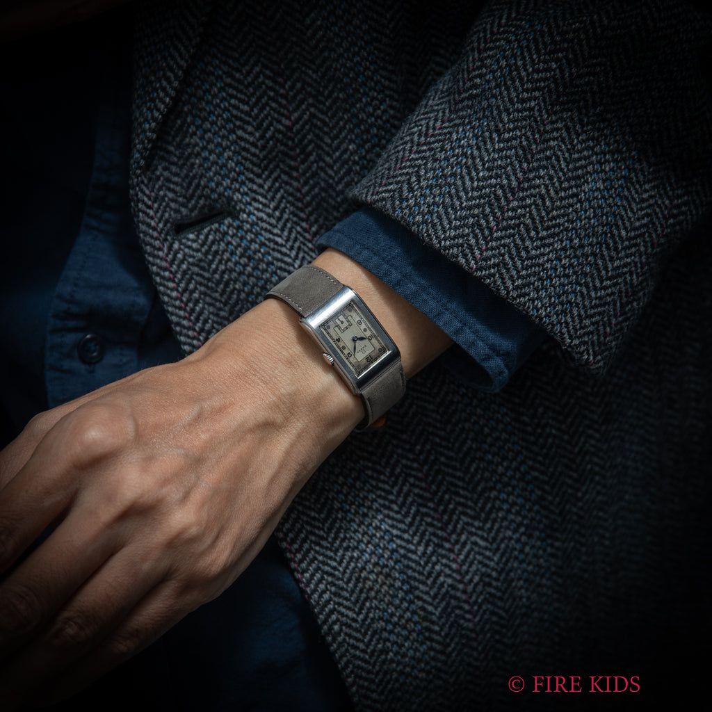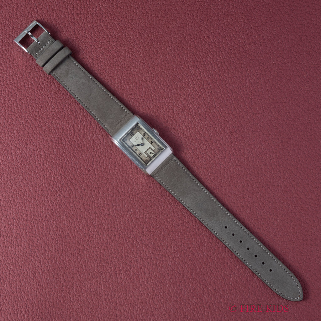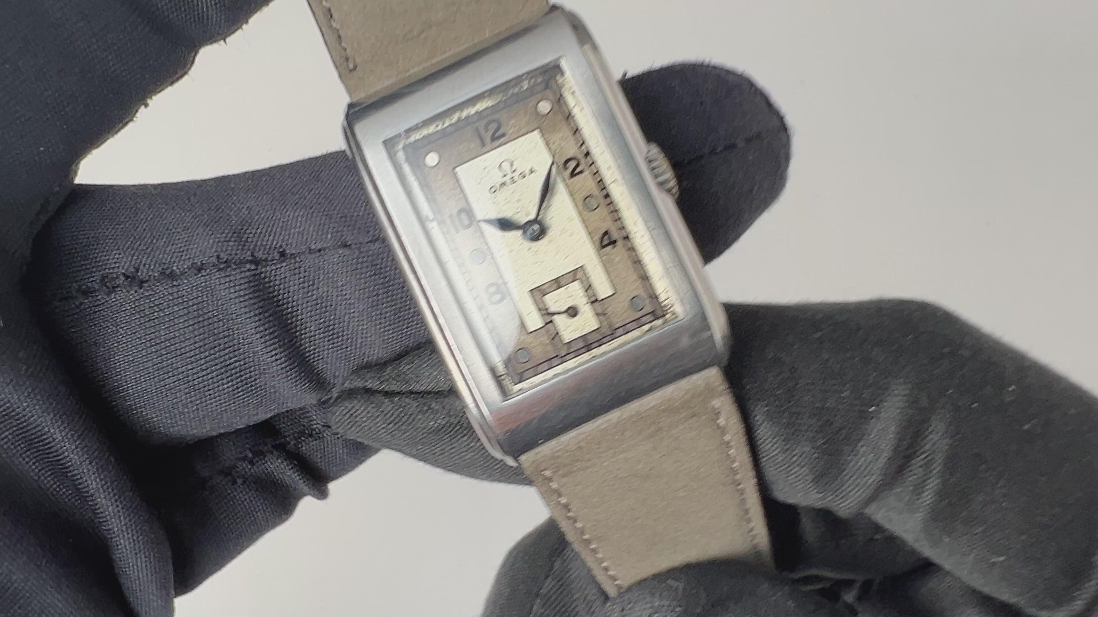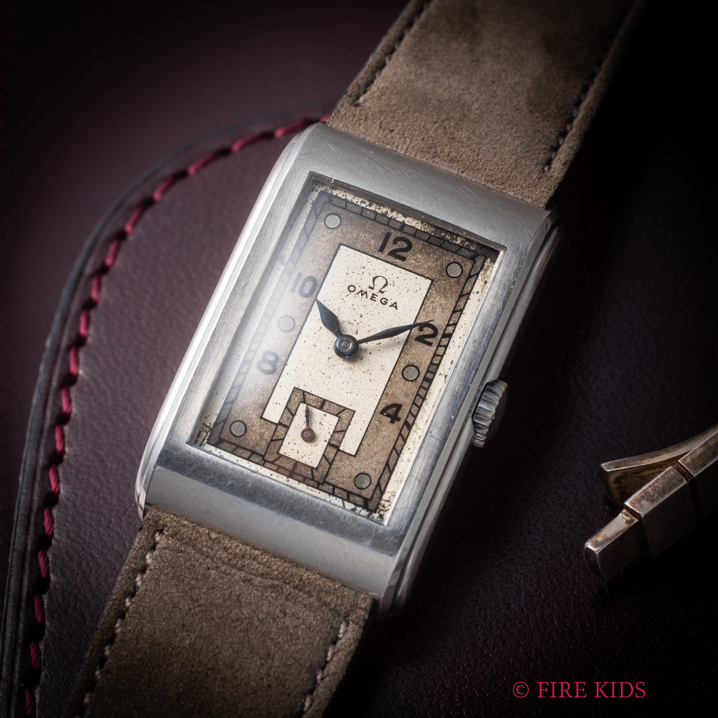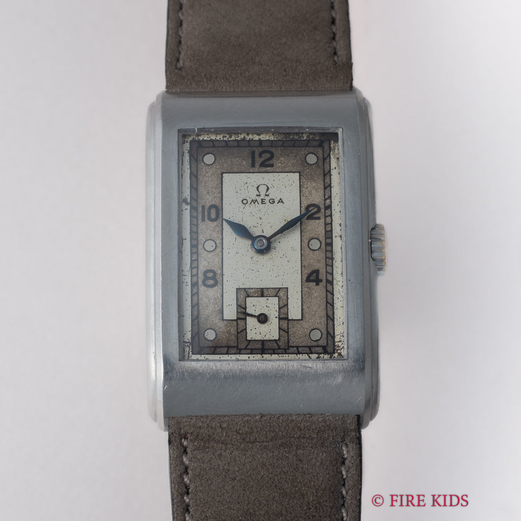 オメガ アールデコ レクタンギュラーケース 1939年製 手巻 Cal.T17 タンクウオッチの入荷になります。アールデコ調のケースは初期の防水仕様で汗が入りにくい構造になっています。文字盤はツートンの飛びアラビアダイヤルで綺麗とは言えませんが、良い雰囲気になっています。ブルースチールのリーフハンドも目を惹きます。ケースは小傷が見られますが大きなダメージはありません。手巻きや針回しの操作はスムースです。ベルトはヴィンテージと相性の良いアキュレイトフォルムが取り付けられています。