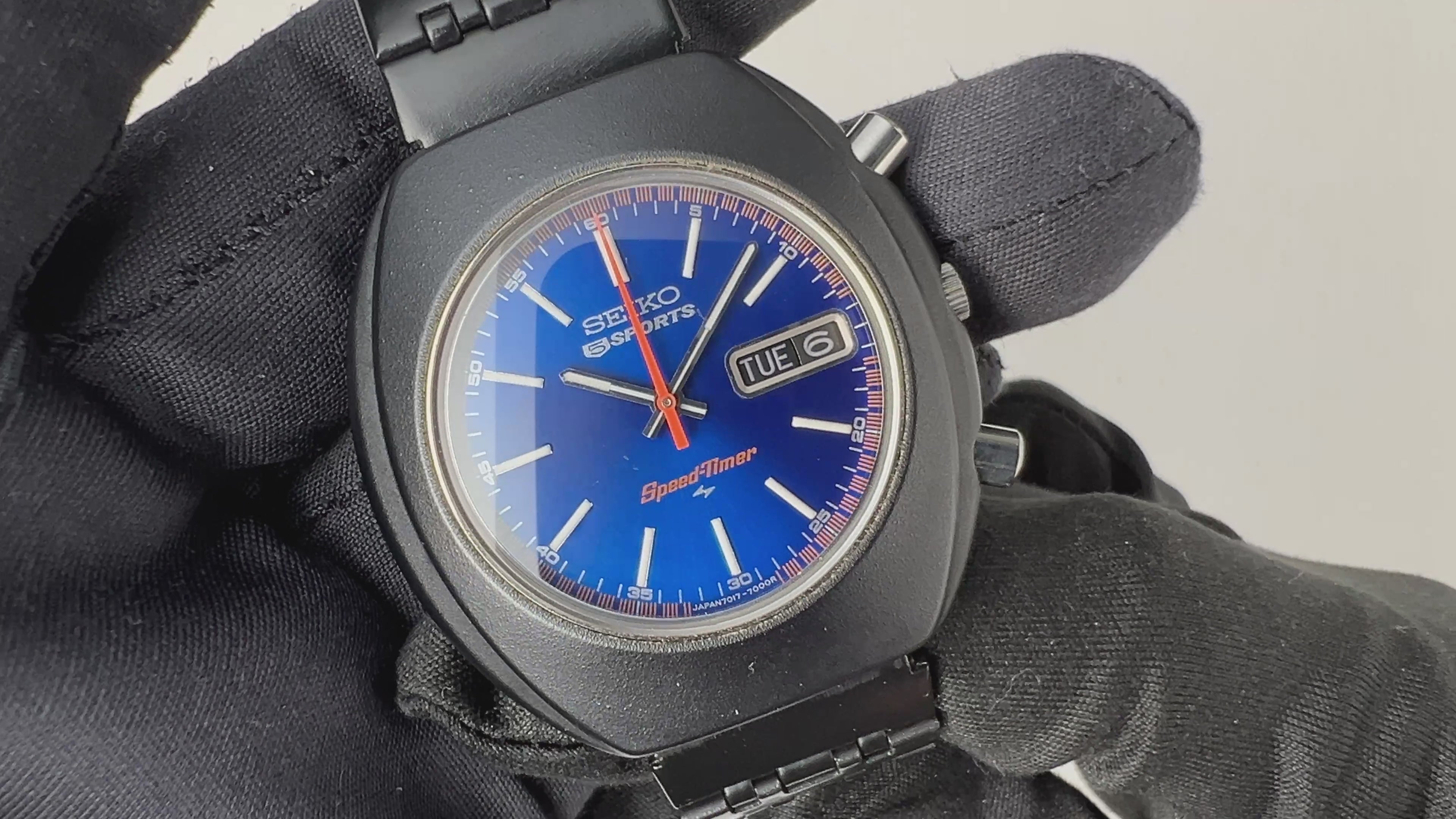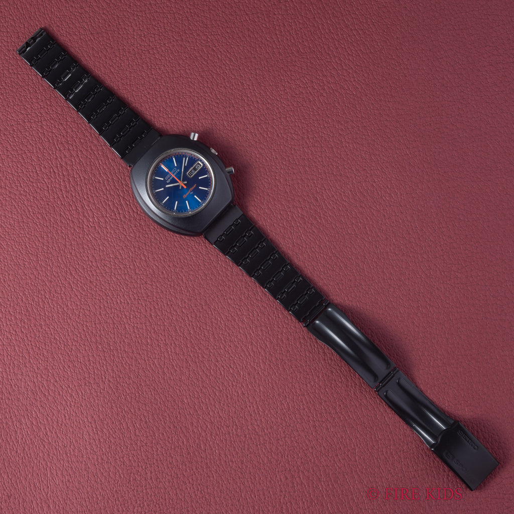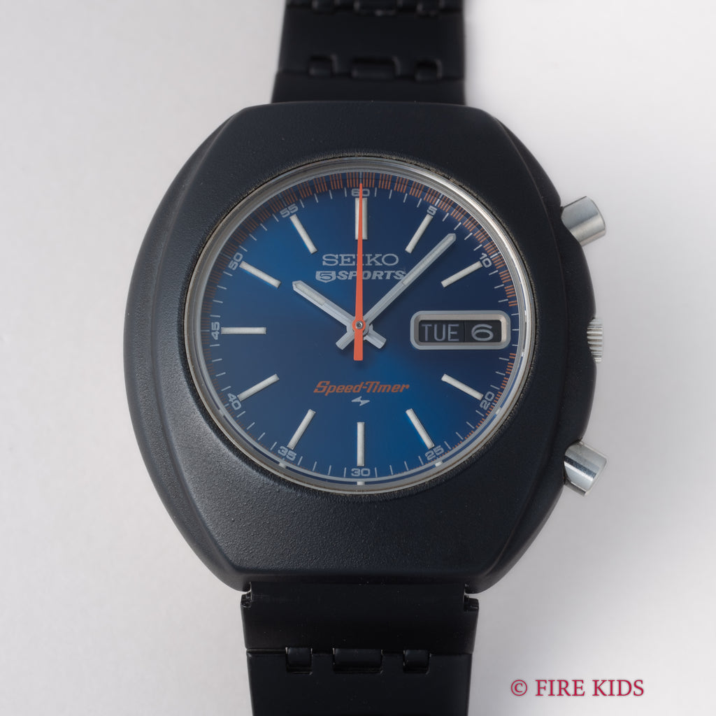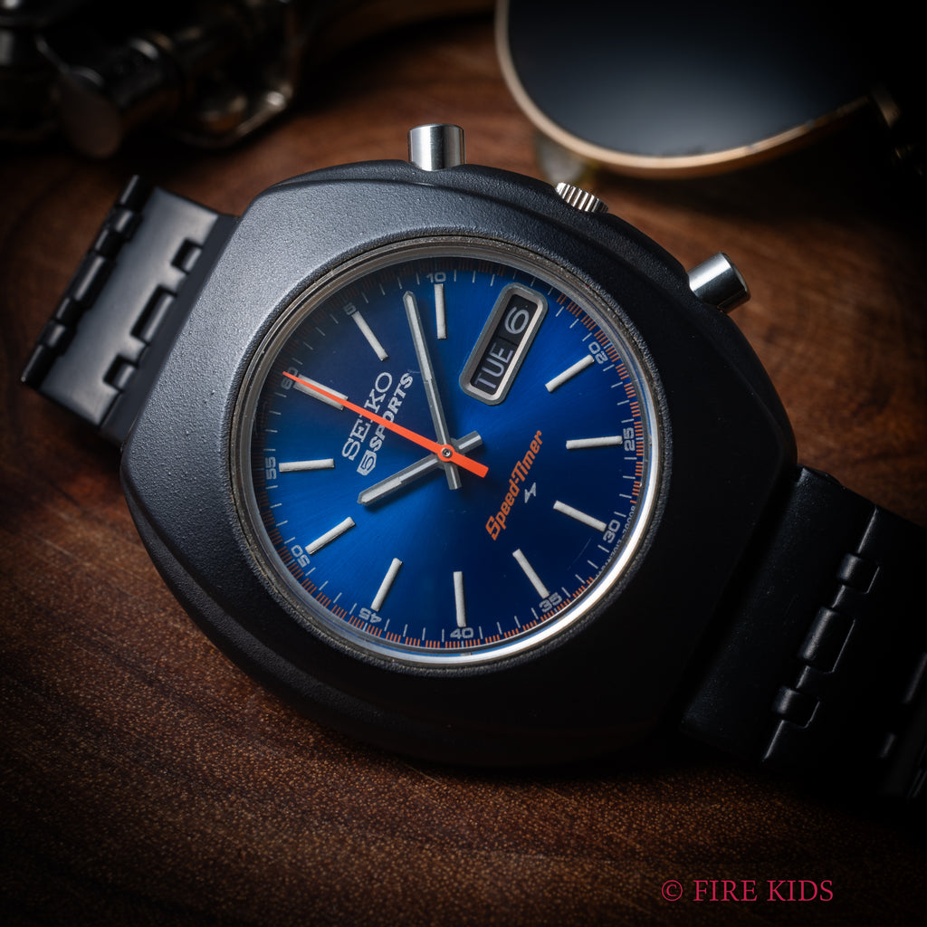 セイコー 5スポーツ スピードタイマー 1972年製 NSBケース 自動巻クロノグラフ Ref.7017-7000 純正ブレス付きです。ブラックコーティングされたケースに鮮やかなブルーダイヤル、オレンジのクロノ針と70年代らしいデザインになっています。世界初の自動巻きクロノグラフの一つとされるCal.6139Bを搭載しています。文字盤はシミ等無く綺麗です。ケースのコーティングも剝がれが無く綺麗な状態です。ベルトは純正のステンレスブレスにコーティングが施されたオリジナルが取り付けられています。リューズ押し込みで曜日の早送り、一段引いて日付早送りが可能です。手巻き機能はありません。