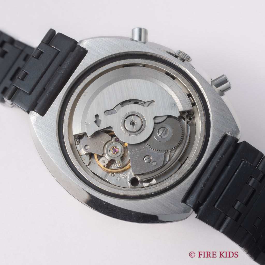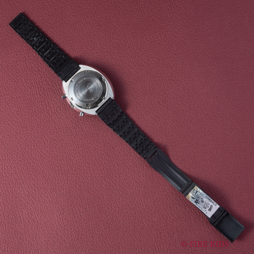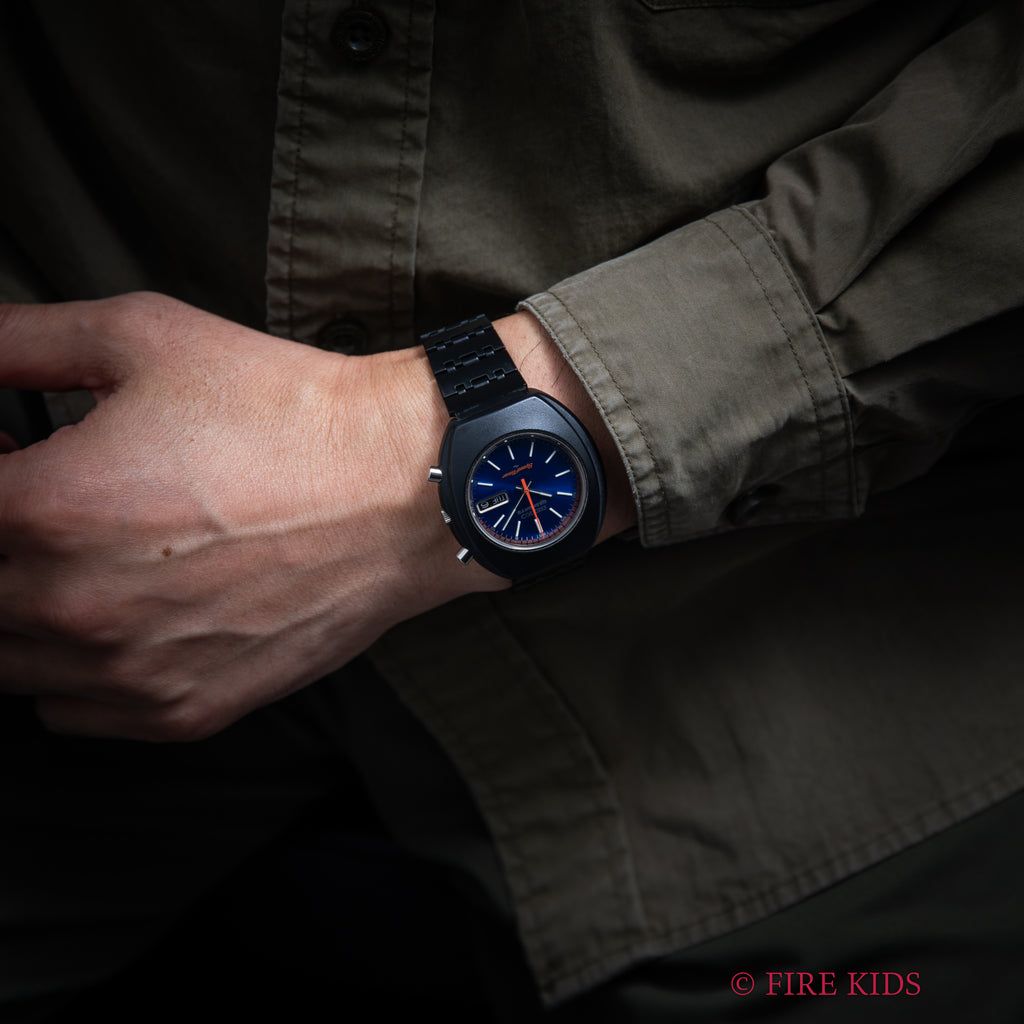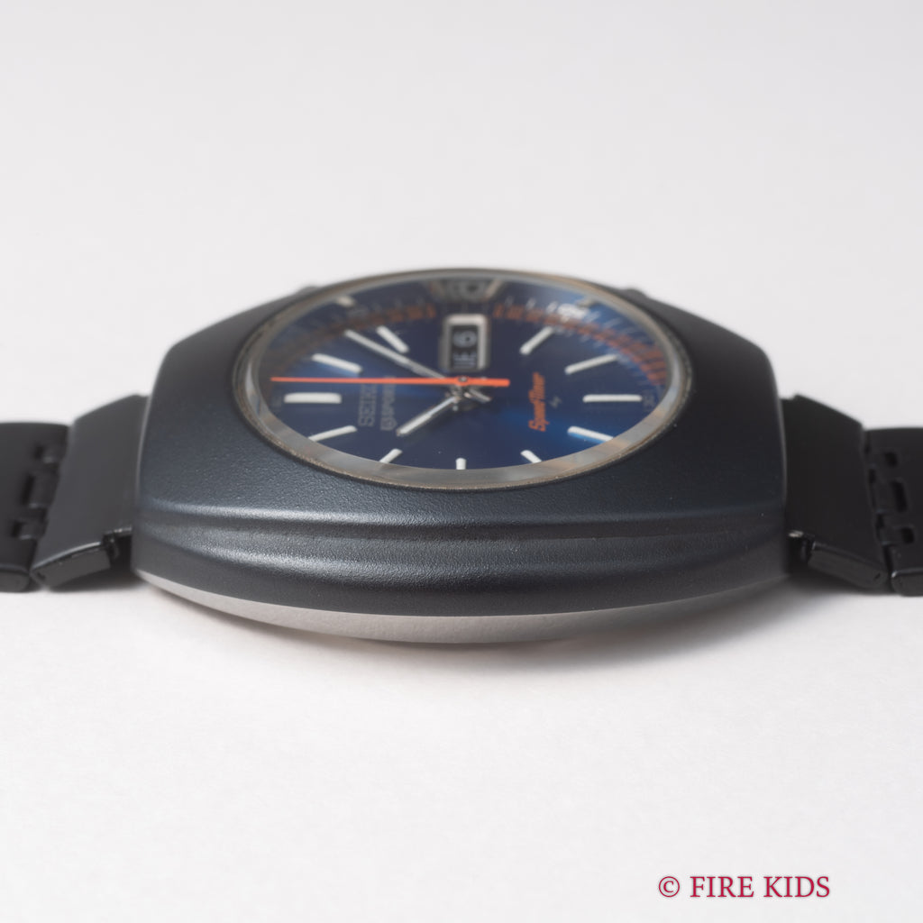 セイコー 5スポーツ スピードタイマー 1972年製 NSBケース 自動巻クロノグラフ Ref.7017-7000 純正ブレス付きです。ブラックコーティングされたケースに鮮やかなブルーダイヤル、オレンジのクロノ針と70年代らしいデザインになっています。世界初の自動巻きクロノグラフの一つとされるCal.6139Bを搭載しています。文字盤はシミ等無く綺麗です。ケースのコーティングも剝がれが無く綺麗な状態です。ベルトは純正のステンレスブレスにコーティングが施されたオリジナルが取り付けられています。リューズ押し込みで曜日の早送り、一段引いて日付早送りが可能です。手巻き機能はありません。