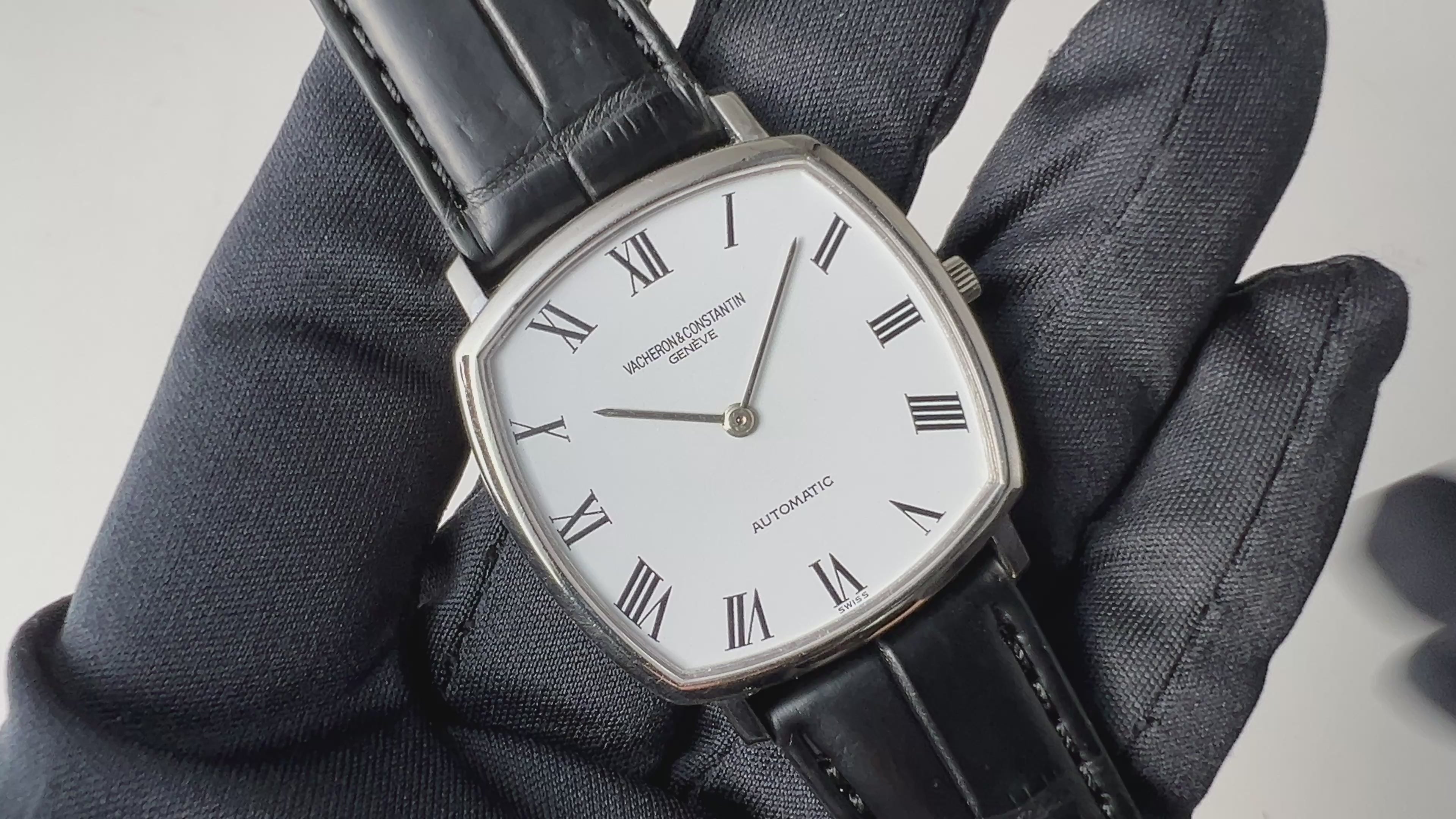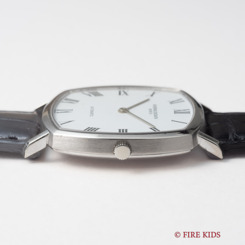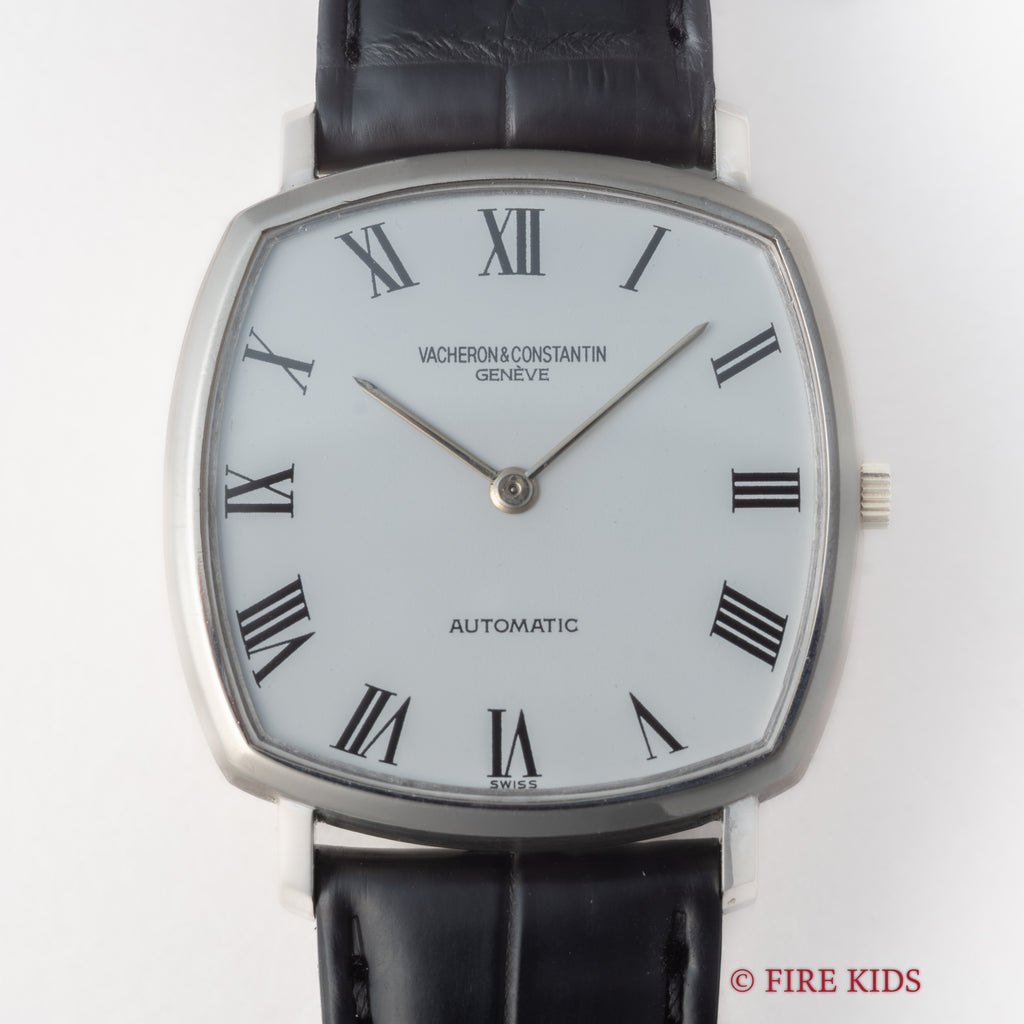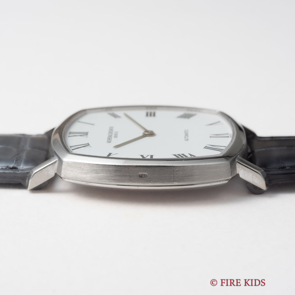 1970年代に製造されたヴァシュロン・コンスタンタン スクエアケース 手巻きモデルです。18KWGのスクエアケースに2針、ローマインデックスとシンプルです。文字盤はダメージも少なく、概ね綺麗な状態です。ケースは小傷がありますが、大きなダメージはありません。ムーブメントはジャガールクルトベースのCal.K1120を搭載、コンディションは良いですが、ローターの音がケースの中で反響して大きく聞こえてしまいます。ベルトはファイアーキッズオリジナルのクロコダイル革ベルトが取り付けられています。こちらはサービスケース付です。