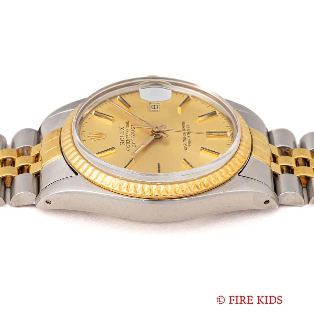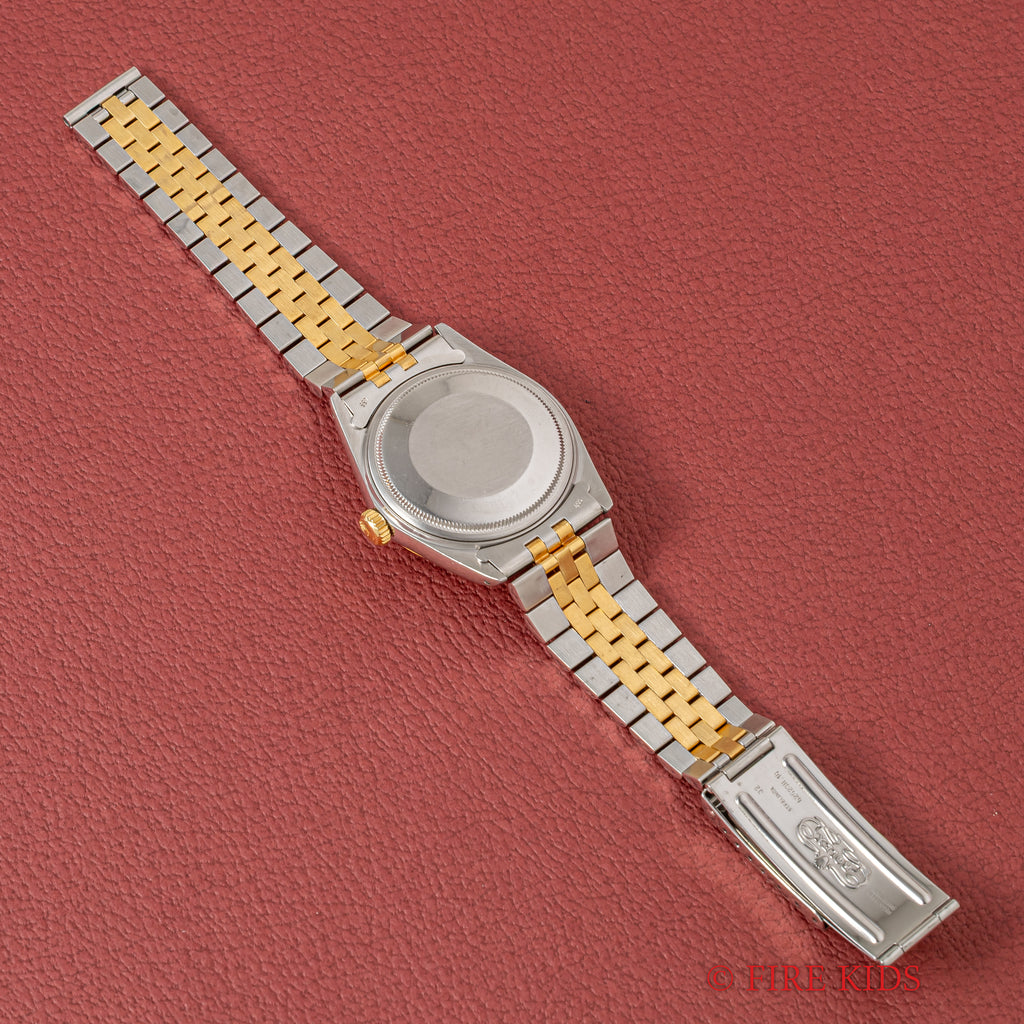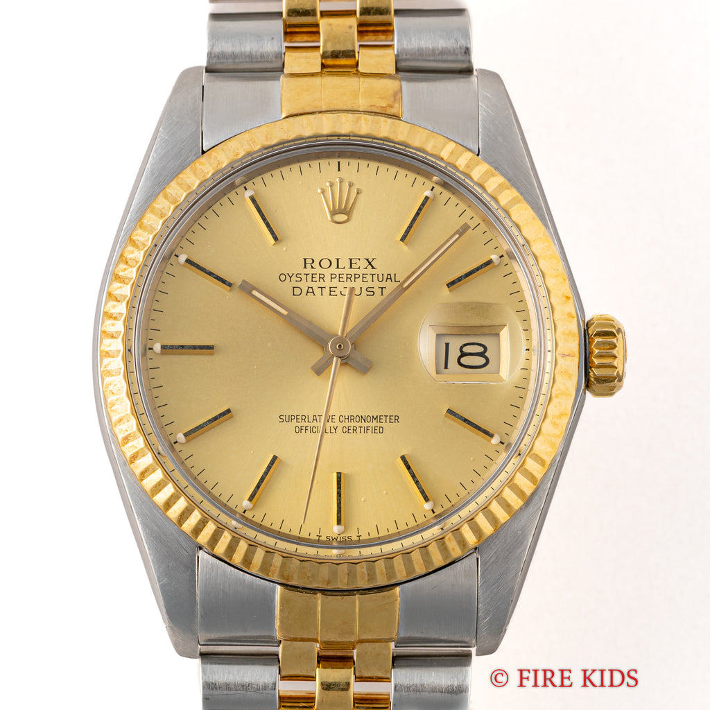 ロレックス 1985年製 デイトジャスト コンビ Ref.16013 自動巻 トリチウム夜光の入荷になります。ケース素材はステンレスとイエローゴールドのコンビに文字盤はシャンパンゴールドダイヤルで大人な雰囲気を感じる組み合わせです。ムーブメントは前モデルのCal.1570からハイビートのCal.3035を搭載。ケースは小キズが見られますが大きなダメージはありません。ベルトは純正コンビジュビリーが取り付けてあります。リューズのねじ込みや手巻き針回しの操作もスムースです。こちらの時計は分解掃除済みです。