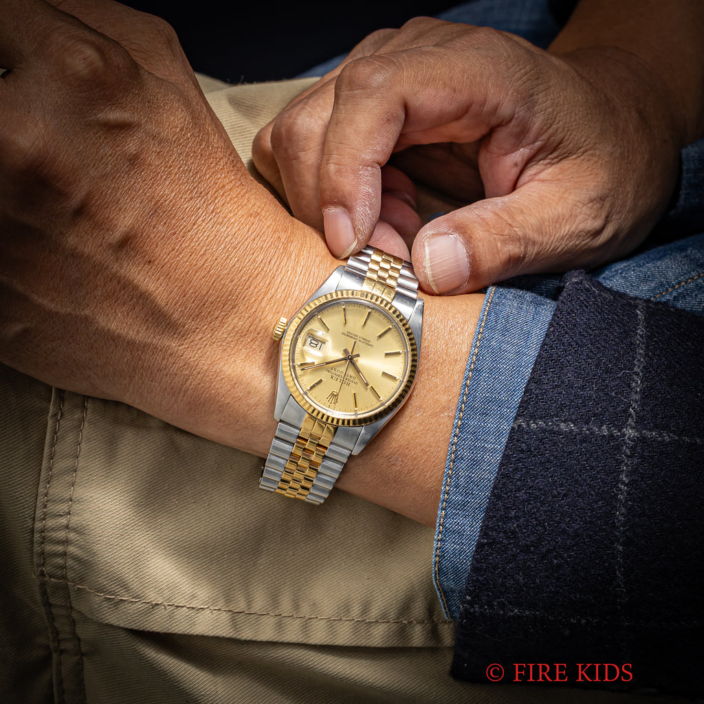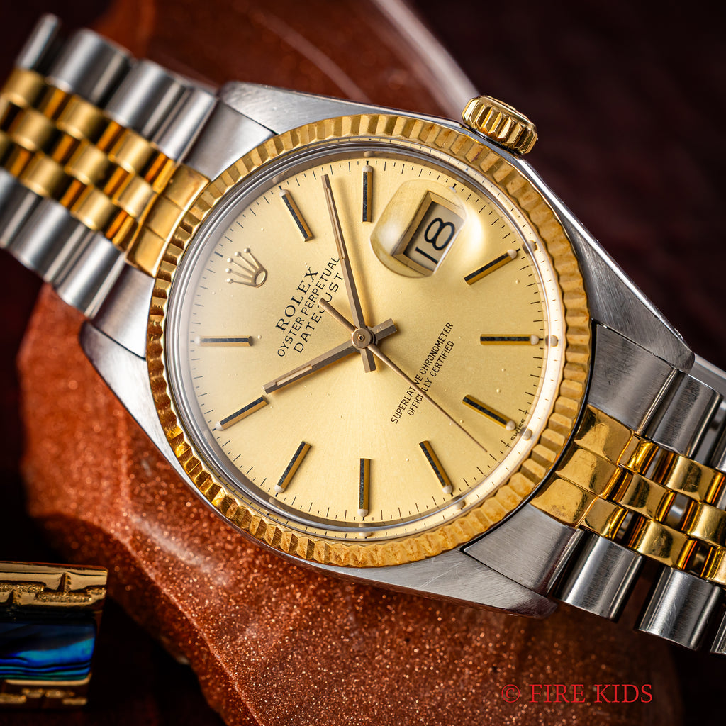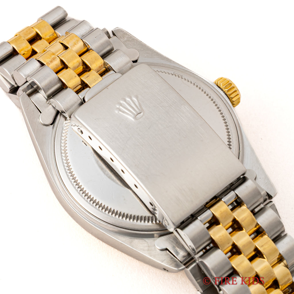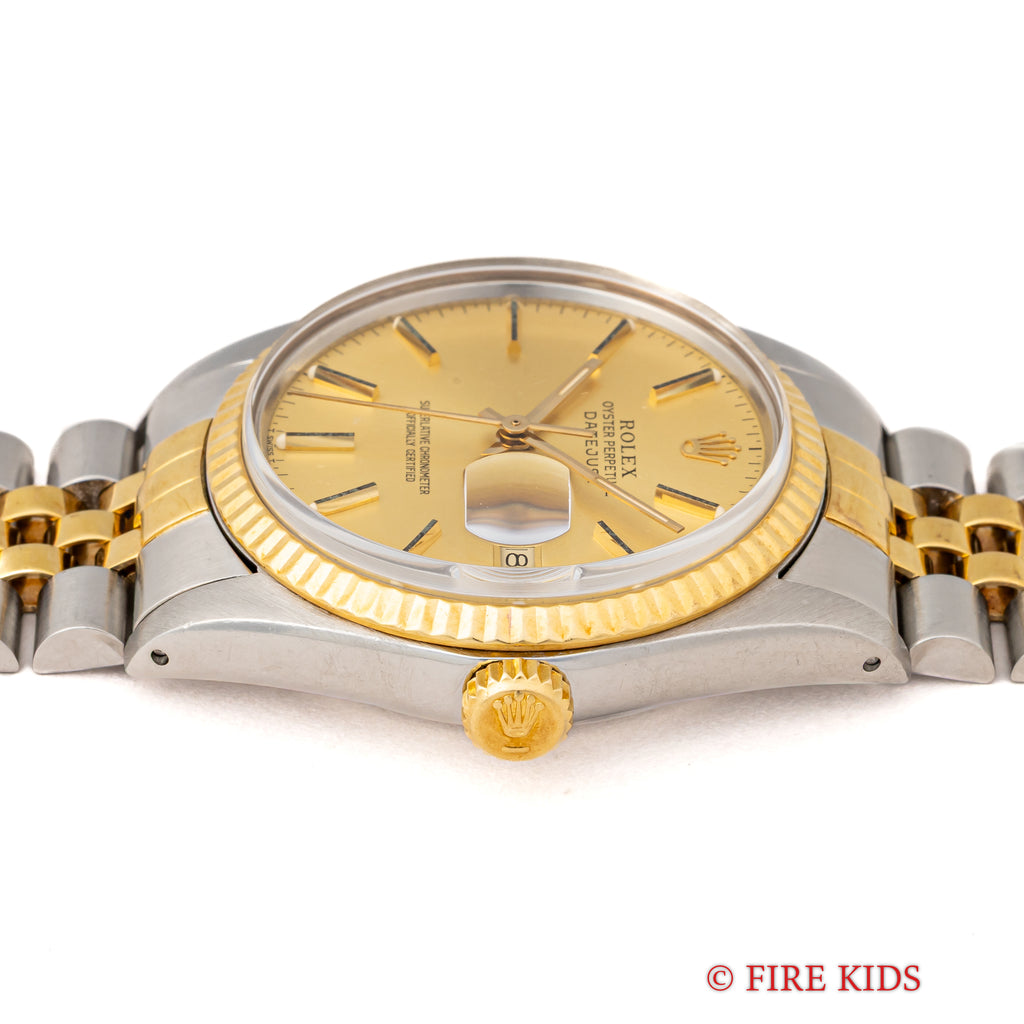 ロレックス 1985年製 デイトジャスト コンビ Ref.16013 自動巻 トリチウム夜光の入荷になります。ケース素材はステンレスとイエローゴールドのコンビに文字盤はシャンパンゴールドダイヤルで大人な雰囲気を感じる組み合わせです。ムーブメントは前モデルのCal.1570からハイビートのCal.3035を搭載。ケースは小キズが見られますが大きなダメージはありません。ベルトは純正コンビジュビリーが取り付けてあります。リューズのねじ込みや手巻き針回しの操作もスムースです。こちらの時計は分解掃除済みです。