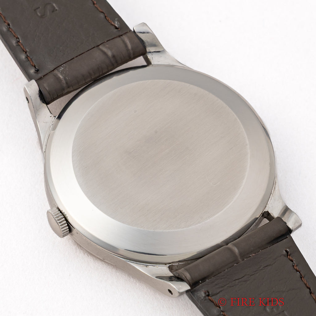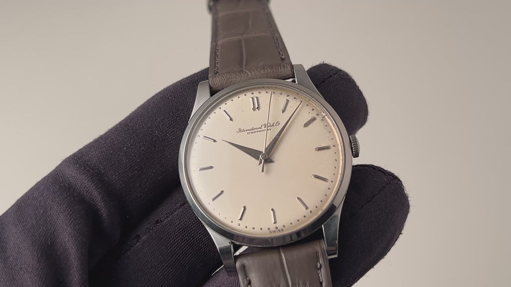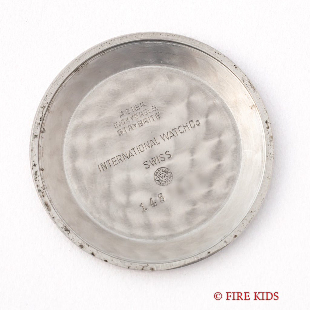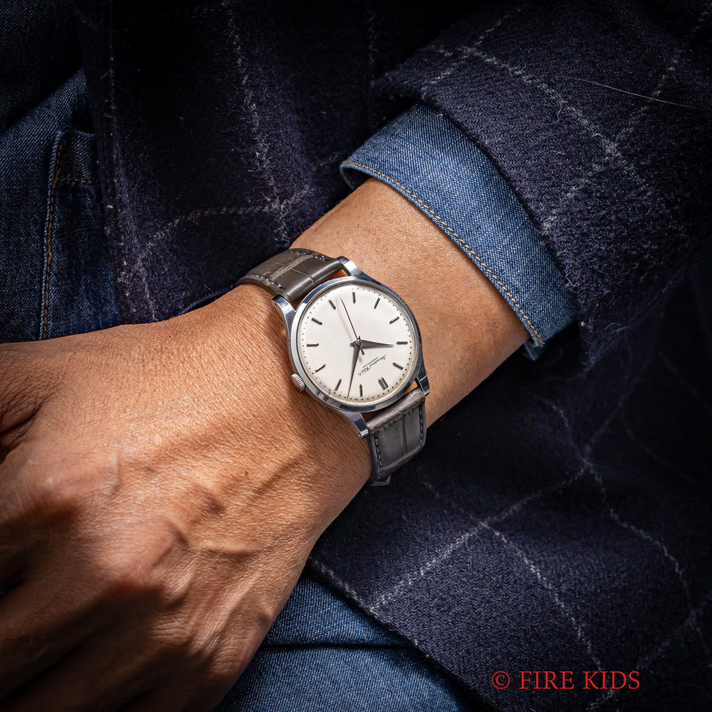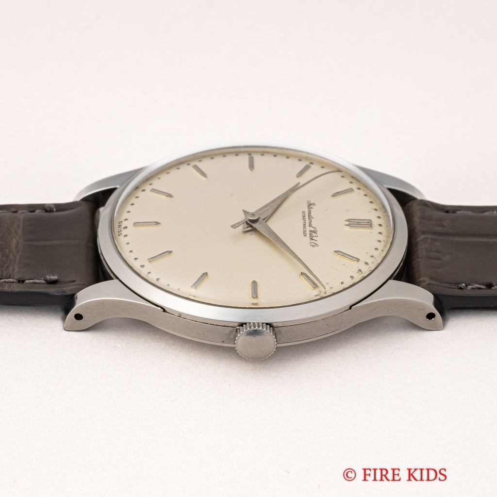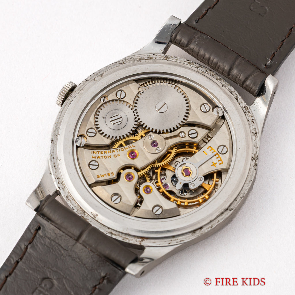 インターナショナルウォッチカンパニー1958年製 ラウンド手巻モデルです。搭載キャリバーはマークⅪに採用されている事でも有名な手巻きの名機Cal.89。ケースはシンプルなラウンド型で、IWCらしい質実剛健さを感じる一本です。文字盤は砲弾インデックス、パールドットの組み合わせに全体が経年変化したヴィンテージらしい雰囲気になっています。ケースは小傷と僅かにスが出ていますが、大きなダメージはございません。手巻きや針回しの操作はスムーズです。ベルトはファイアーキッズオリジナルのクロコダイル革ベルトを合わせています。