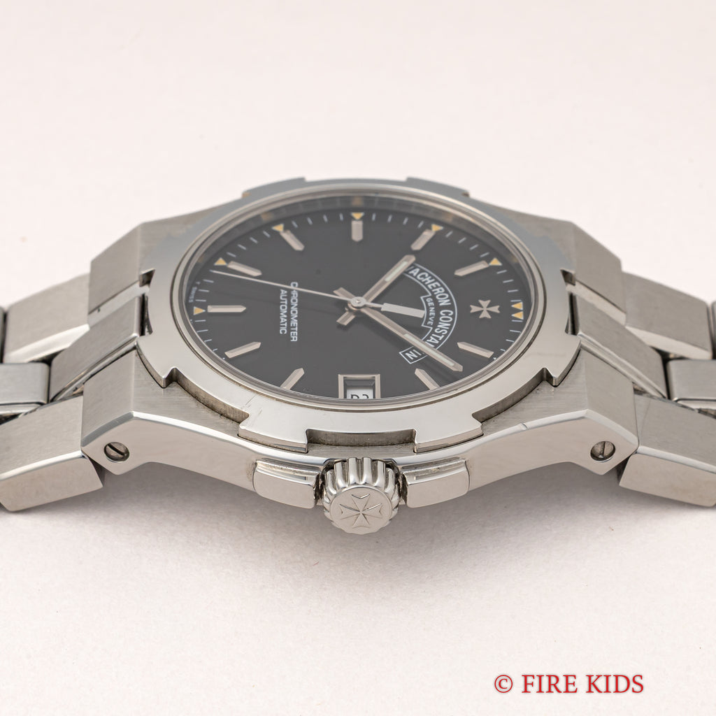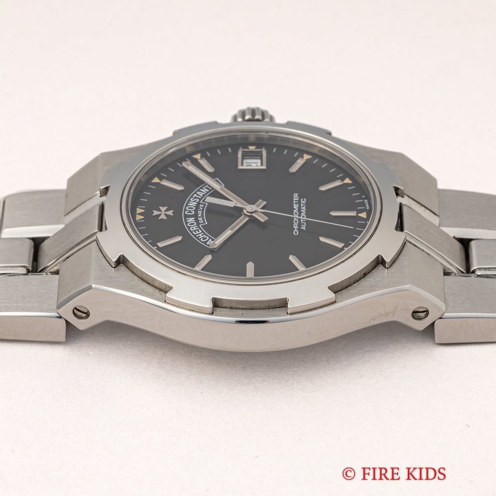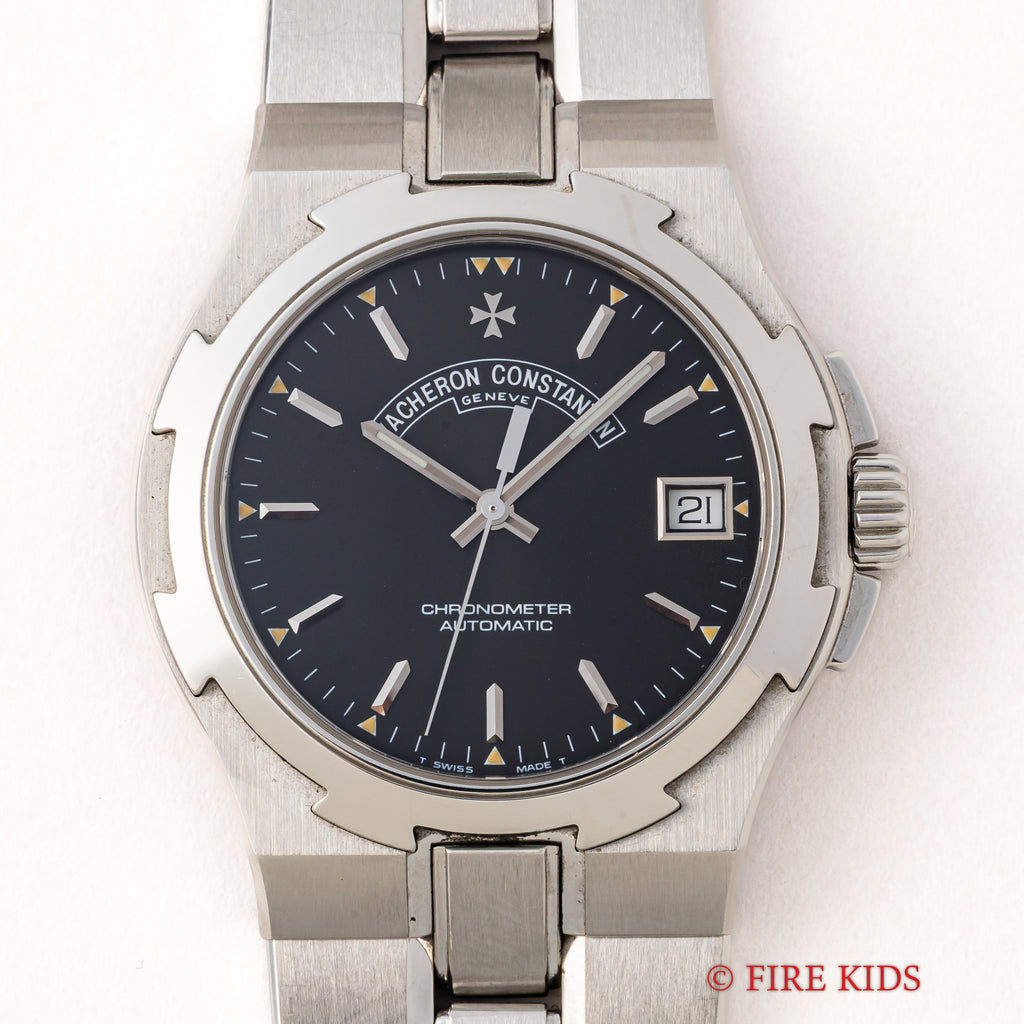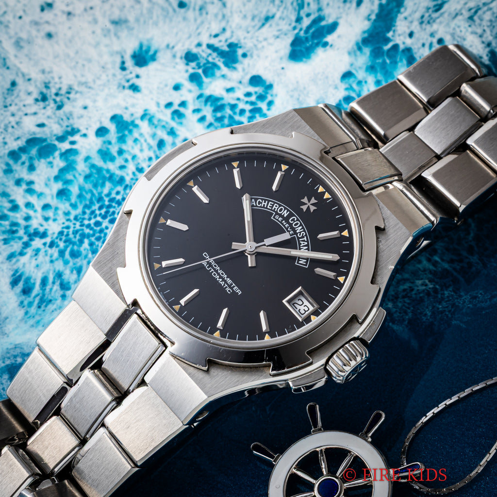オーヴァーシーズ 第一世代 37mmラージケース 1999年製 箱、ギャラ付きです。1996年にヴァシュロン初のステンレススポーツモデルとして発表されたオーヴァーシーズですが、35mmのミディアムケースと37mmのラージケースでの展開でした。こちらはメーカーで針は交換して新夜光になっています。ブラック文字盤はトリチウムの夜光塗料が欠落する事なく残り、ダメージのない綺麗な状態です。ケースはマルタ十字をモチーフにデザインされ、小傷が見られますが大きなダメージはありません。ムーブメントはCal.1311を搭載、手巻きや針回しの操作はスムースです。ベルトは純正のステンレスブレスが取り付けられています。こちらは2023年11月にコンプリートサービスを受けております。