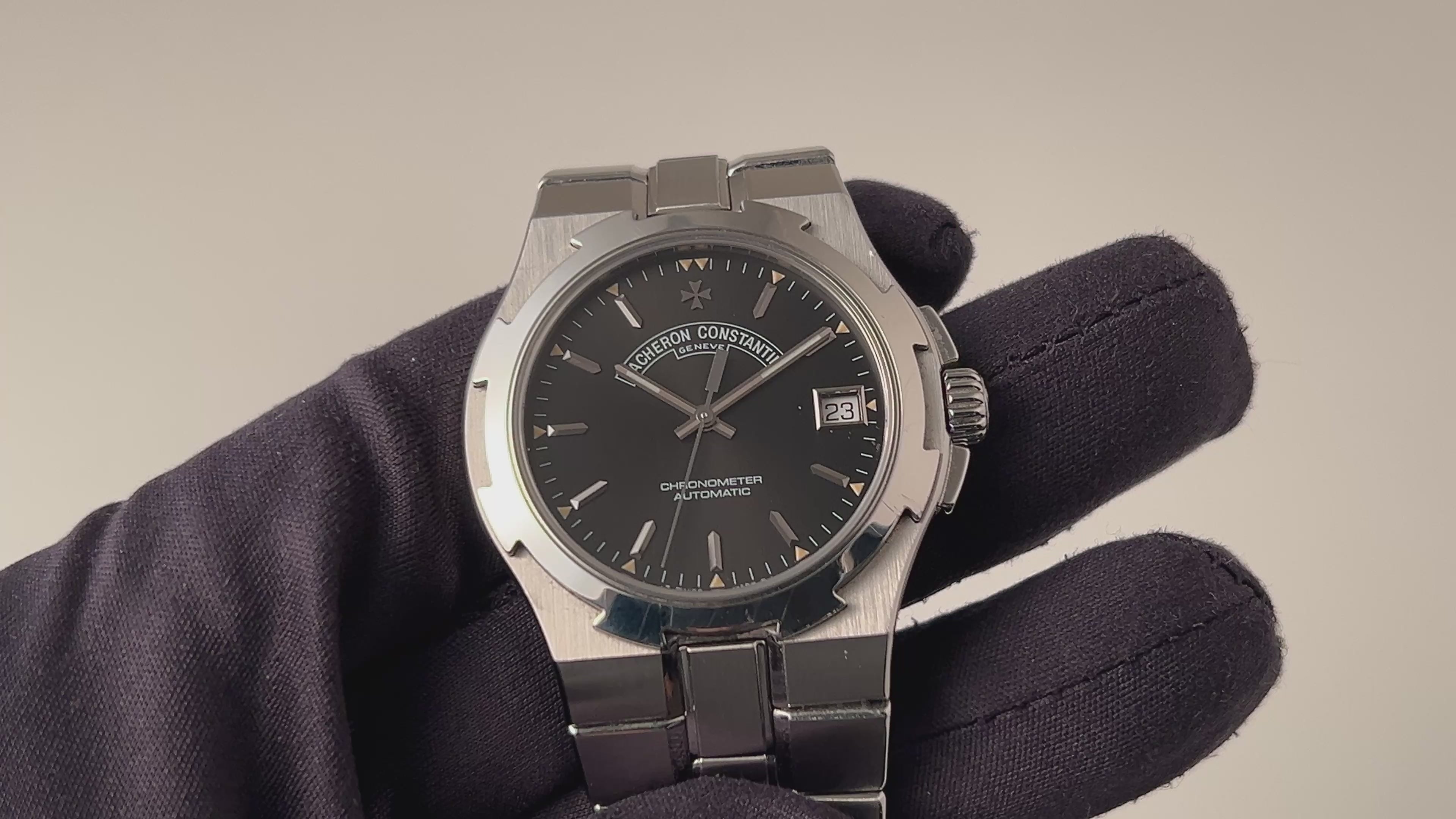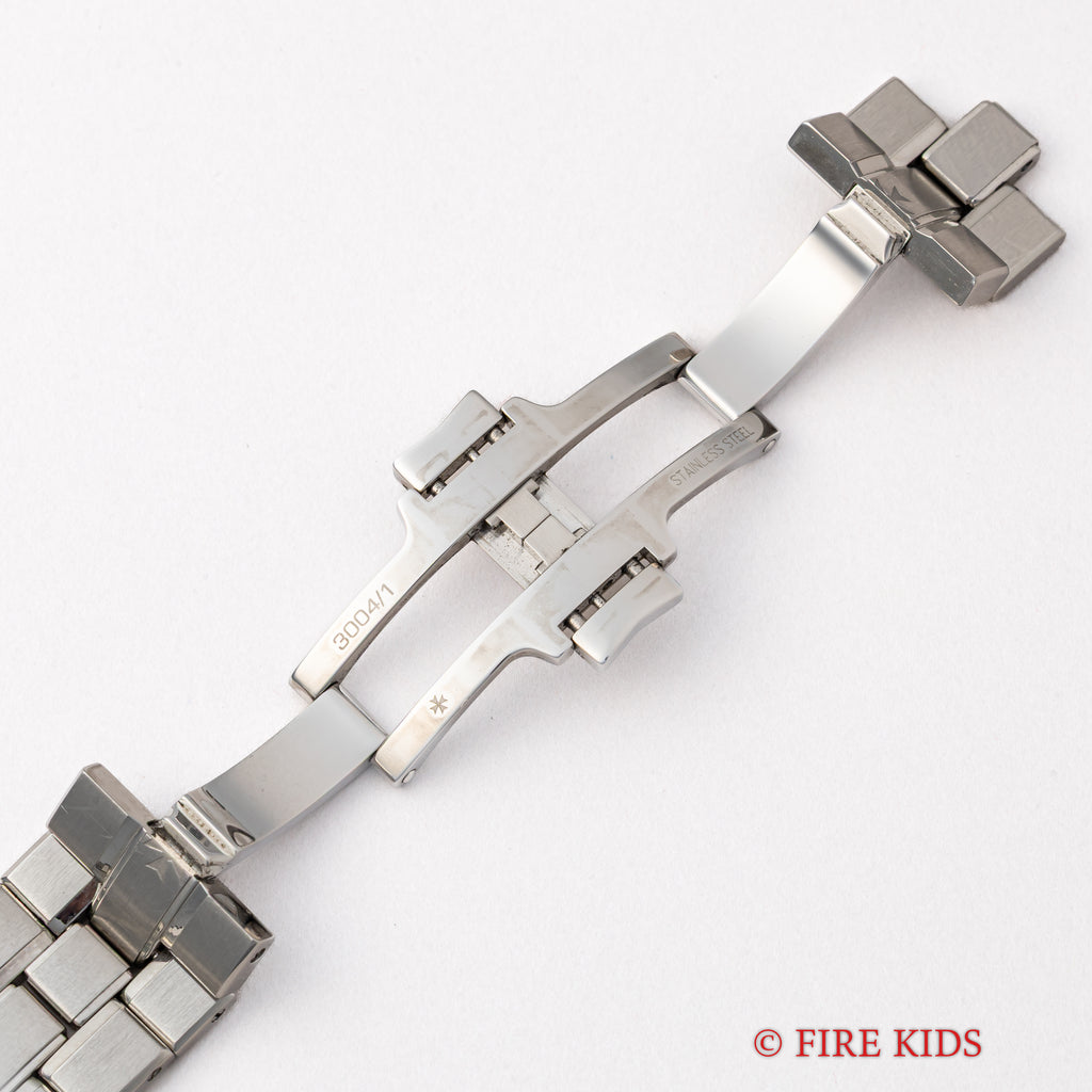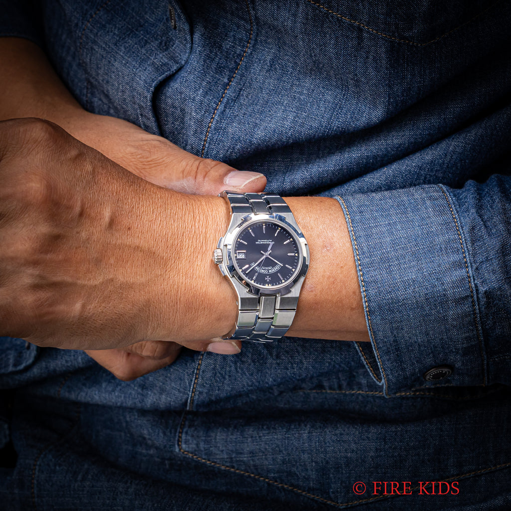 オーヴァーシーズ 第一世代 37mmラージケース 1999年製 箱、ギャラ付きです。1996年にヴァシュロン初のステンレススポーツモデルとして発表されたオーヴァーシーズですが、35mmのミディアムケースと37mmのラージケースでの展開でした。こちらはメーカーで針は交換して新夜光になっています。ブラック文字盤はトリチウムの夜光塗料が欠落する事なく残り、ダメージのない綺麗な状態です。ケースはマルタ十字をモチーフにデザインされ、小傷が見られますが大きなダメージはありません。ムーブメントはCal.1311を搭載、手巻きや針回しの操作はスムースです。ベルトは純正のステンレスブレスが取り付けられています。こちらは2023年11月にコンプリートサービスを受けております。