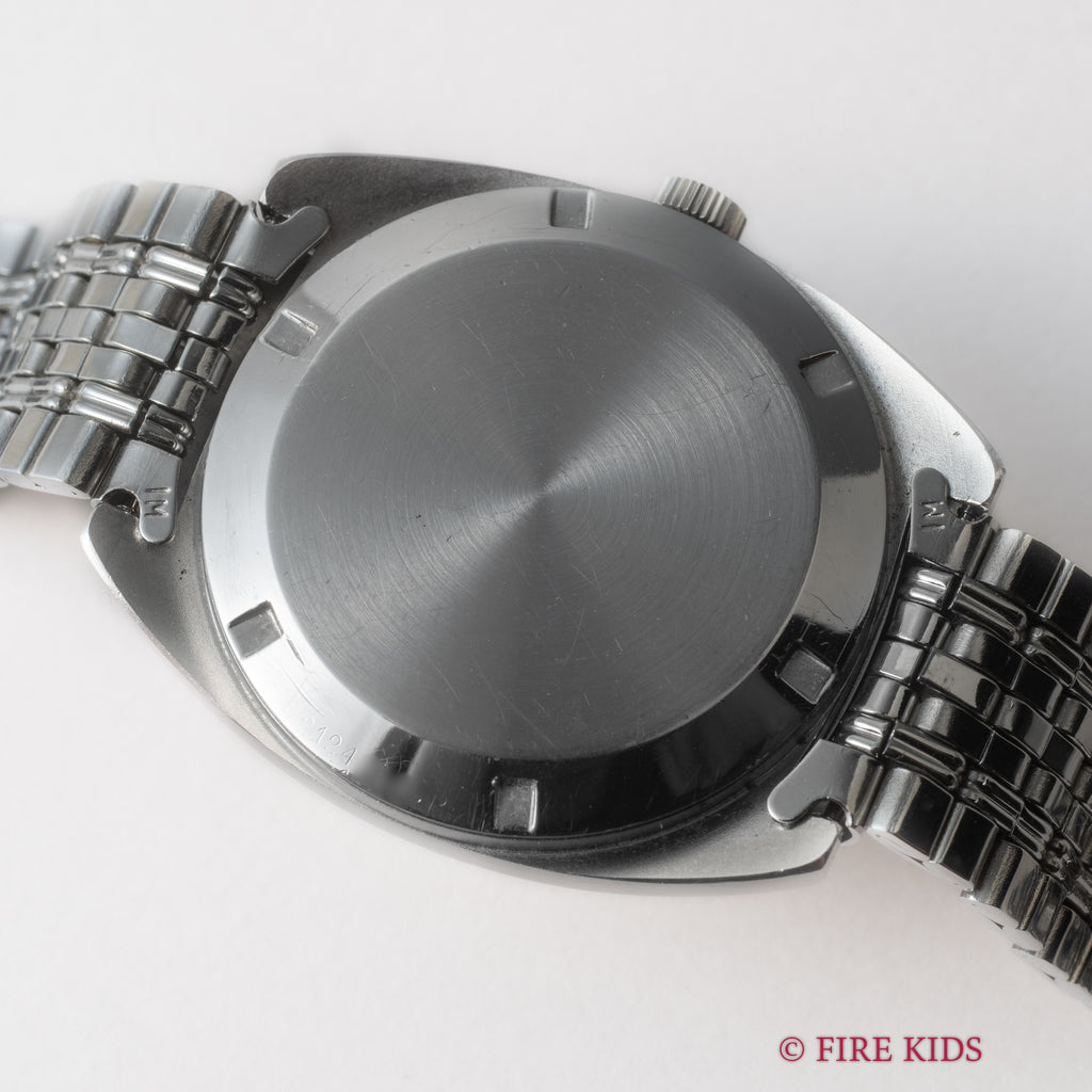1971年製のIWCオートマチックモデルです。ステンレス製のケースに筆記体とIWCの両方が表記された文字盤の組み合わせです。お魚リューズでスクリューバックの防水仕様で日付け合わせが便利な後期のペラトン式巻き上げムーブメントCal.8541Bを搭載しています。文字盤の状態も良くケースも小キズが見られますが大きなダメージはありません。ブレスは純正のゲイフレアーブレスが装着されています。手巻きや針回しの操作はスムースです。