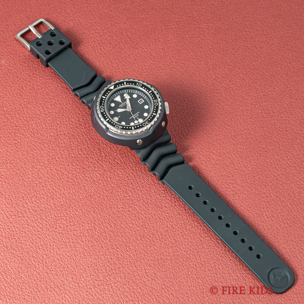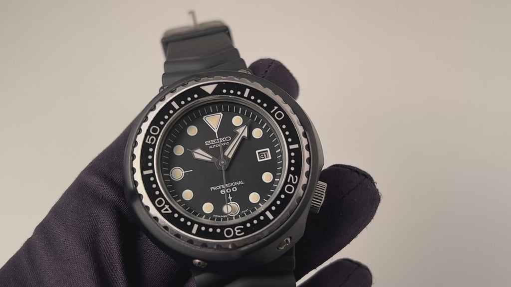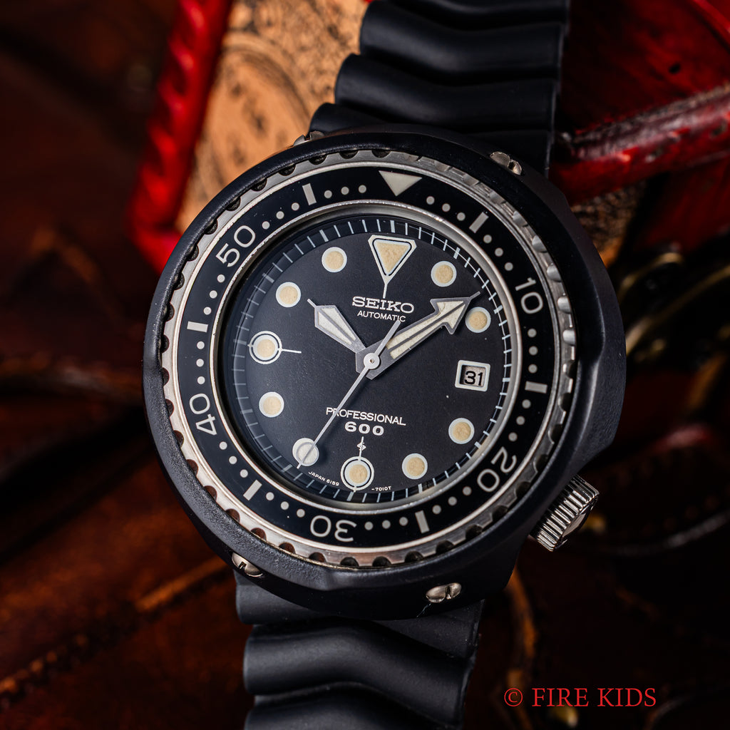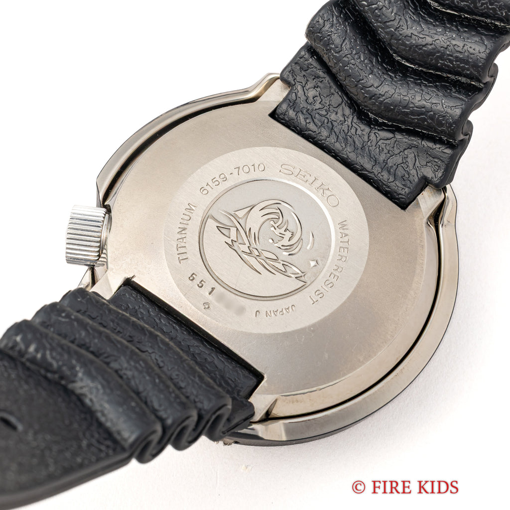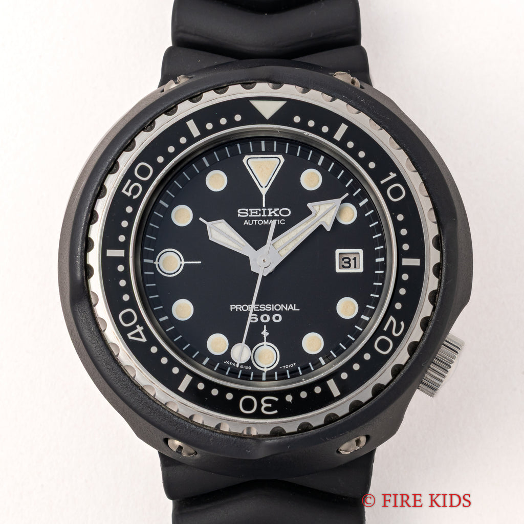 セイコー 600mプロフェショナルダイバー初期型 1975年製 Ref.6159-7010 元祖 ツナ缶 10振動自動巻の入荷になります。世界初のチタンケースを採用した本格ダイバーズRef.6159-7010です。50㎜の大型ケースは存在感がございます。ラグ足が無くケースにバンドが直接付いている為大型ケースではございますが、腕のおさまりの良い時計です。文字盤、針ともに良い状態でケースに関しても、9~10時位置にスレ傷はございますがその他は殆どダメージを感じません。針回し、ベゼル、リューズのねじ込みの操作はスムーズです。ベルトは純正のラバーベルトに純正尾錠が取り付けられています。
