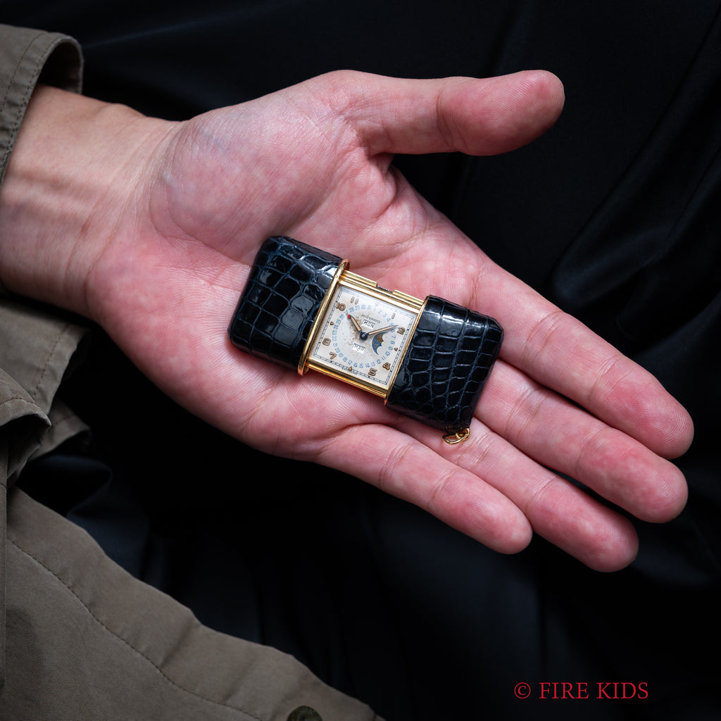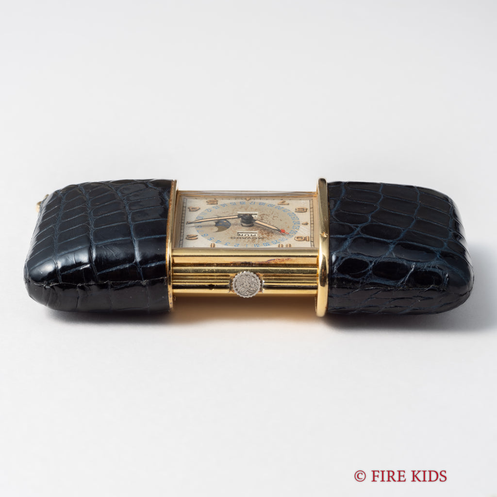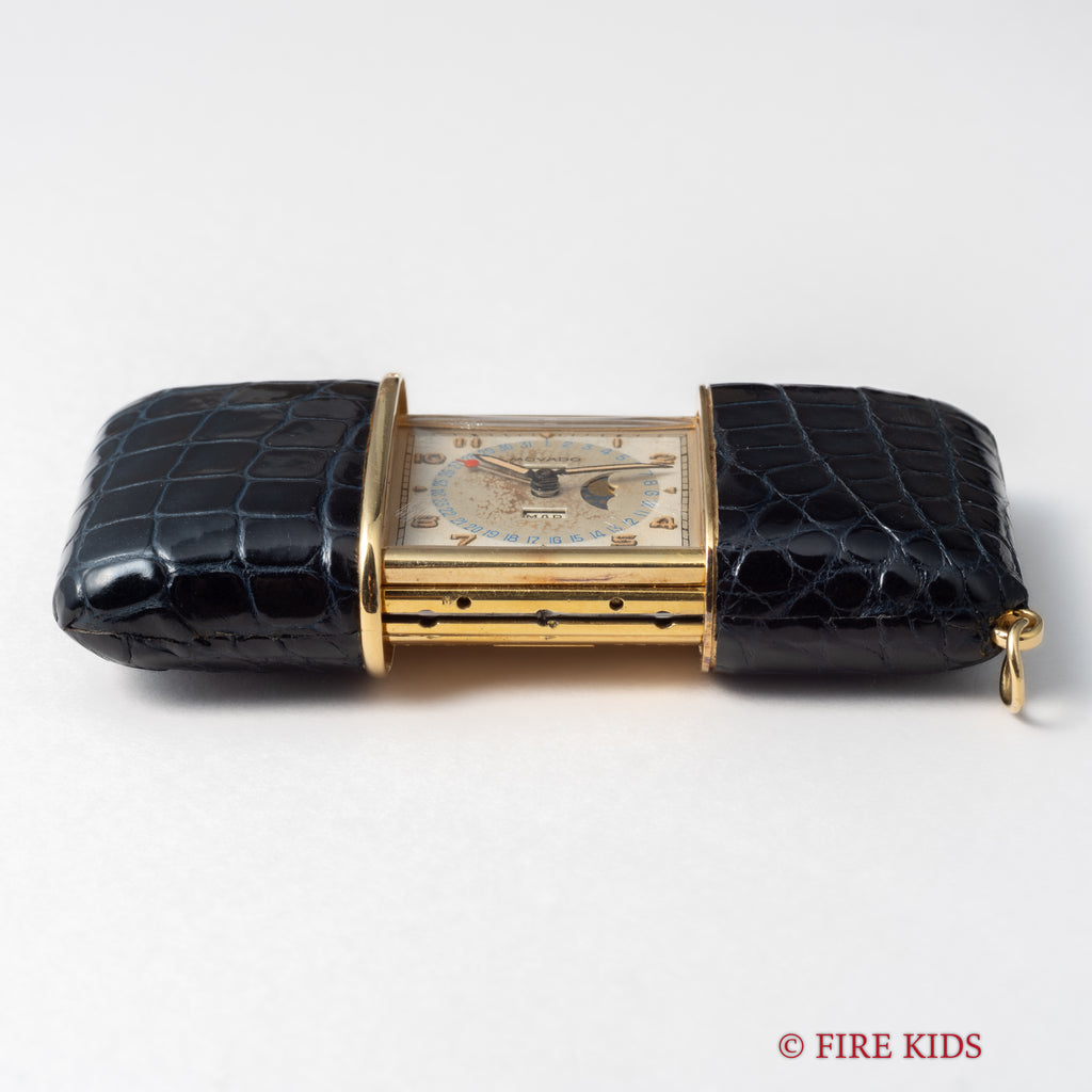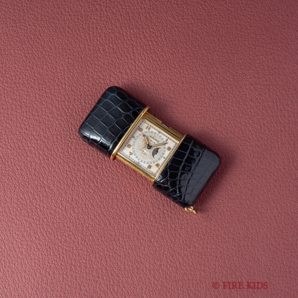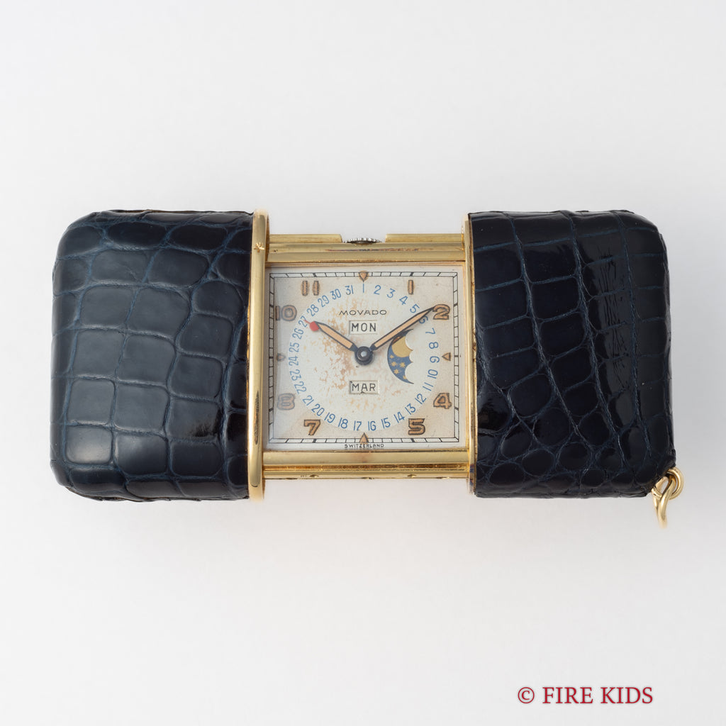 モバード カレンドエルメト トリプルカレンダームーンフェイズ 革巻き トラベルウォッチ 半自動手巻き 1940年代製の入荷になります。1940年代に製造されたトラベルウォッチでコンパクトなサイズにトリプルカレンダームーンフェイズを搭載しています。開閉時にゼンマイが巻き上がる半自動式の手巻モデルです。背面にスタンドが付いていますのでデスクウオッチとしてもお使いになれます。文字盤表面に劣化が見られますが良い雰囲気になっています。革の状態は良く剥がれはありません。手巻きや針回し、カレンダーの送りの操作はスムースです。