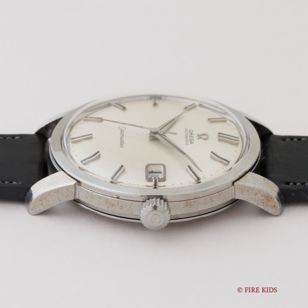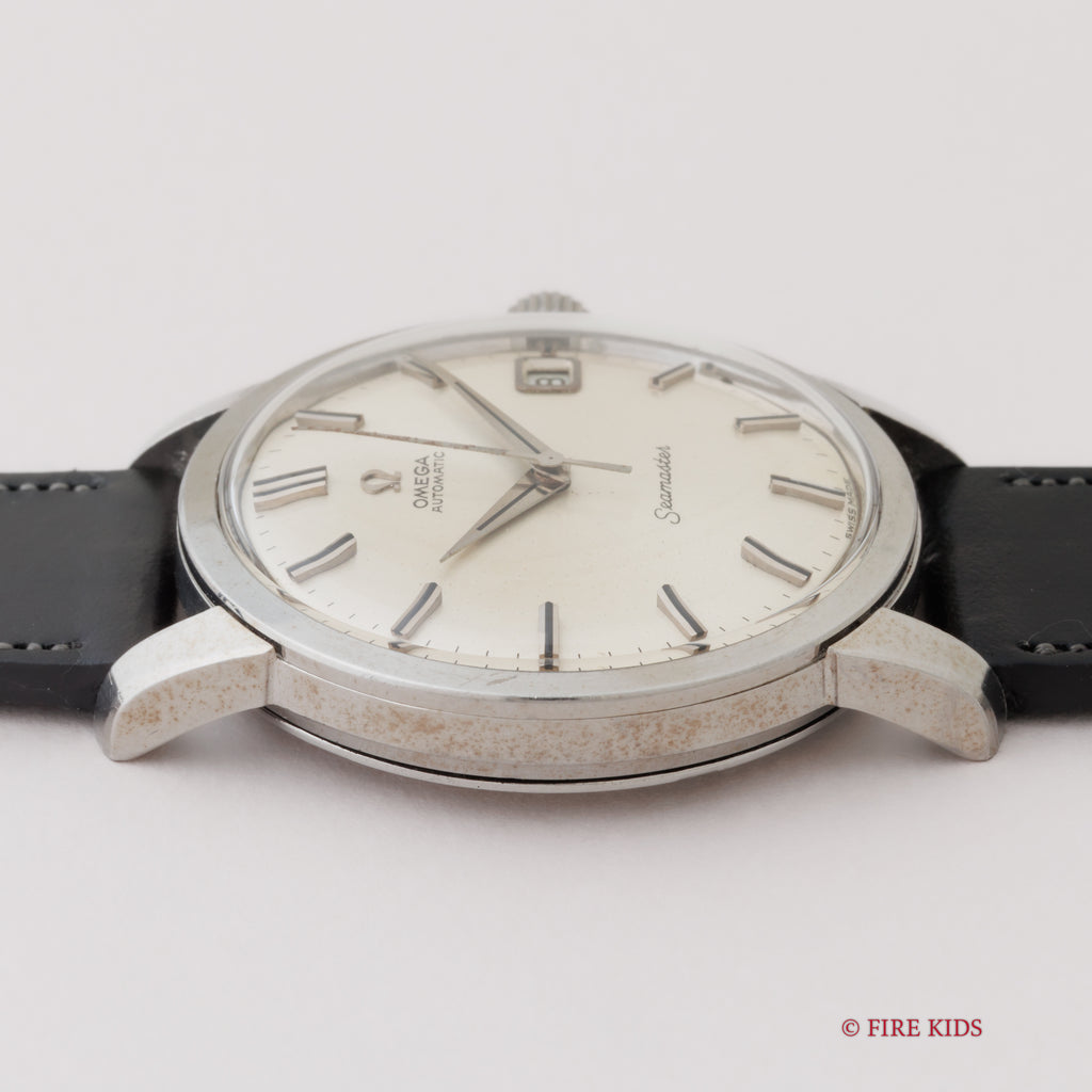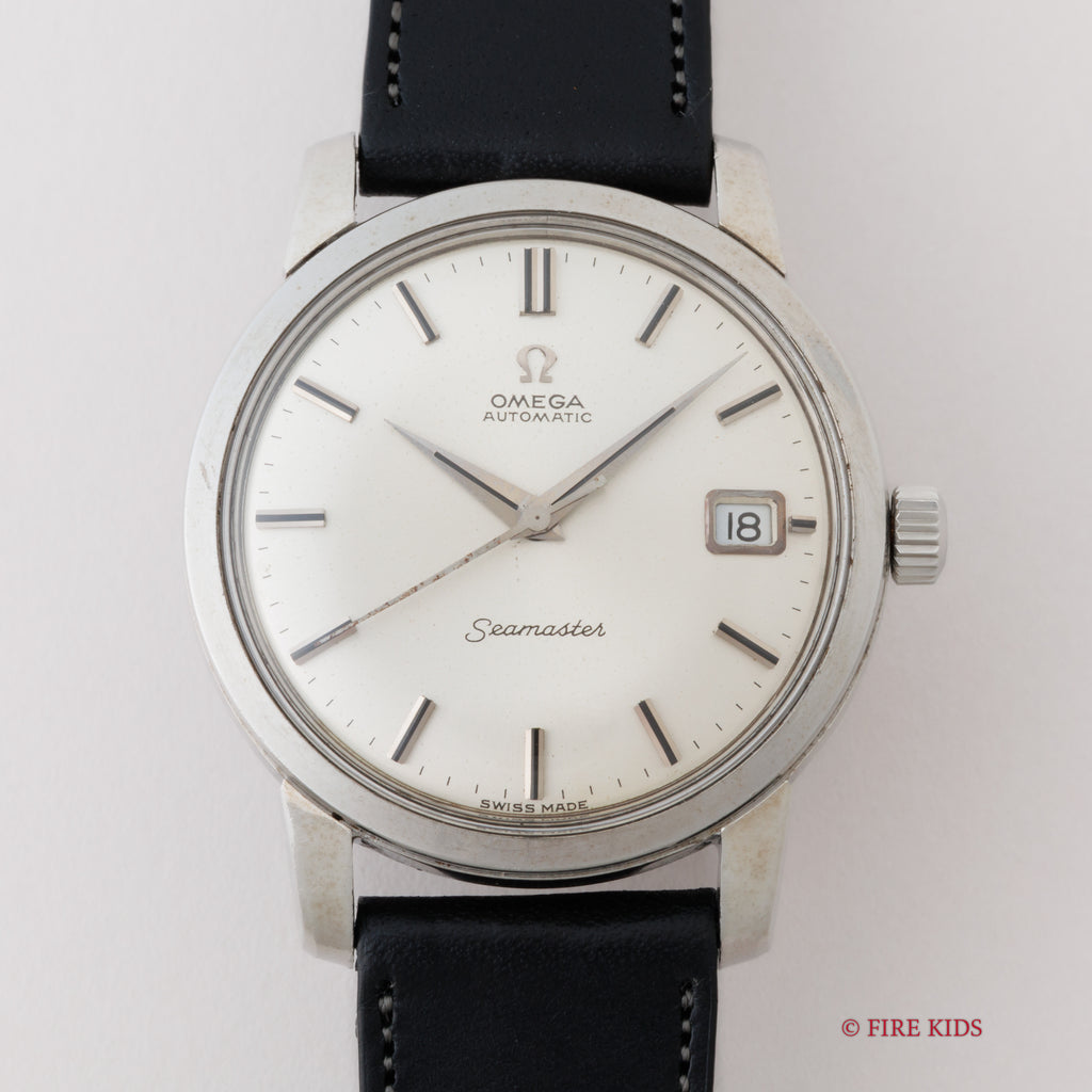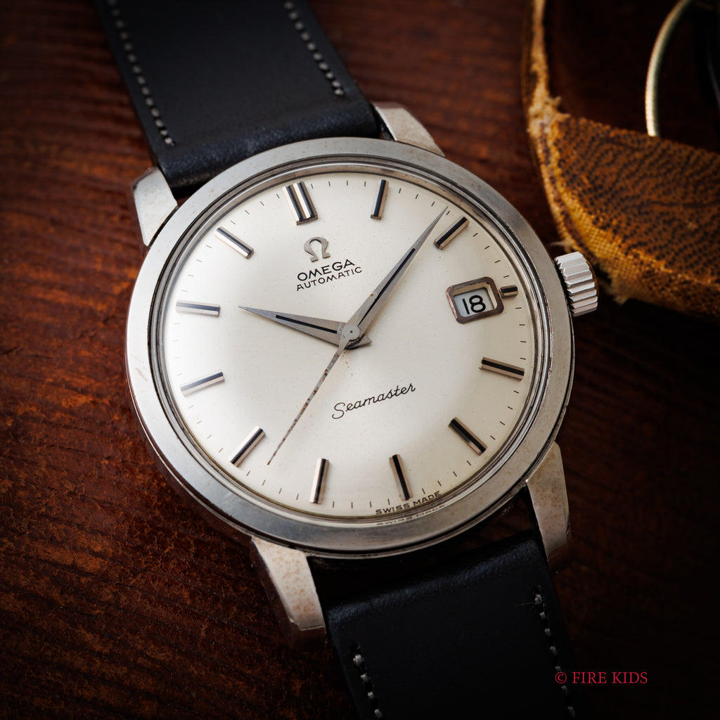 1965年製のオメガシーマスターです。シンプルで飽きの来ないデザインが魅力的な定番のヴィンテージのシーマスターです。ベゼルが幅広く、ラグも太く存在感があります。文字盤、ケースともに年代なりの経年はありますがヴィンテージの良い雰囲気です。ムーブメントは赤金メッキが施された自動巻きのCal.562を搭載。日付の変わる12時付近を針回しで行ったり来たりすることで早送りが可能です。手巻きや針回しの操作はスムースです。ベルトはファイアーキッズオリジナルのブッテーロカーフレザーを合わせています。