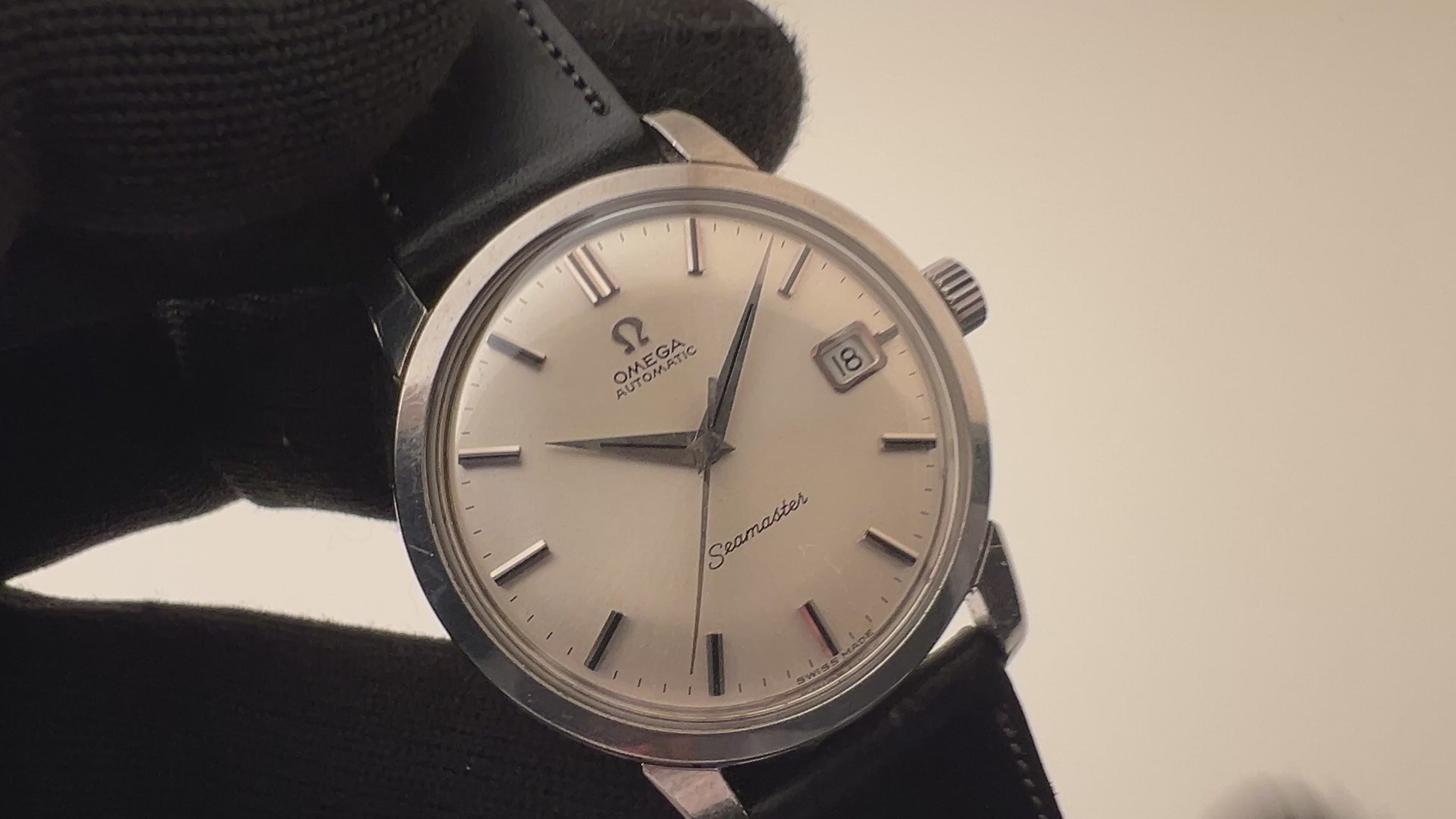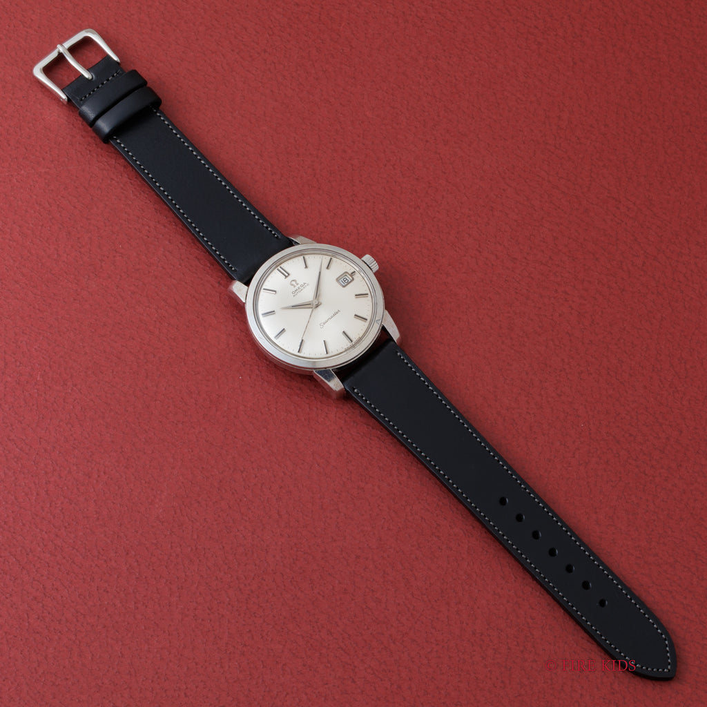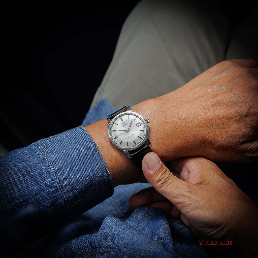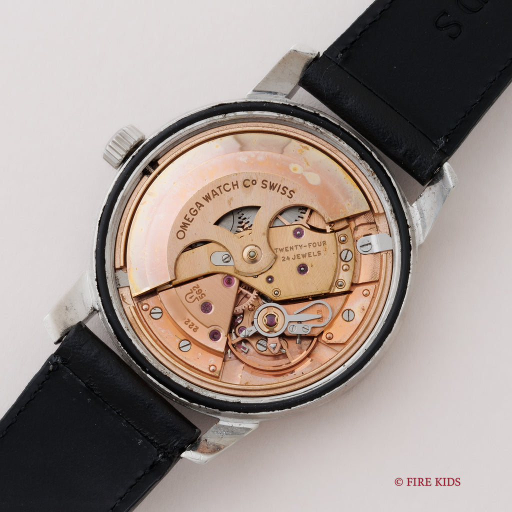 1965年製のオメガシーマスターです。シンプルで飽きの来ないデザインが魅力的な定番のヴィンテージのシーマスターです。ベゼルが幅広く、ラグも太く存在感があります。文字盤、ケースともに年代なりの経年はありますがヴィンテージの良い雰囲気です。ムーブメントは赤金メッキが施された自動巻きのCal.562を搭載。日付の変わる12時付近を針回しで行ったり来たりすることで早送りが可能です。手巻きや針回しの操作はスムースです。ベルトはファイアーキッズオリジナルのブッテーロカーフレザーを合わせています。