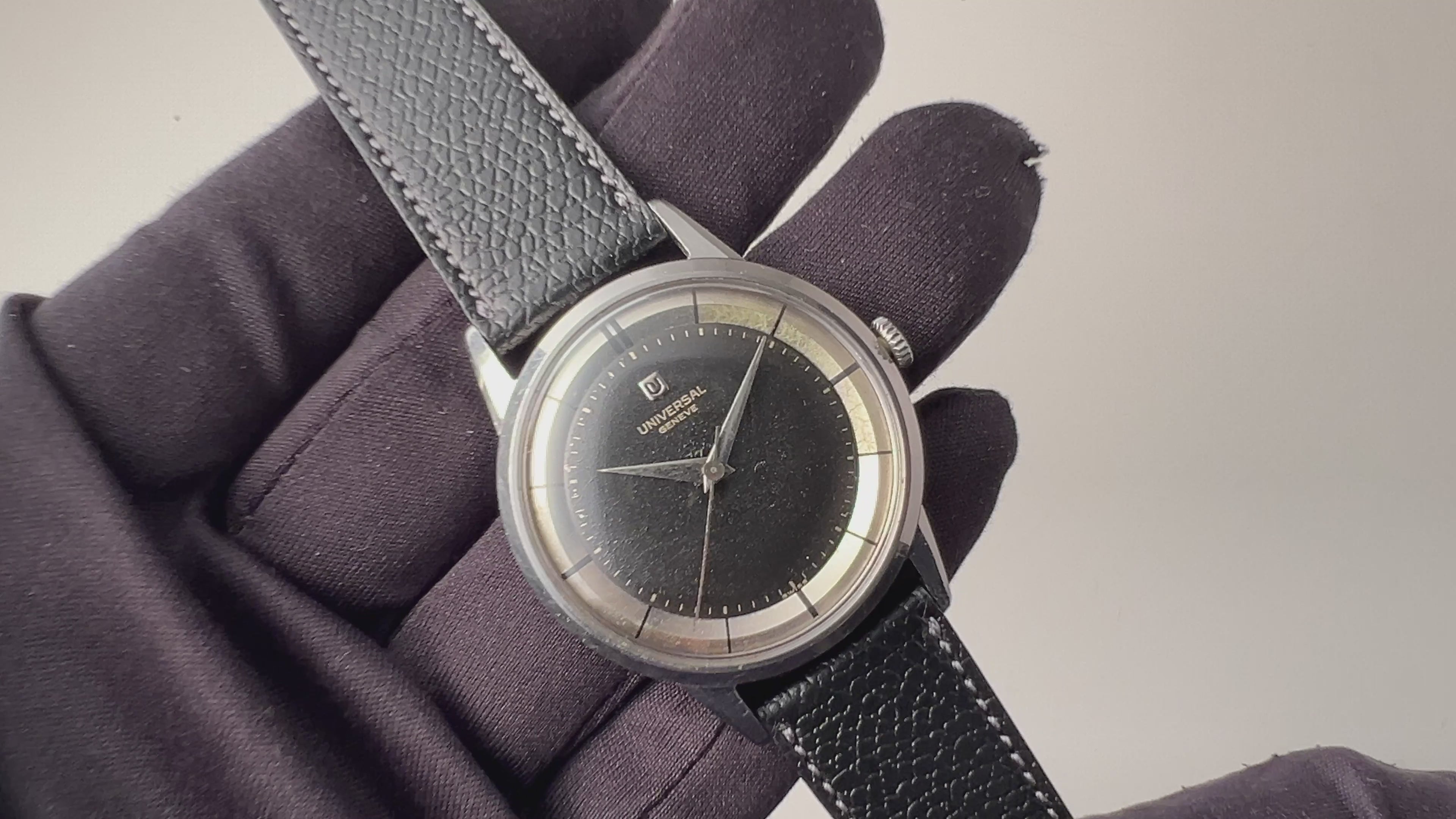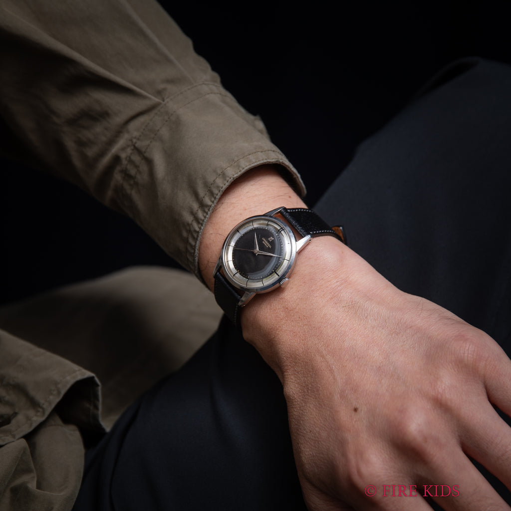 ユニバーサル・ジュネーブ タキシードダイヤル 1950年代製 手巻 Cal.332の入荷になります。初期のポールルーターに見られるタキシードダイヤルで、綺麗とは言えませんが抜群の雰囲気のツートーンダイヤルになっています。ケースは小傷が見られますが大きなダメージはありません。手巻きや針回しの操作はスムースです。リューズは交換されています。ムーブメントは出車式センターセコンドのCal.332を搭載しています。ベルトは社外のカーフが取り付けられています。