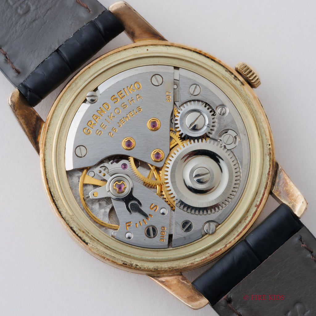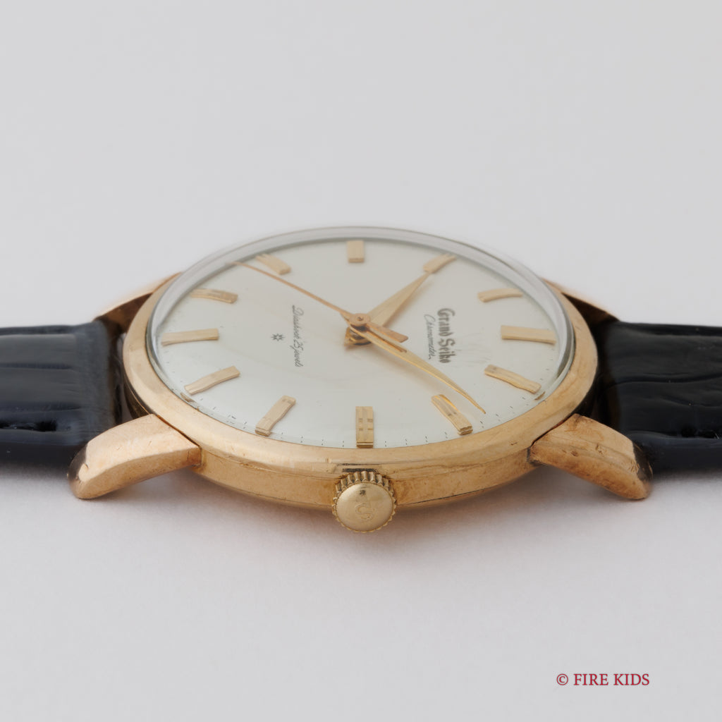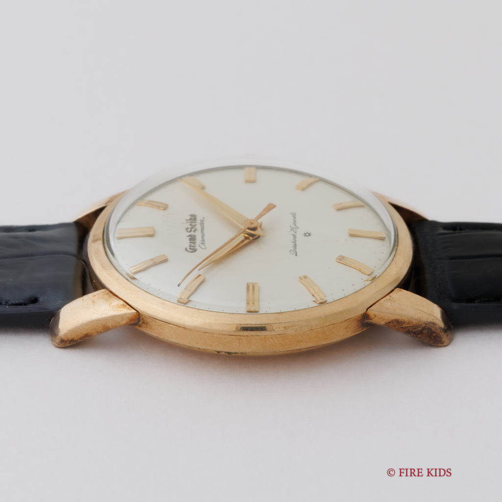 グランドセイコー ファーストモデル 1961年製 Ref.J14070GS 彫文字盤 Cal.3180の入荷になります。セイコーのフラッグシップであるグランドセイコー、その歴史の中でもファーストモデルにあたり、通称「彫り文字盤」と呼ばれる希少文字盤で人気を集めています。彫文字は銀色と初期の特徴があり、珍しい平針です。ケースは14KGFで裏ブタのメダリオンも経年劣化してしまう事も多い中、しっかり残っています。ムーブメントは手巻き25石のCal.3180を搭載。手巻きや針回しはスムースです。 ベルトはファイアーキッズオリジナルのクロコダイル革ベルトが取り付けられています。