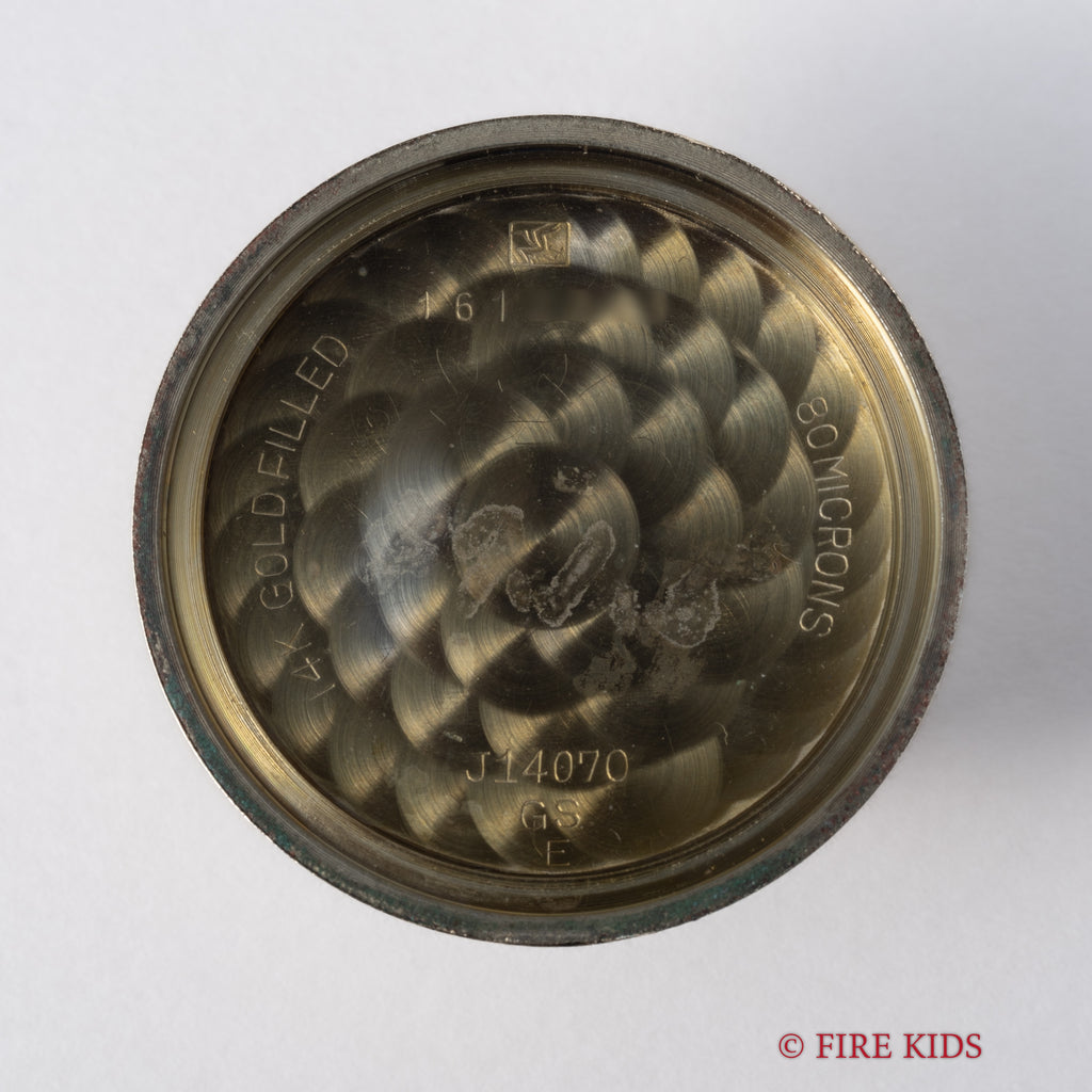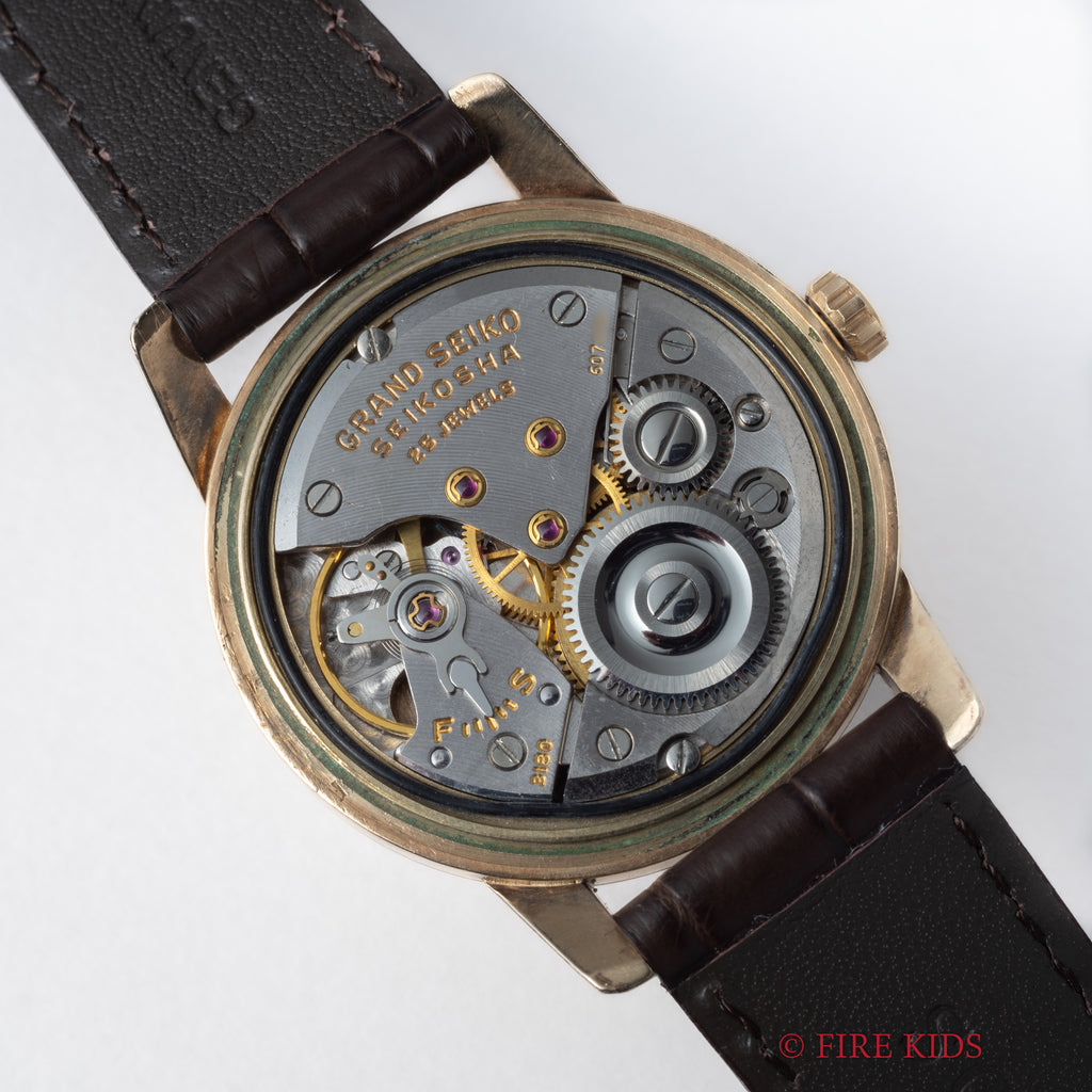 グランドセイコー ファーストモデル 1961年製 Ref.J14070GS 彫文字盤最終 平針の入荷になります。セイコーのフラッグシップであるグランドセイコー、その歴史の中でもファーストモデルにあたり、通称「彫り文字盤」と呼ばれる希少文字盤で人気を集めています。彫文字は銀色と初期の特徴があり、珍しい平針です。ケースは14KGFで裏ブタのメダリオンも経年劣化してしまう事も多い中、しっかり残っています。ムーブメントは手巻き25石のCal.3180を搭載。手巻きや針回しはスムースです。 ベルトはファイアーキッズオリジナルのクロコダイル革ベルトが取り付けられています。