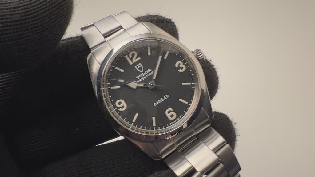 チューダー レンジャー 1977年製 オイスタープリンス 自動巻ノンデイト Ref.9020/0 ロレックスオイスターブレスの入荷になります。人気のノンデイト自動巻モデルです。34㎜(リューズ別)の使い易いサイズ感が魅力になっています。ダイヤルはブラックの色抜けを感じない良いコンディションで、オリジナルのトリチウム夜光も脱落も見られず、針夜光も含めて良い雰囲気の経年変化をしております。ケースも痩せを感じない良いコンディションです。ムーブメントは自動巻きCal.2776を搭載しております。ブレスレットはロレックス純正の巻きオイスターブレスが取り付けられています。