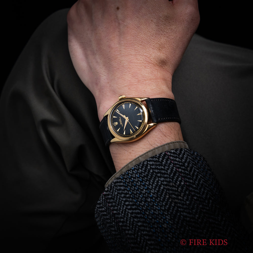 1953年製のロレックス Ref.6084 18金イエローゴールド セミバブルバック ブラックダイヤルが入荷しました。バブルバックより生産期間が短い貴重なセミバブルの18金イエローゴールドケースで更に貴重なブラックダイヤルです。艶が少々飛んでブラウン化が始まっています。楔インデックスにドーフィンハンドの組み合わせもカッコいいです。ケースはやや磨きを感じますが金ケースなので致し方ないかと思います。裏蓋表側の溝に工具を滑らせた跡があります。その他大きなダメージはなくこの年代としては良好なコンディションです。ベルトはアキュレイトフォルムの革ベルトに純正GP尾錠を合わせています。手巻きや針回しはスムーズです。こちらはねじ込み無しのスーパーオイスターリューズです。
