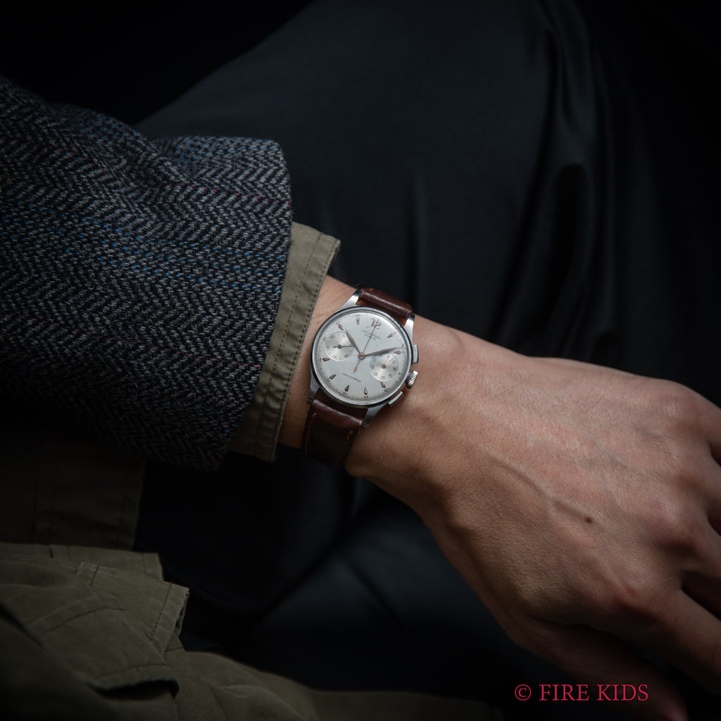 ユニバーサル・ジュネーブ ユニコンパックス 1940年代製 手巻 Cal.285 彫インデックスの入荷になります。40年代後半の時計で2レジスタークロノグラフ、リーフハンドや彫文字盤等ヴィンテージ感があります。文字盤表面の荒れ等がございますが良い雰囲気になっています。ケースは小傷が見られますが大きなダメージはありません。ムーブメントはユニバーサル・ジュネーブを代表するCal.285を搭載しています。手巻きや針回し、クロノグラフの操作はスムースです。ベルトは社外のカーフが取り付けられています。