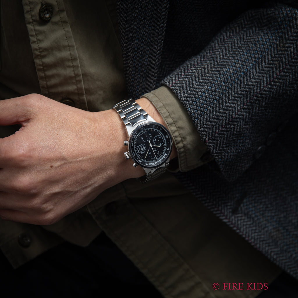 2002年製のIWC GSTクロノグラフ Ref.3707が入荷しました。GSTシリーズは1997年~2003年頃に発売されたG(ゴールド)S(ステンレス)T(チタン)素材を使用したモデルです。本個体はケース、ブレスともにステンレス素材を採用したモデルで、無骨な雰囲気のある一本となっています。ダイヤル、ケースともに多少の使用傷や経年はありますが大きなダメージはありません。ベルトは純正ステンレスブレスが付いています。こちらはギャラ、冊子、クロス、修理明細。ピン抜きが付属いたします。