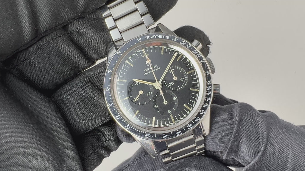 オメガ スピードマスター3rdモデル 1963年製 Ref.105.003 Cal.321 キャタピラブレスの入荷になります。アポロ計画に採用され月に到達するスピードマスターですが3rdモデルがNASAの厳しい試験をクリアした結果です。3rdモデルまでの左右対称ケースが特徴でブレス幅も19mm(4th以降は20mm)になっています。Professional表記(NASAに採用されてから表記されます)が無いのもシンプルで格好良いです。装着感も4thに比べると小振りな印象です。オリジナルの文字盤は夜光の変色はありますがシミ等は無く良い状態です。ベゼルに部分的に塗装の剥がれが見られます。ケースやブレスは小キズが見られますが大きなダメージはありません。ムーブメントは非常に綺麗な状態です。手巻きや針回し、クロノグラフの操作はスムースです。ブレスはキャタピラブレスが取り付けられています。