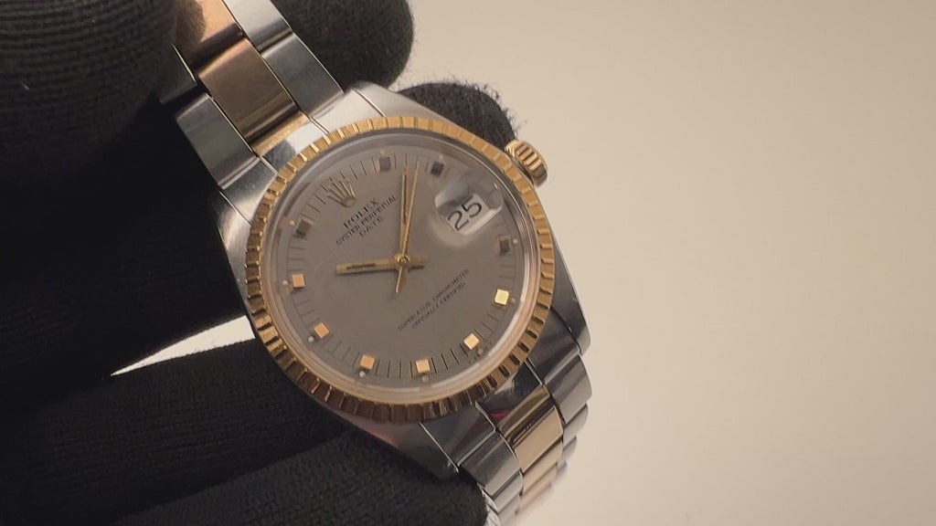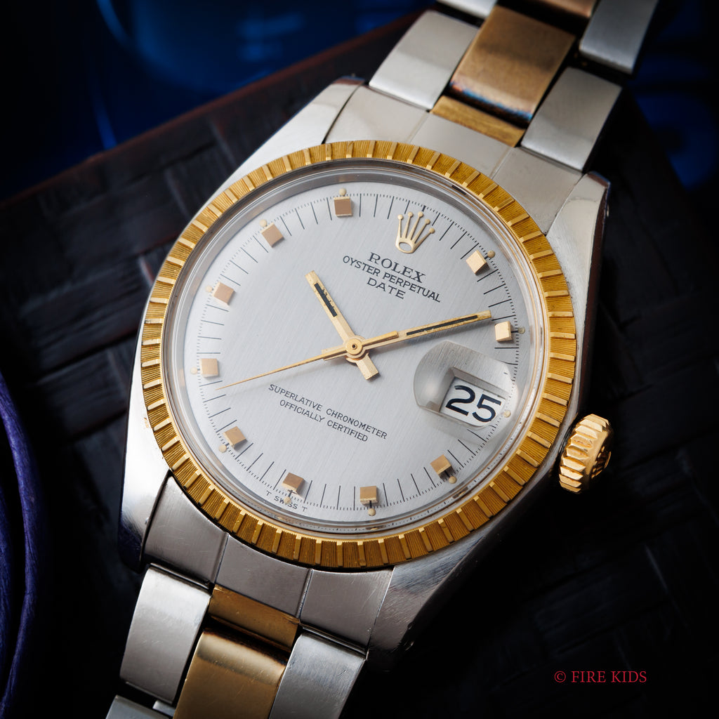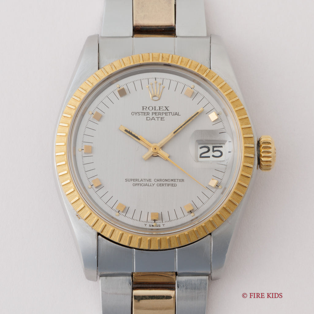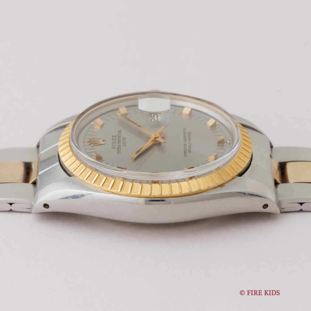 ロレックス 1974年製 オイスターパーペチュアルデイト コンビRef.1505 ショートインデックス 純正ブレスの入荷になります。オイスターパーペチュアルデイトの中では珍しいコンビケースに、細かな刻みの入るエングレーブドベゼルがデイトジャストとはまた違った印象です。文字盤は立体的なスクエアインデックスが目を引きます。ケースは小傷はございますが大きなダメージはございません。ムーブメントは自動巻きのCal.1570を搭載。リューズのねじ込み、手巻きや針回しの操作はスムースです。ベルトは純正の3連コンビブレス7835/FF257が取り付けてあります。こちらは分解掃除済みです。