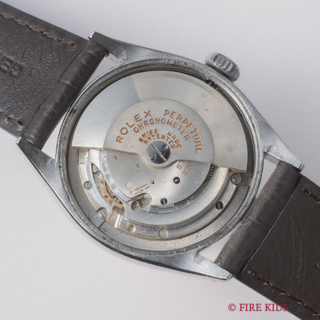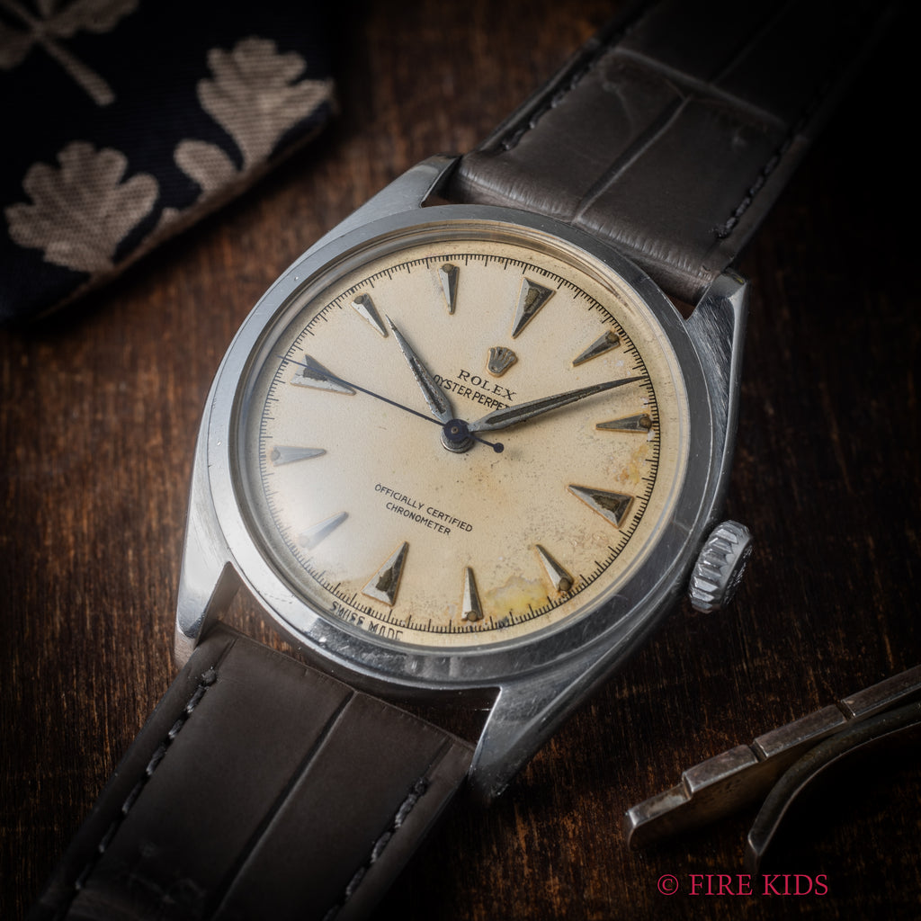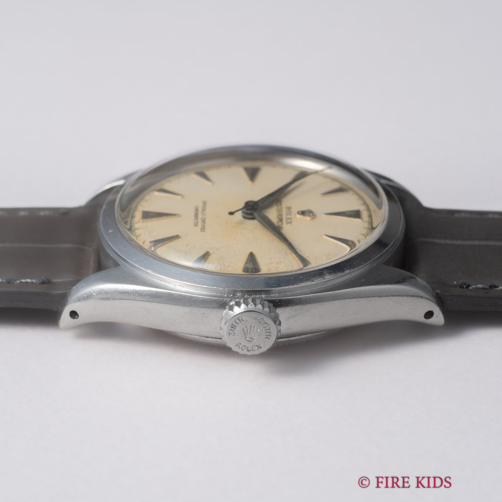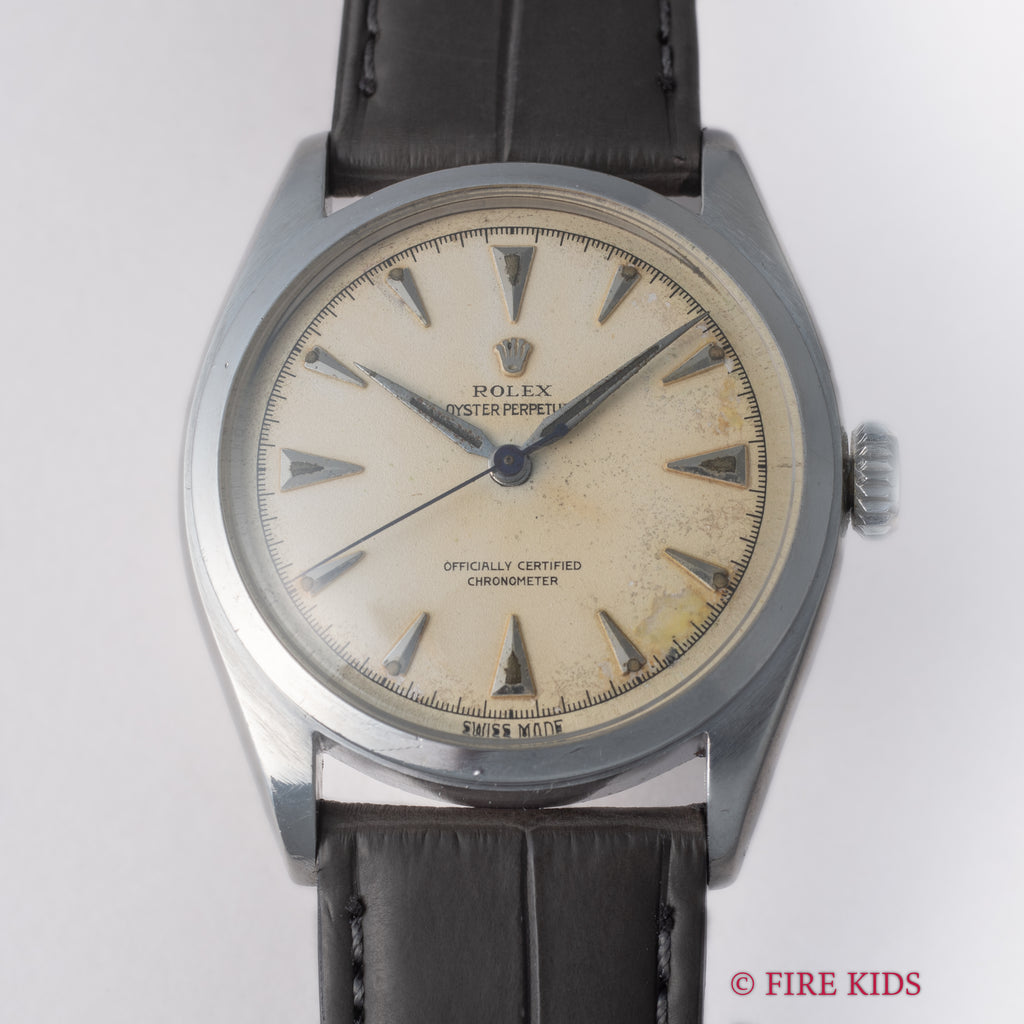 セミバブルバックはバブルバックより製造期間が短く、希少なモデルです。後年の両方向巻き上げの機械を搭載したモデルに比べて機械、裏蓋が膨らんでいるのでヴィンテージ感をより感じて頂けますし、腕の乗り心地も良いです。ダイヤルは楔インデックスダイヤルで、エイジングも進んでブラウンカラーになってきてます。。ケースは小傷はありますが大きなダメージはありません。手巻きや針回しはスムーズです。リューズはやはり製造期間が短いスーパーオイスターリューズです。ベルトはファイアーキッズオリジナルのクロコダイル革ベルトが取り付けられています。