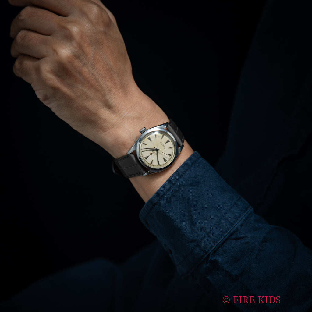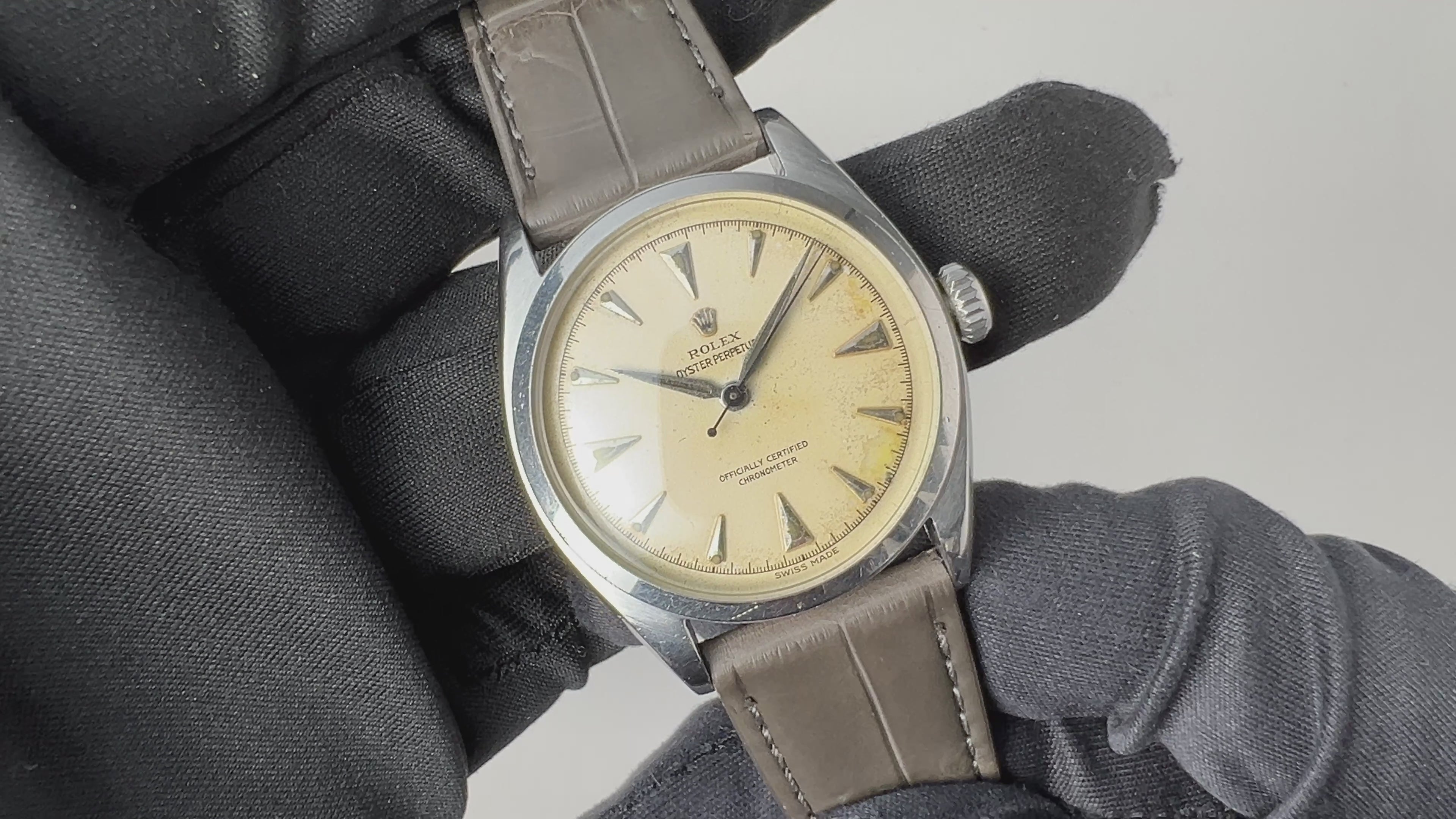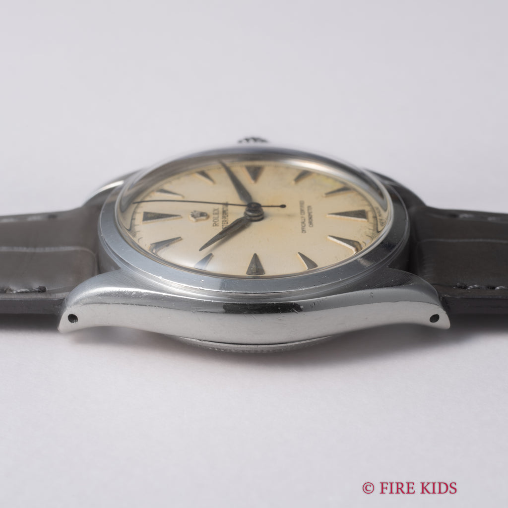 セミバブルバックはバブルバックより製造期間が短く、希少なモデルです。後年の両方向巻き上げの機械を搭載したモデルに比べて機械、裏蓋が膨らんでいるのでヴィンテージ感をより感じて頂けますし、腕の乗り心地も良いです。ダイヤルは楔インデックスダイヤルで、エイジングも進んでブラウンカラーになってきてます。。ケースは小傷はありますが大きなダメージはありません。手巻きや針回しはスムーズです。リューズはやはり製造期間が短いスーパーオイスターリューズです。ベルトはファイアーキッズオリジナルのクロコダイル革ベルトが取り付けられています。