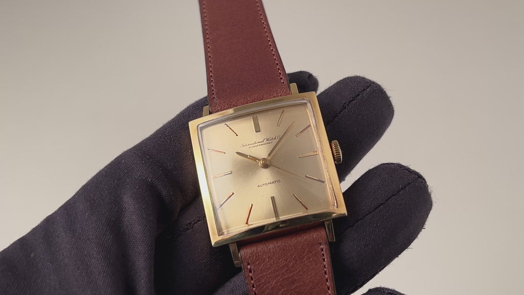 インターナショナルウォッチカンパニー 1970年製の18金無垢 スクエアモデルです。やや大振りな角型ケースにペラトン式自動巻きCal.854Bを搭載しています。ダイヤルには若干の経年変化がありますが、雰囲気を損なうようなものではありません。ケースは程よく厚みがあり、大きなダメージのない状態です。手巻きや針回しの操作はスムースです。ベルトはファイアーキッズオリジナルのブッテーロレザーベルトを合わせています。