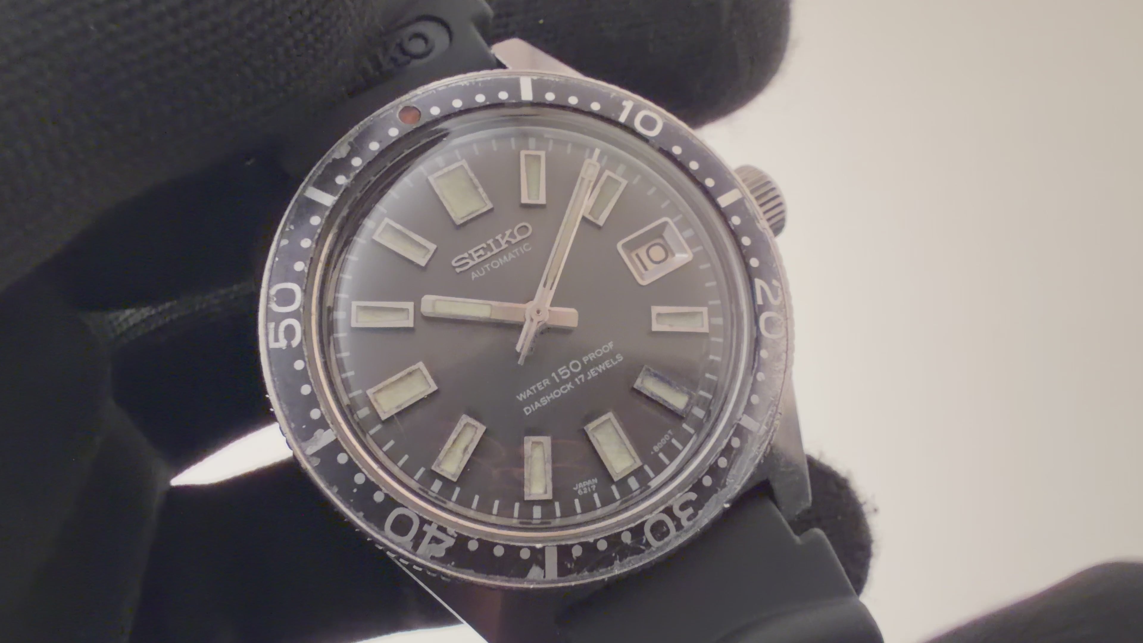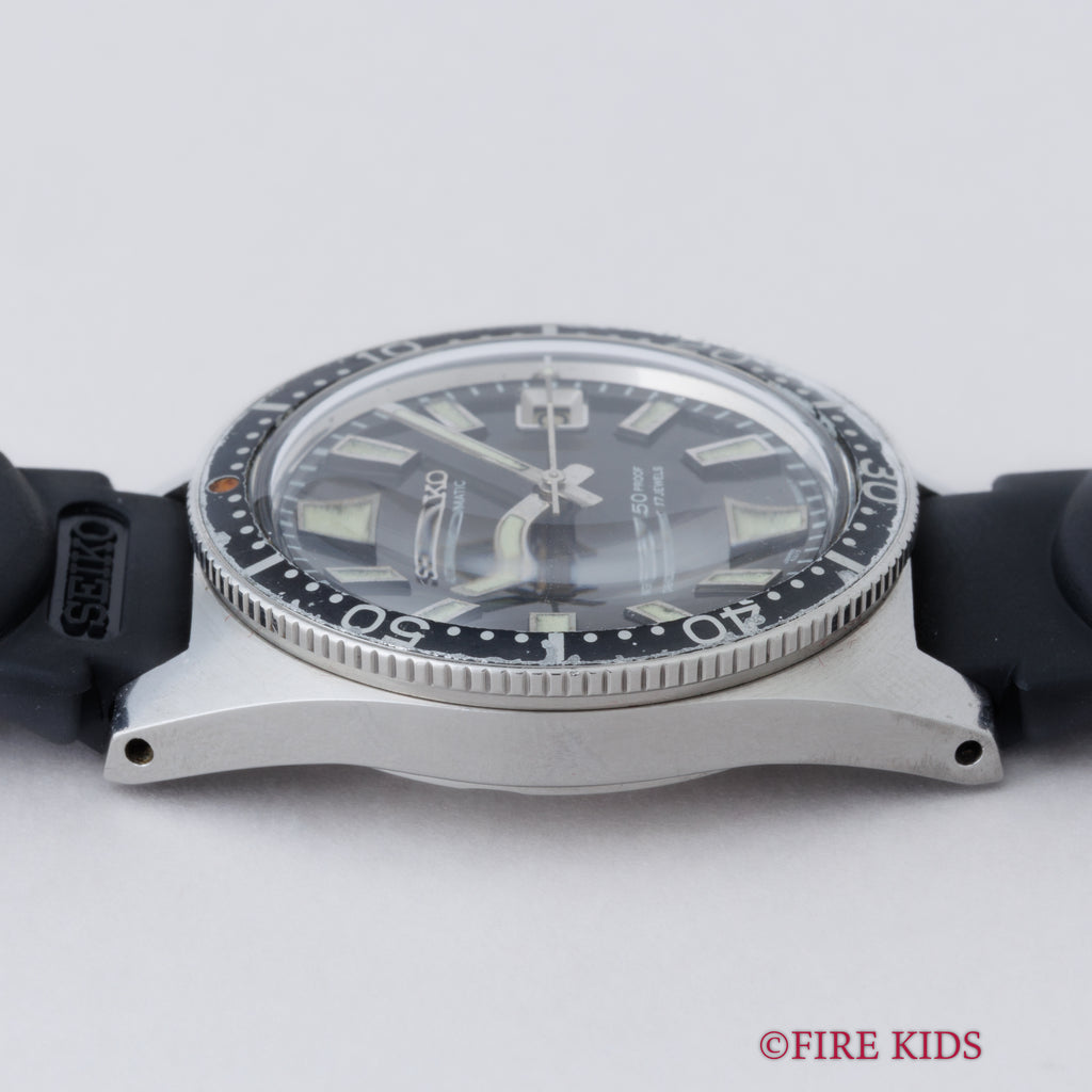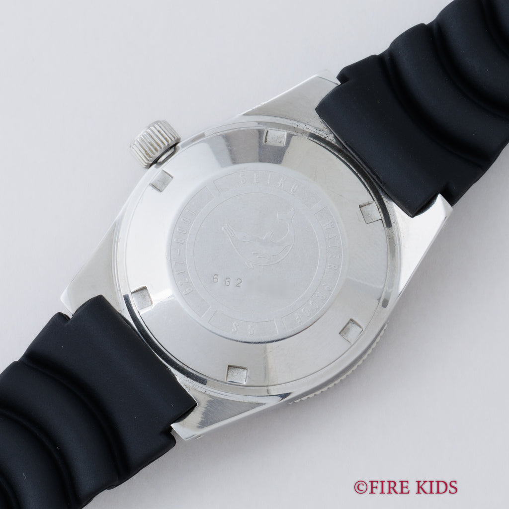 セイコー 150mダイバーファーストモデル後期型 寅さんモデル 1966年製 Ref.6217-8001 自動巻 62MASの入荷になります。国産初のダイバーズウオッチ150mダイバーファーストモデルの後期型で映画「男はつらいよ」シリーズで使用されていたモデルです。ムーブメントは自動巻きのCal.6217Aを搭載。カレンダーの早送り機能付きで手巻きはできないタイプです。 ケースは小傷がありますが大きなダメージはありません。 裏蓋にはイルカマークもしっかり残っています。 針回し、ベゼルの操作はスムースです。 ベルトは純正のラバーベルトが取り付けられています。