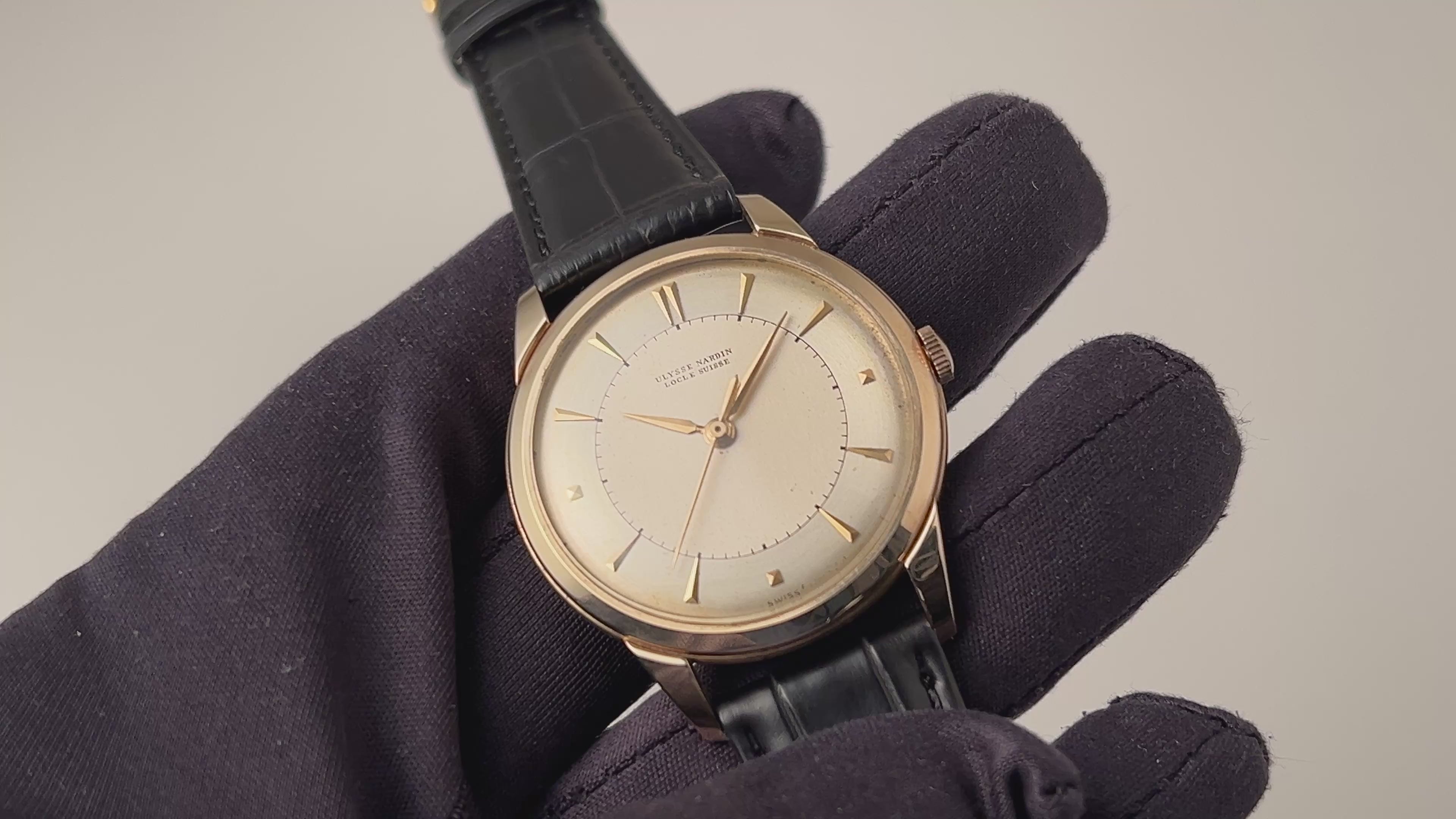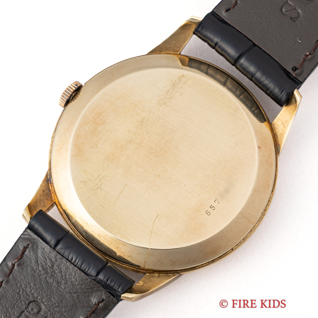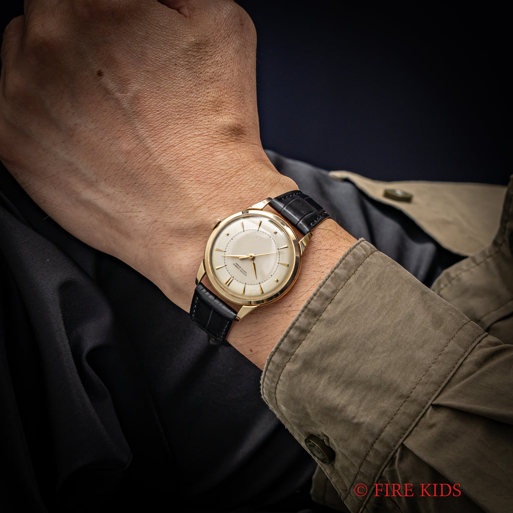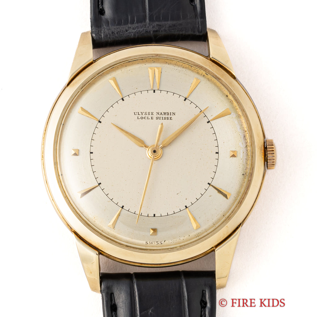 ユリスナルダン 14金無垢イエローゴールドケース 1950年代製 手巻 Cal.531 センターセコンドの入荷になります。14金無垢ケースでアップライドのクサビインデックスとピラミッドインデックスの組み合わせが上品な1本です。文字盤は表面の劣化が見られますがシミ等無く良い雰囲気になっています。ケースは小傷が見られますが大きなダメージはありません。ムーブメントは出車式のセンターセコンド手巻きCal.531で流石ナルダンという仕上がりです。手巻きや針回しの操作はスムースです。ベルトはファイアーキッズオリジナルのクロコダイル革ベルトが取り付けられています。