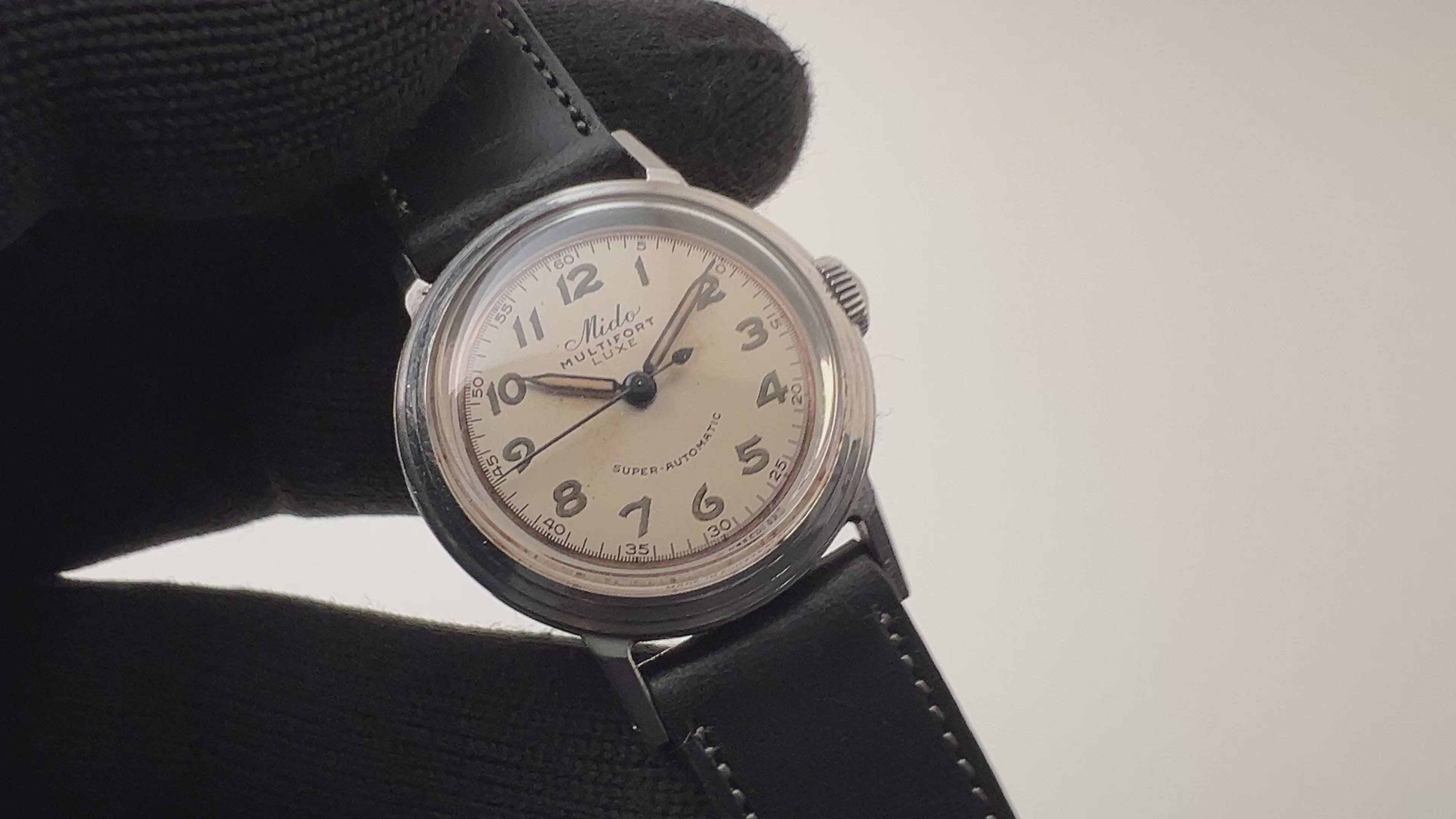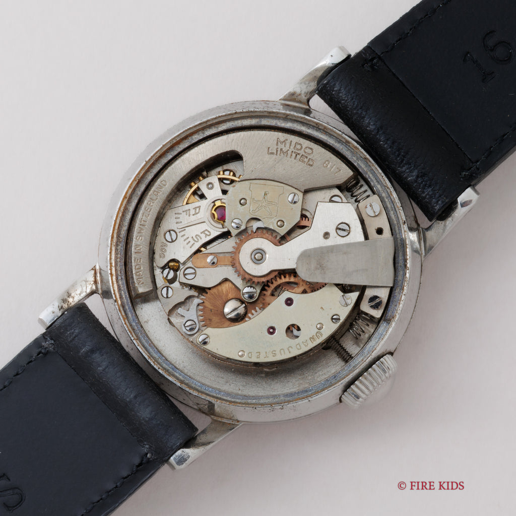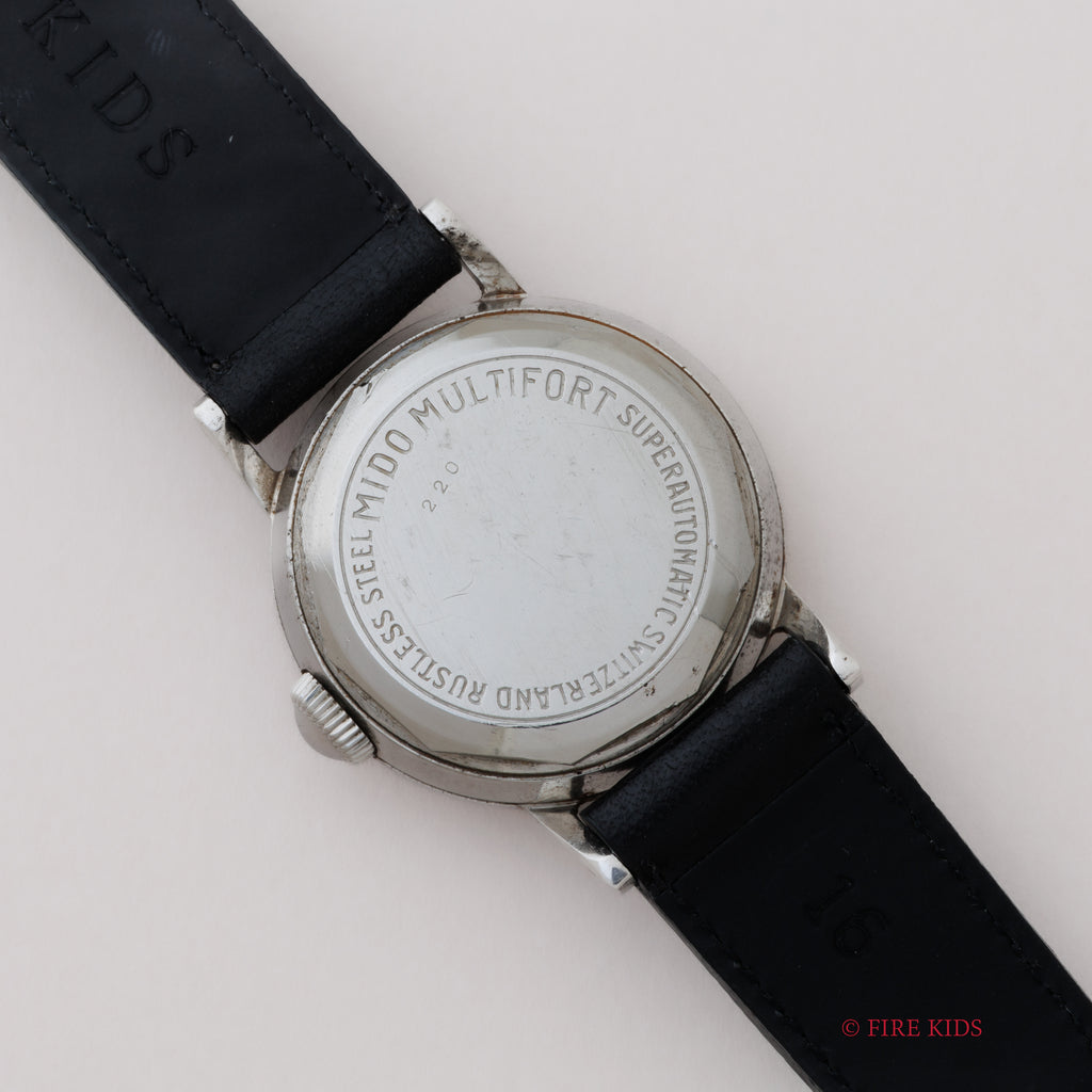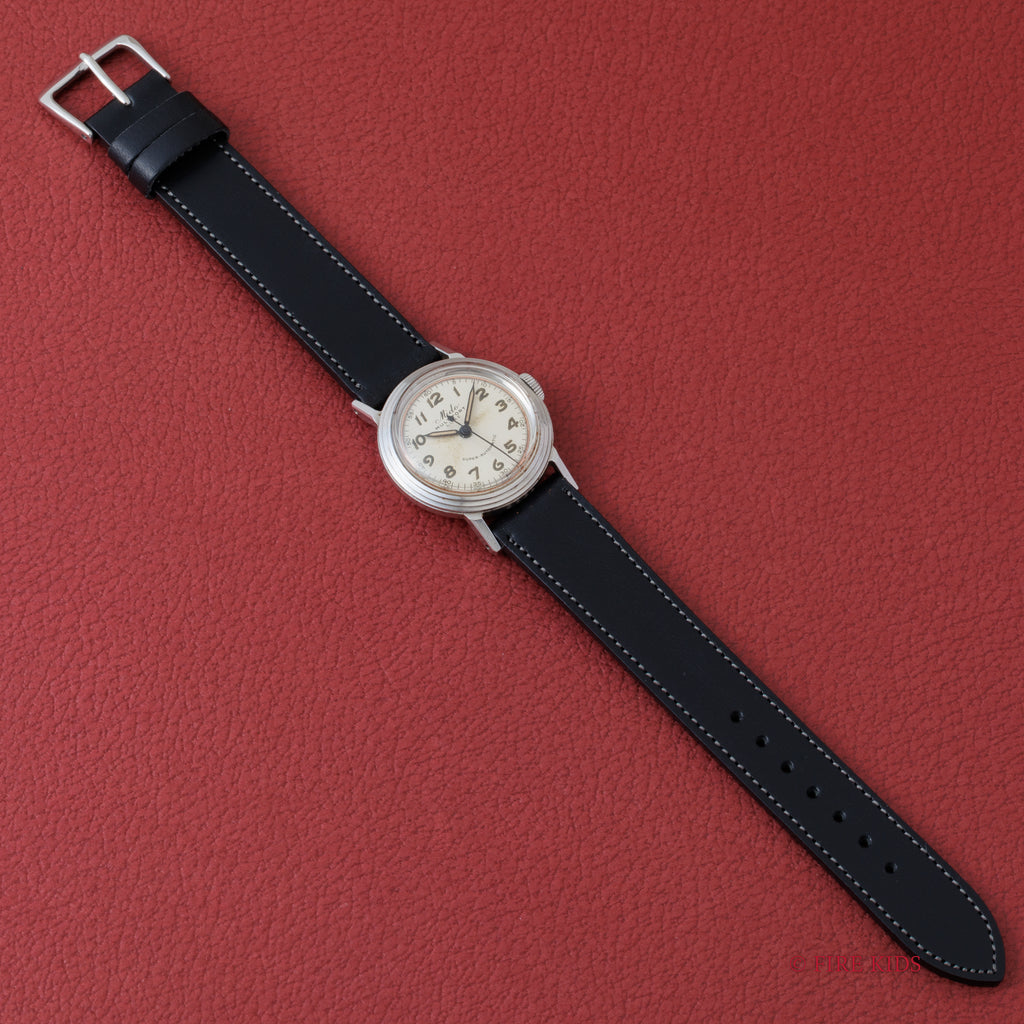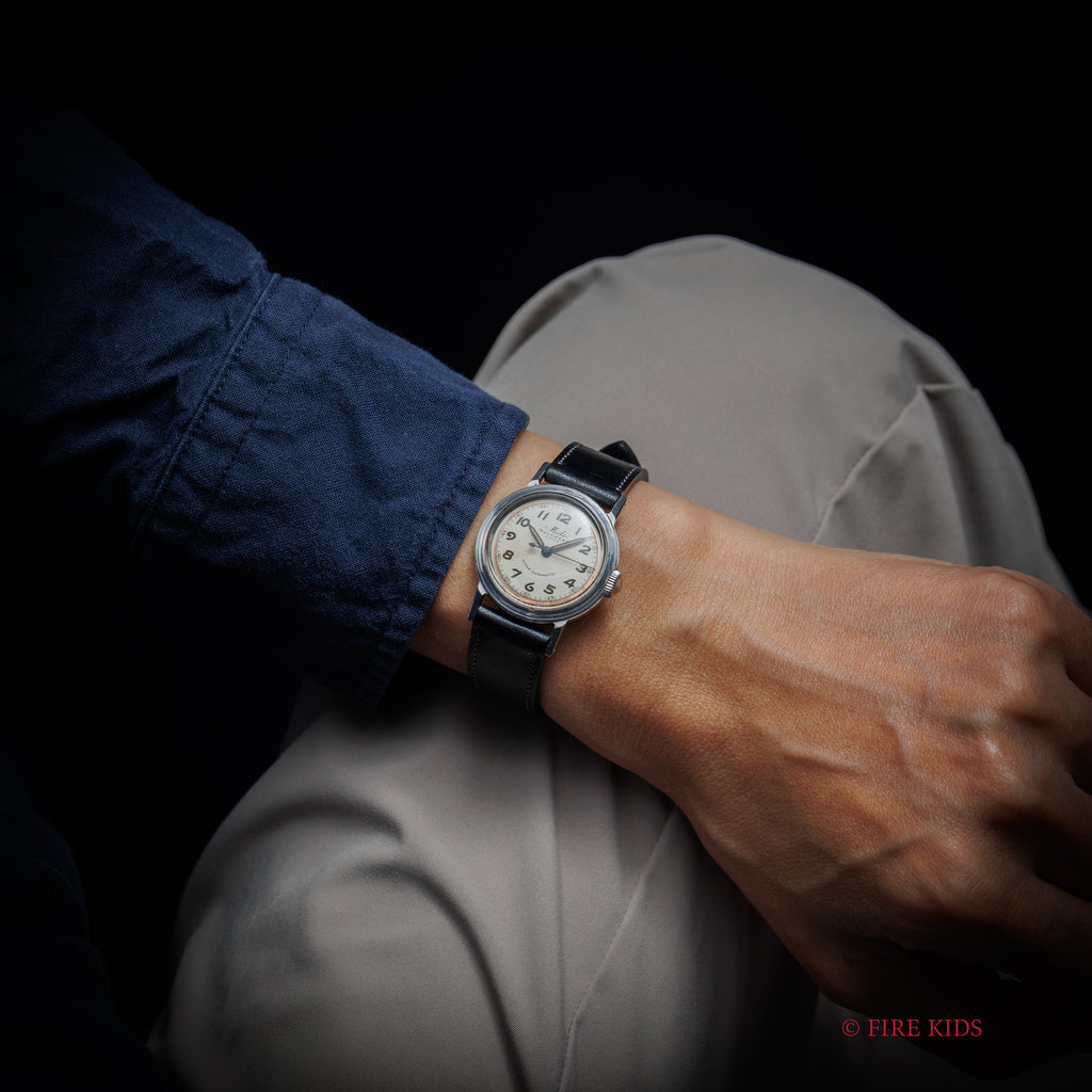 ミドーマルチフォート ハーフローター式オートマチック1940年代後半製です。ラウンドケースにアラビア夜光インデックスの組み合わせです。6時位置に「SUPER-AUTOMATIC」のプリントが示す通り、当時としては画期的な手巻き併用のバンパー式自動巻きモデルになります。夜光のエイジングが非常に渋い雰囲気を出しています。ムーブメントはハーフローター採用の自動巻きでCal.817を搭載。ケースは小傷がありますが大きなダメージはなくエッジもしっかりとしています。ベルトはファイアーキッズオリジナルのブッテーロレザーレザーベルトを装着しています。
